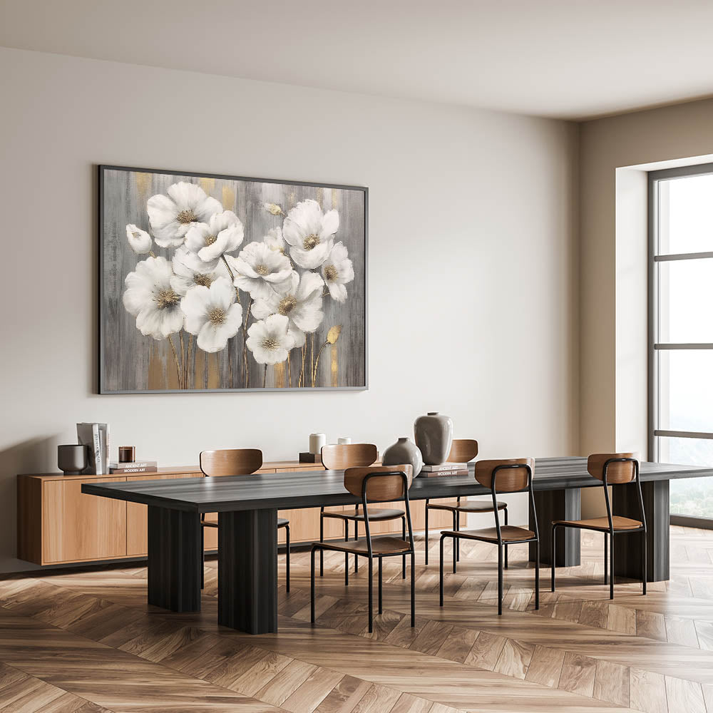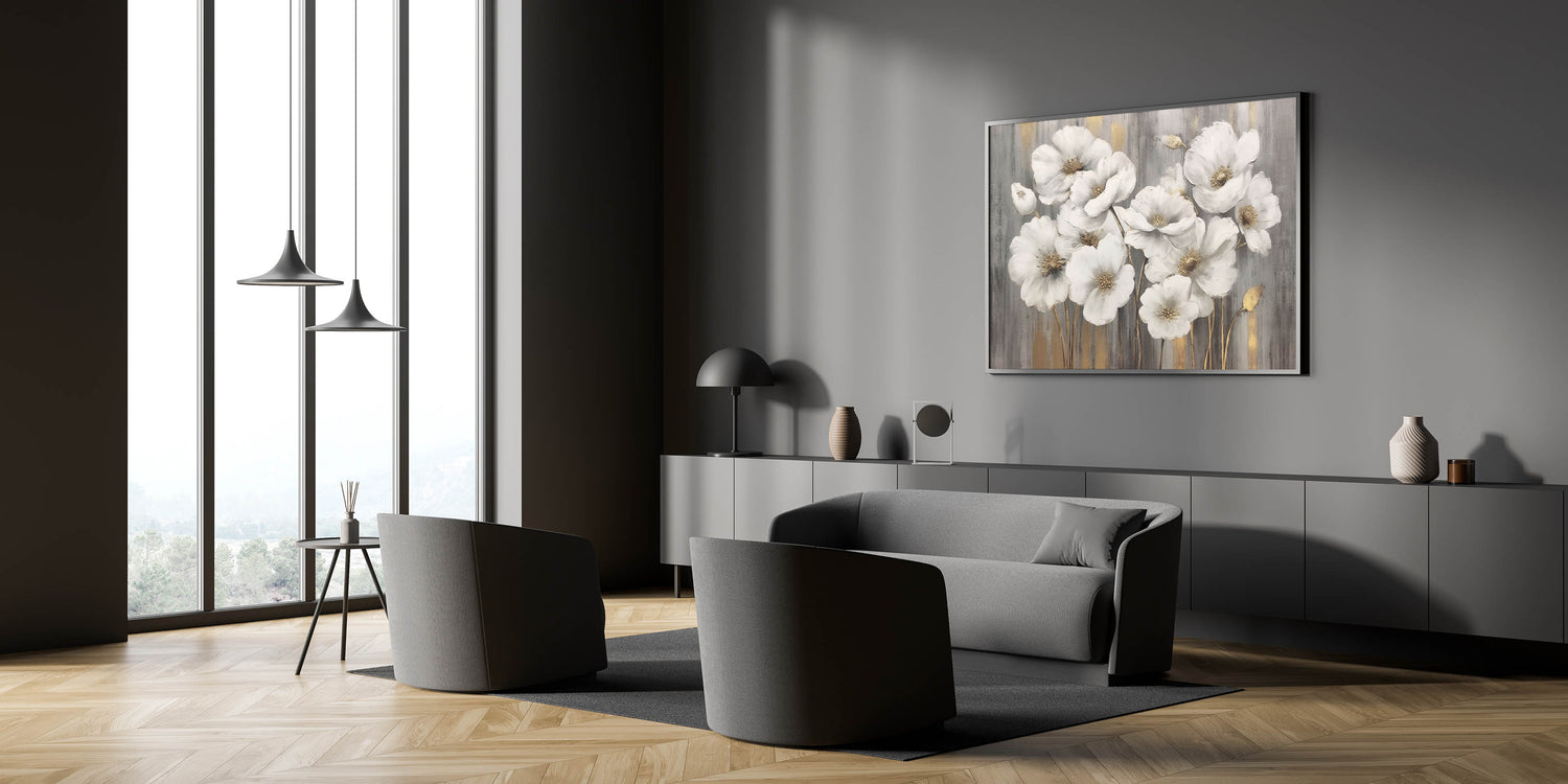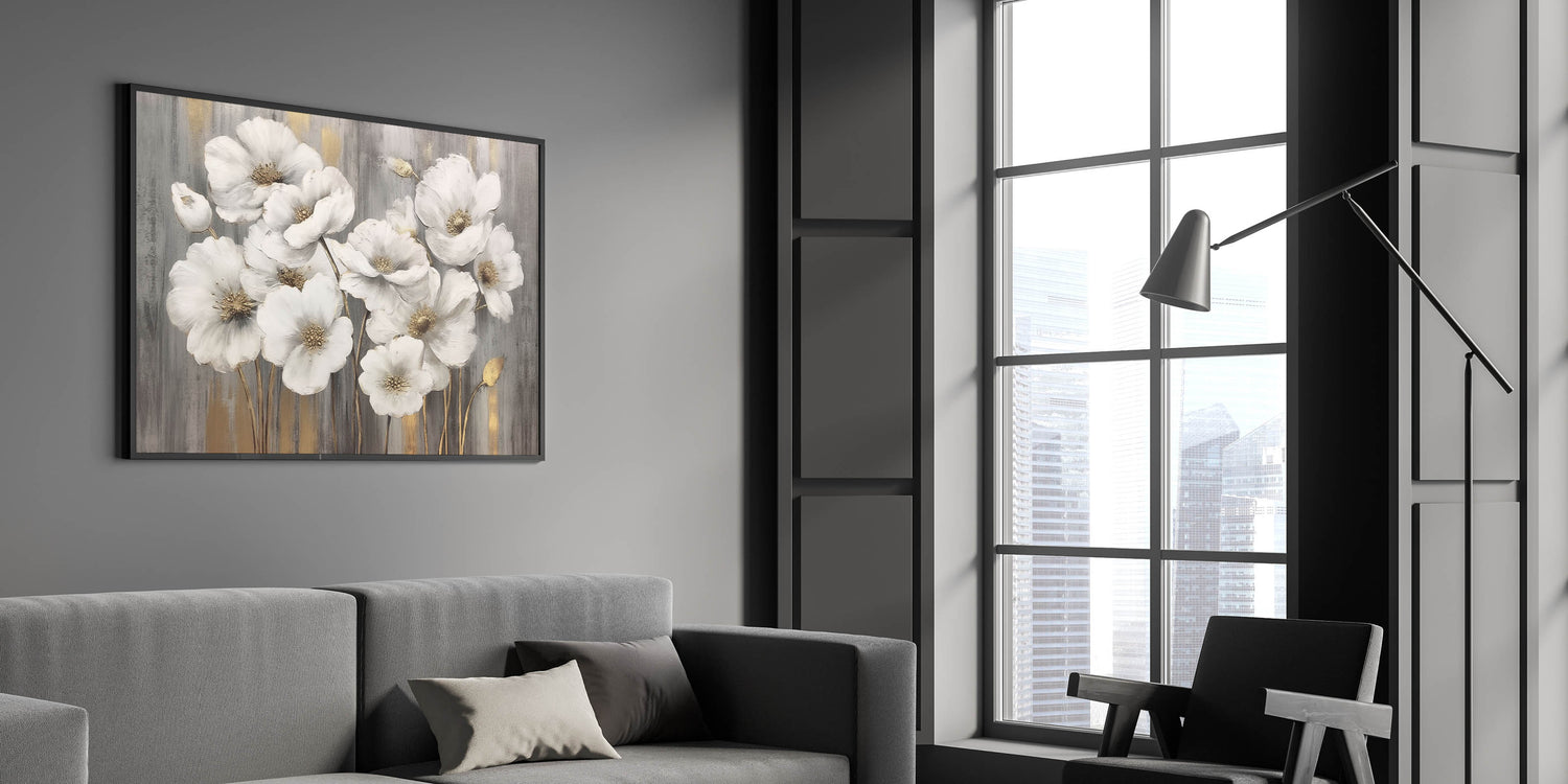 Introduce an air of sophistication to your home with this exquisite floral artwork. Featuring a delicate bouquet of white flowers, this piece is beautifully accented with gold touches that add a luxurious feel. The flowers are set against a soft gray background with subtle textures, creating a harmonious blend of elegance and modernity. This artwork is perfect for those looking to add a touch of class and serenity to their living space.
