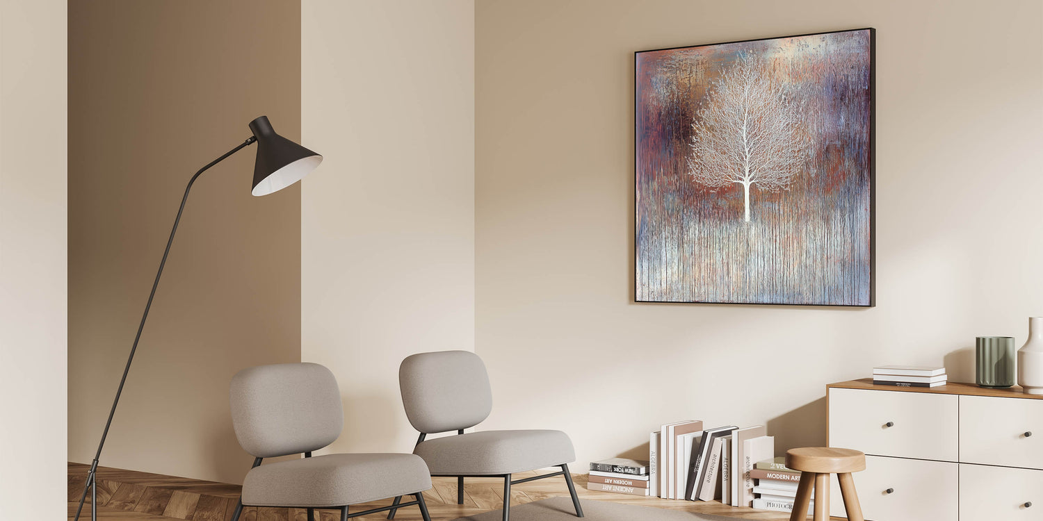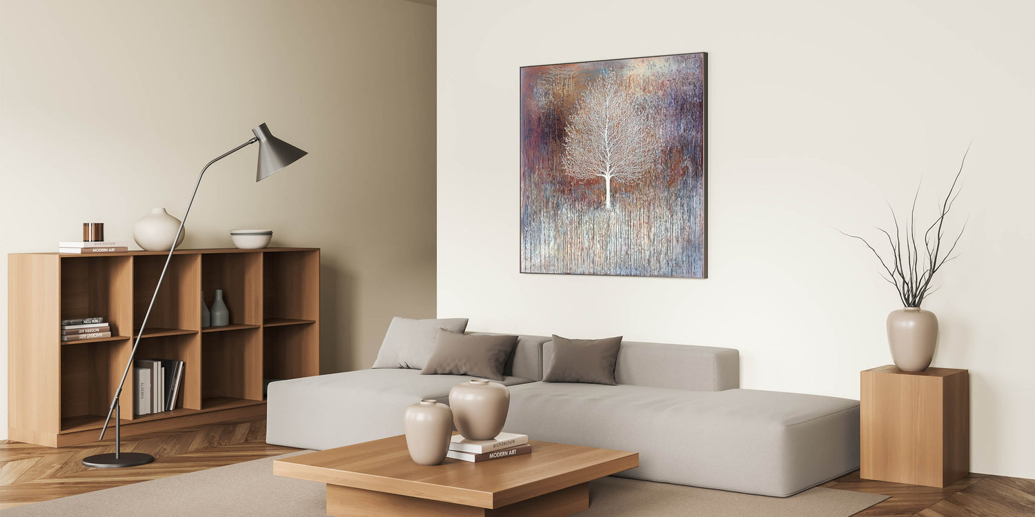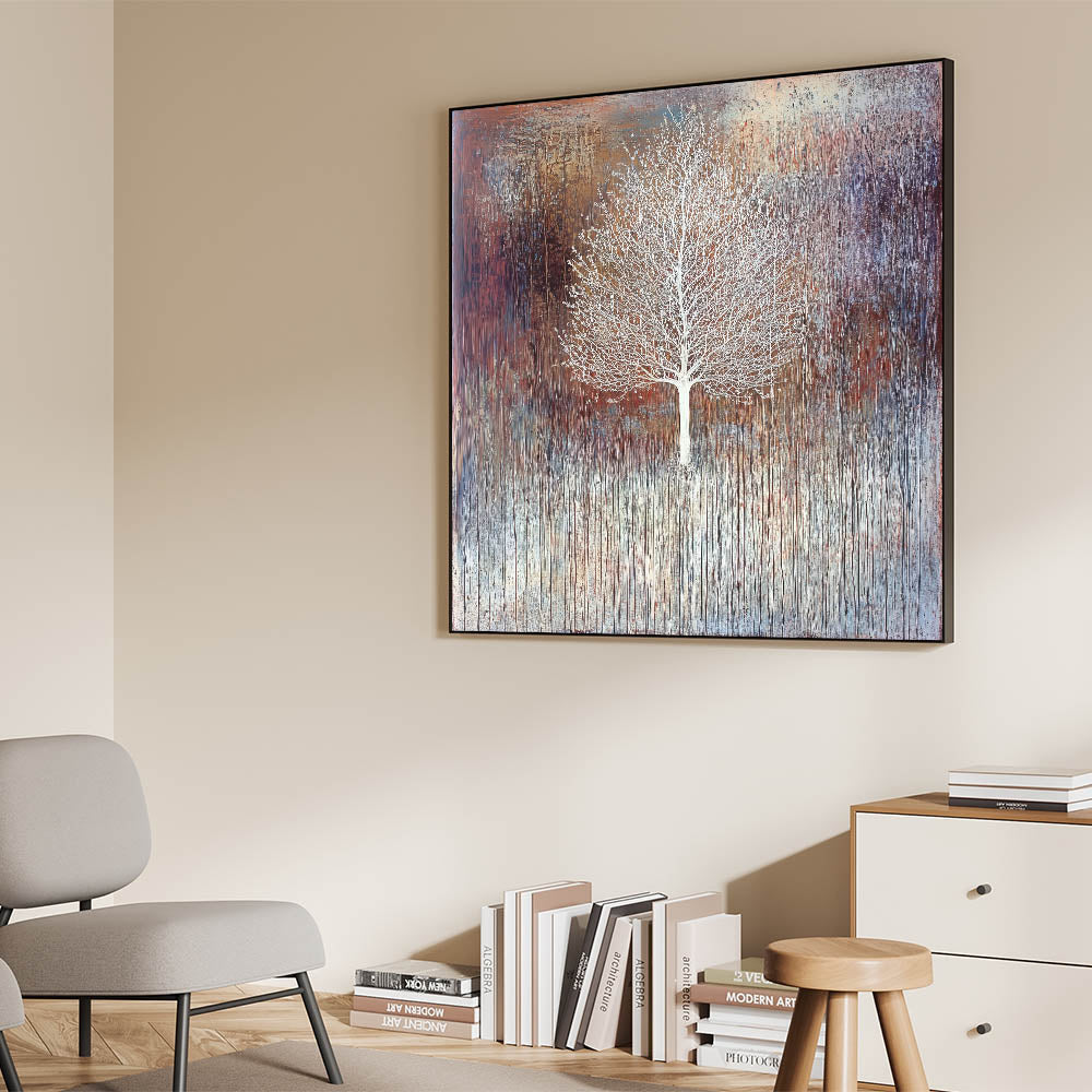 - Vibrant Design: The artwork captures a stunning interplay of white branches with deep hues of brown, orange, and silver tones.