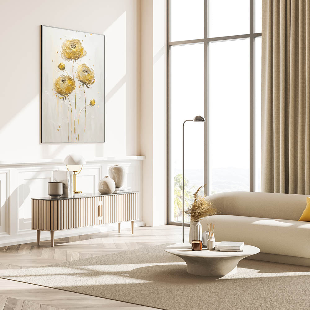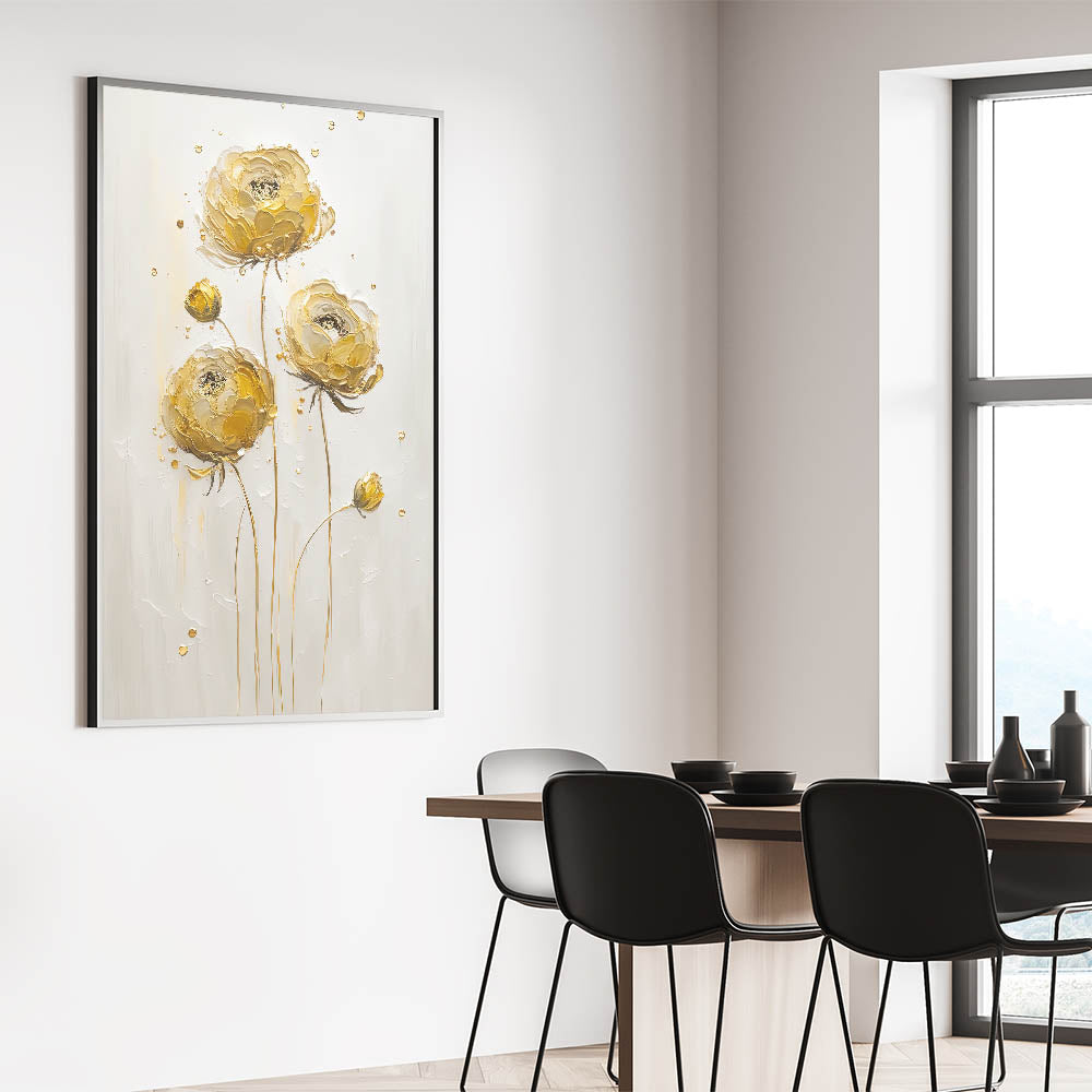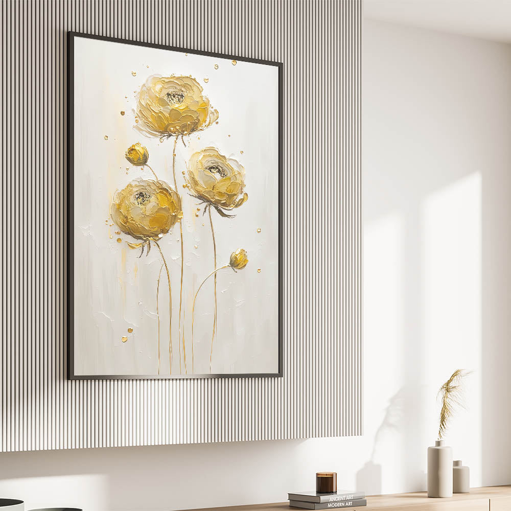 Introduce a touch of sophistication to your decor with this exquisite abstract floral art, featuring elegant yellow ranunculus blooms. The textured petals in warm golden tones stand out against a neutral background, exuding both simplicity and luxury. This timeless piece is perfect for adding warmth and charm to modern or traditional interiors.
