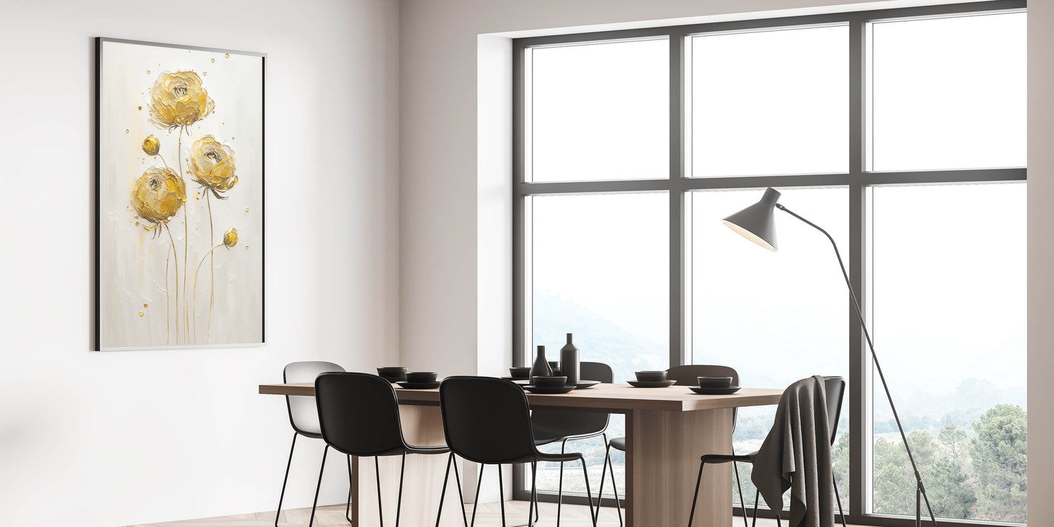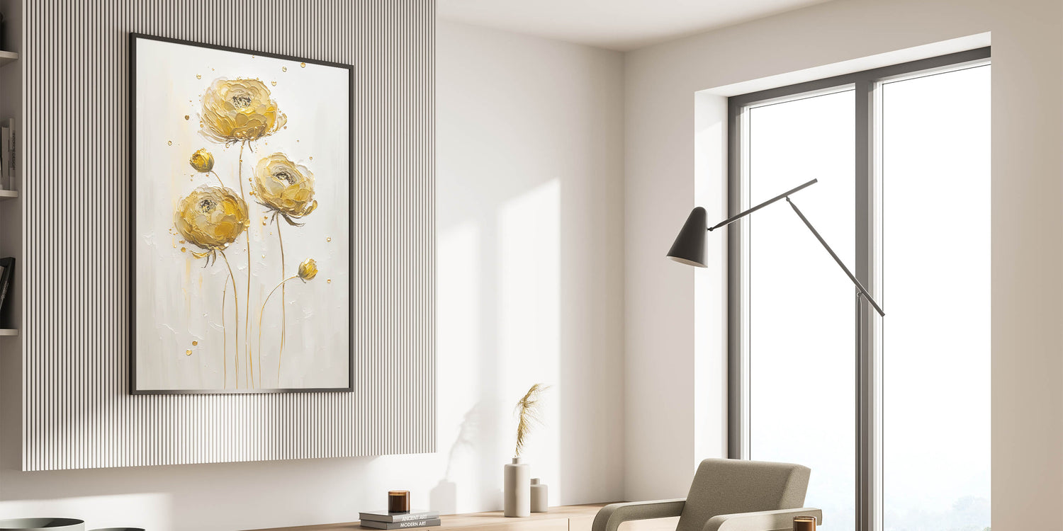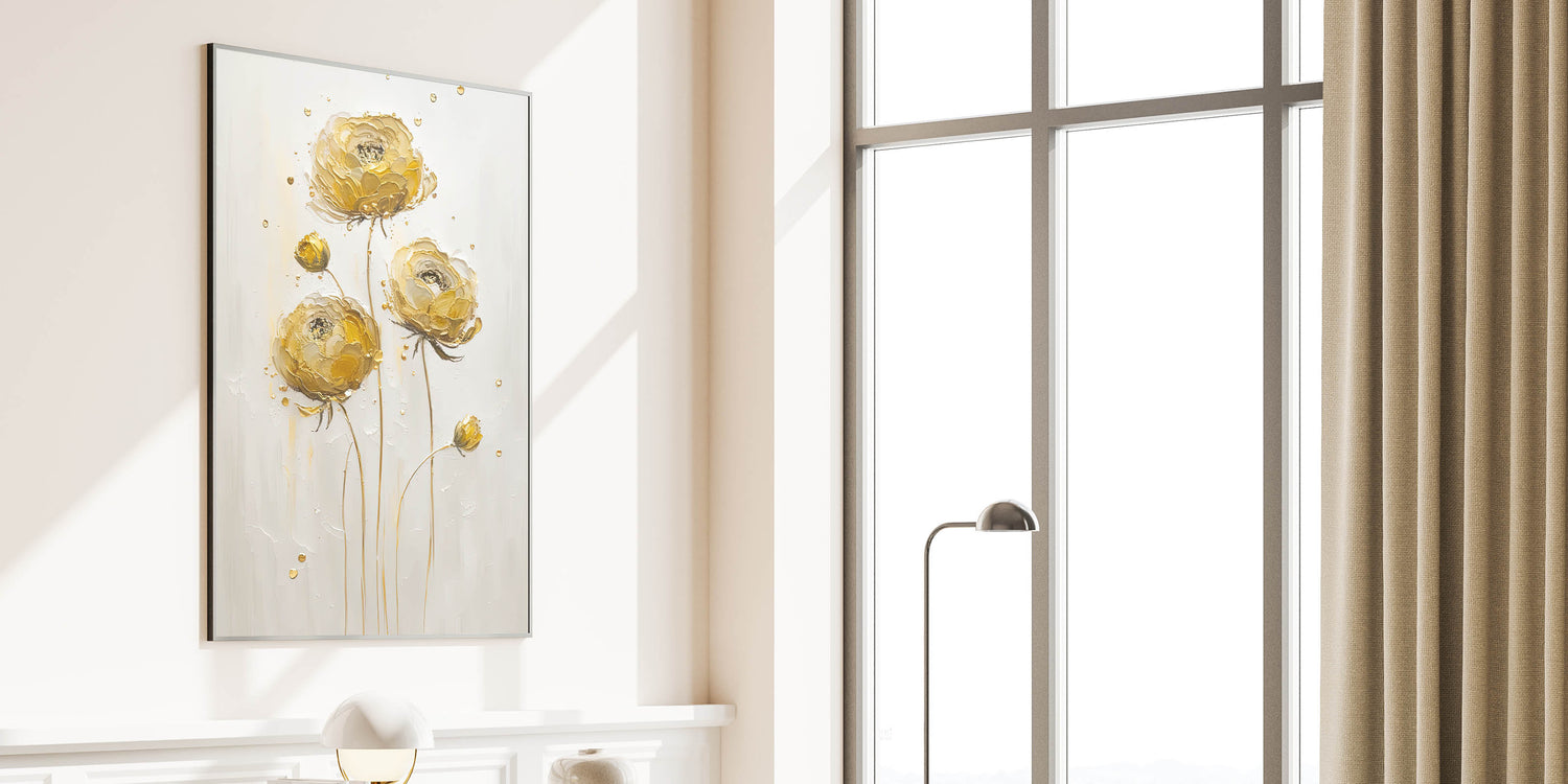 Introduce a touch of sophistication to your decor with this exquisite abstract floral art, featuring elegant yellow ranunculus blooms. The textured petals in warm golden tones stand out against a neutral background, exuding both simplicity and luxury. This timeless piece is perfect for adding warmth and charm to modern or traditional interiors.