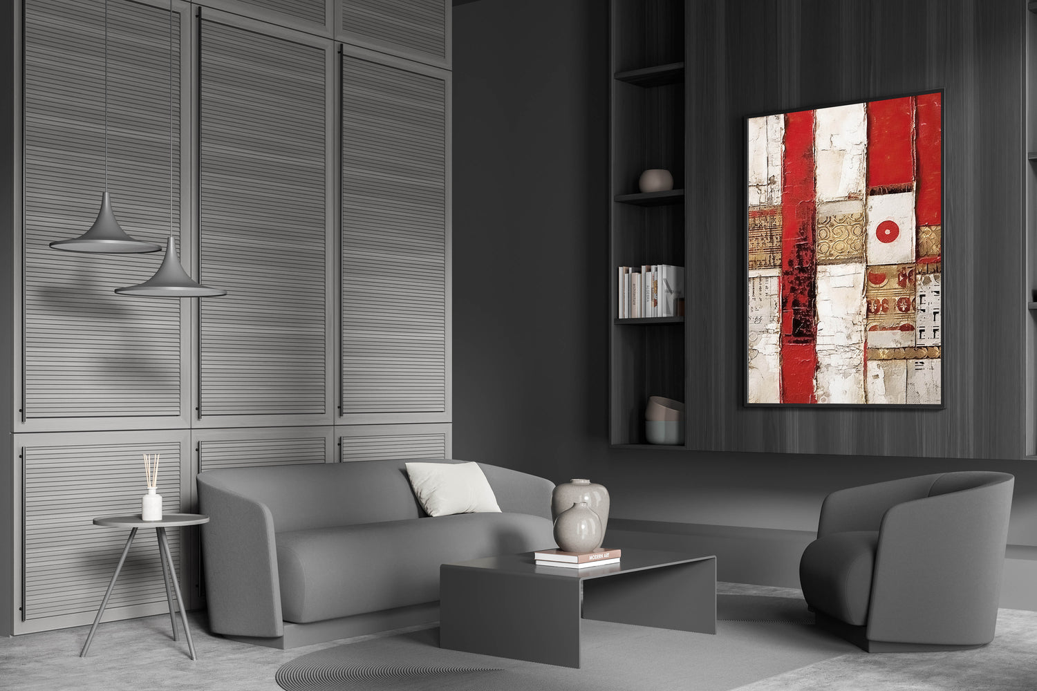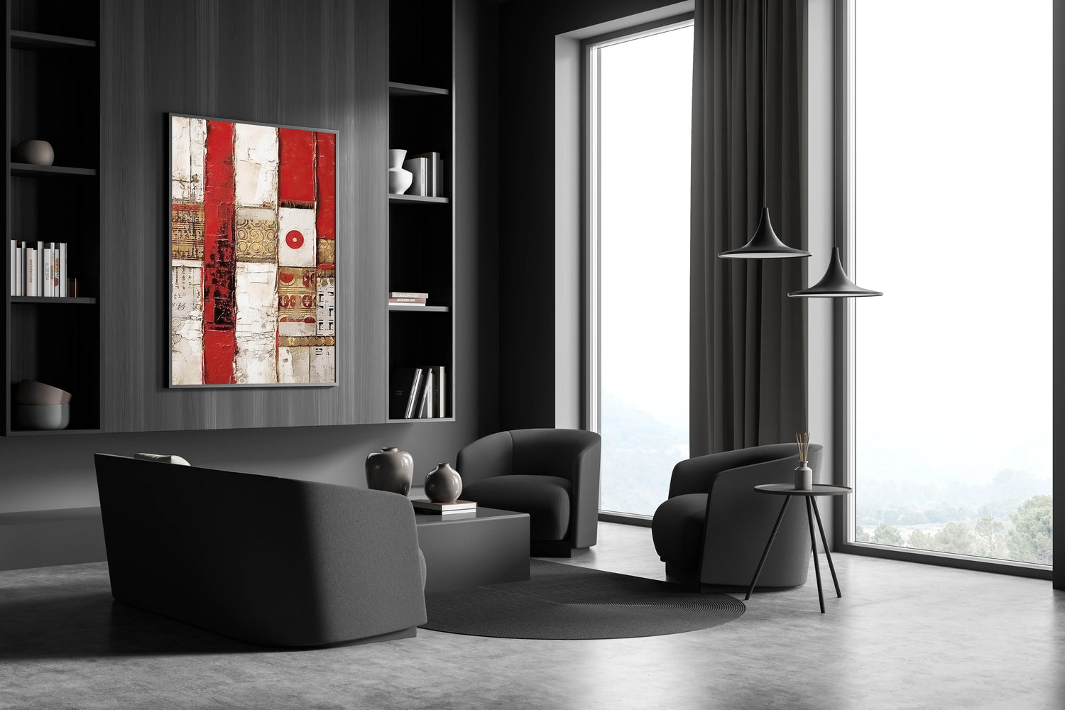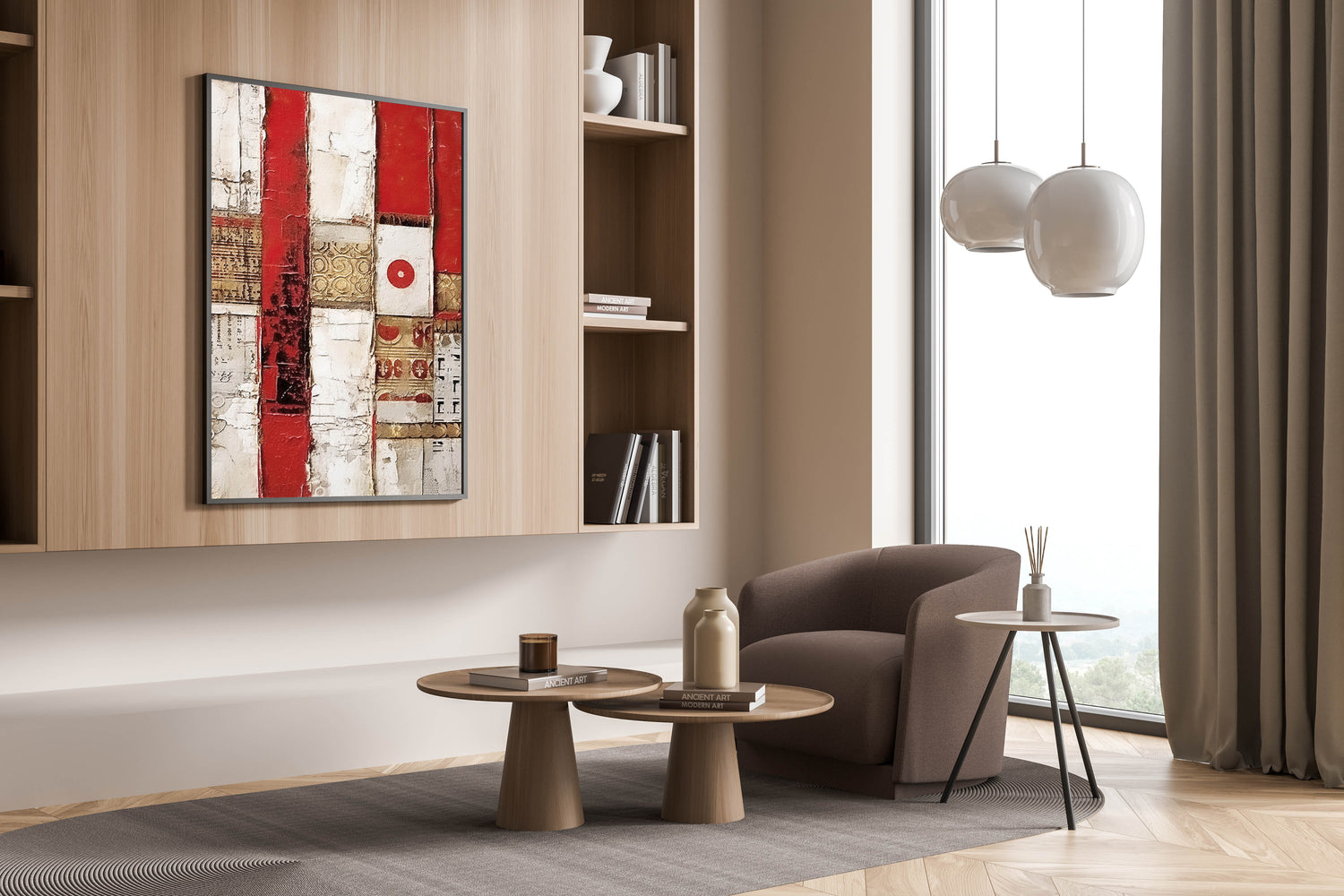 Ignite your space with the bold and dynamic energy of this Fiery Passion Abstract Strokes Art. This striking piece features vibrant red and gold accents set against a textured white and beige background, creating a captivating mix of color and form. Perfect for contemporary or eclectic interiors, this artwork showcases unique strokes and geometric patterns that add warmth and a touch of drama to any room.