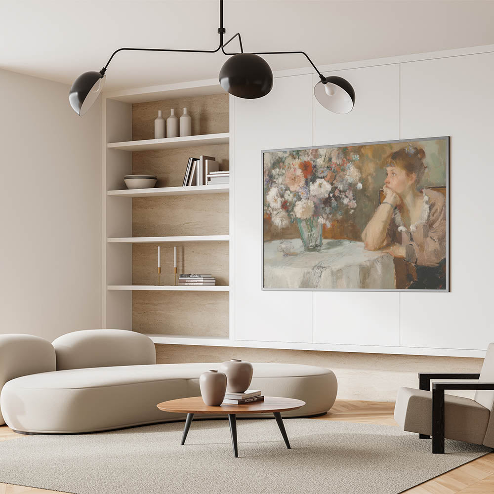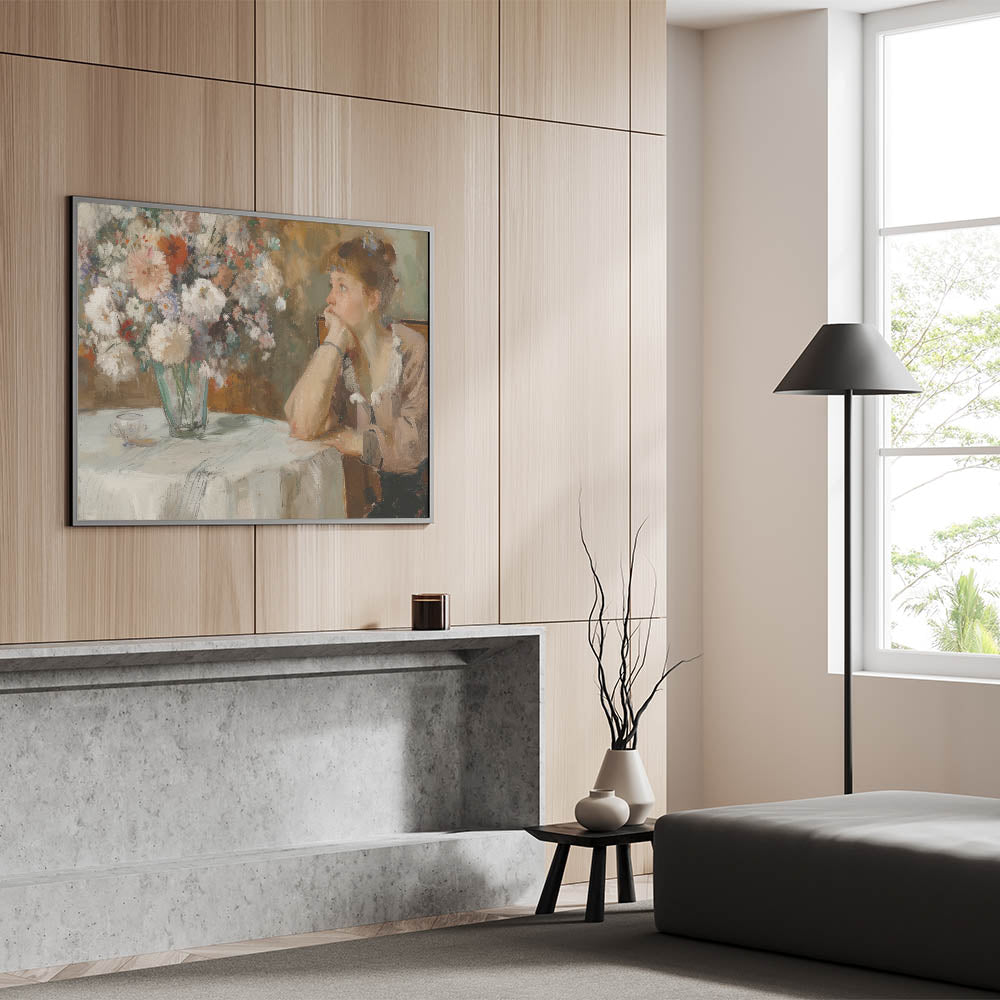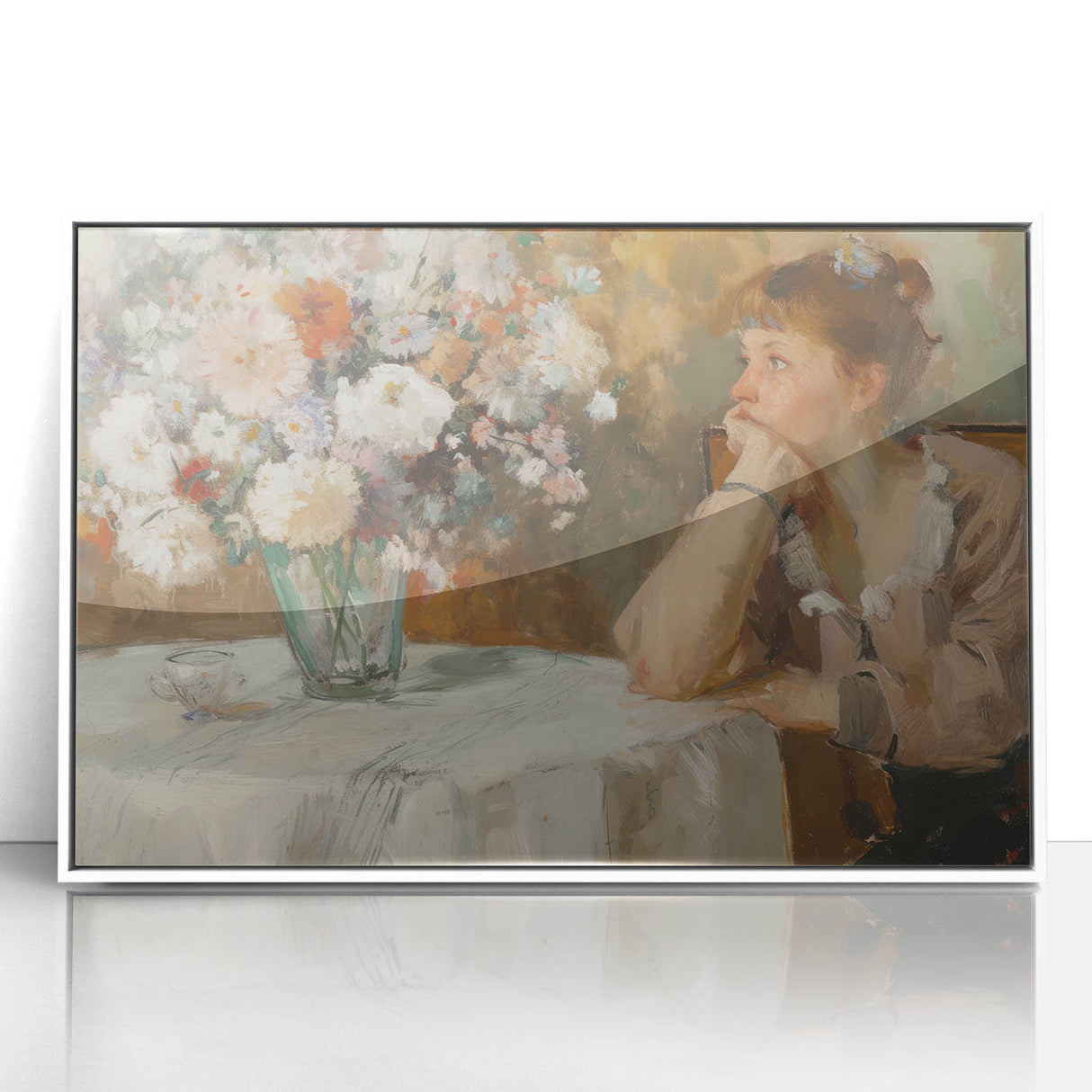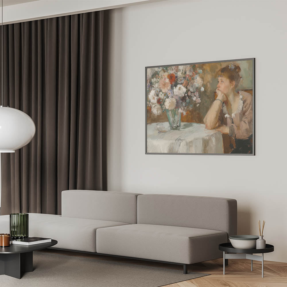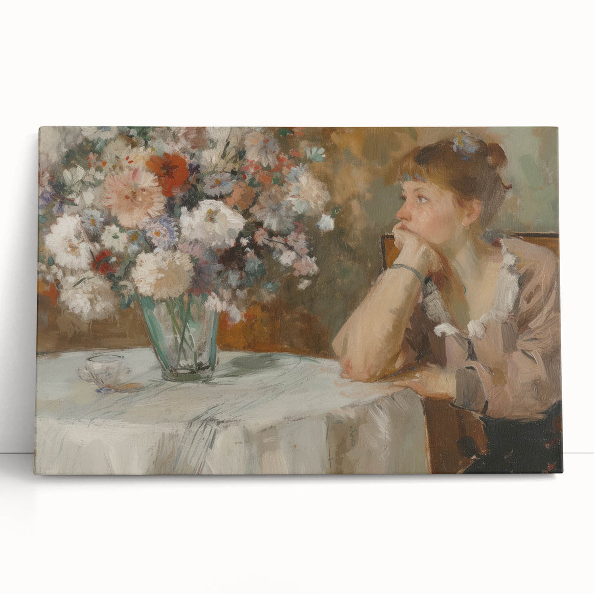 This figurative abstract art captures a woman in quiet contemplation beside a vibrant floral arrangement. The soft brushstrokes and rich palette of warm tones lend an intimate and reflective quality to the piece. The lush bouquet of flowers adds a lively contrast to the thoughtful mood, making this stunning figurative canvas print a beautiful focal point in any room.