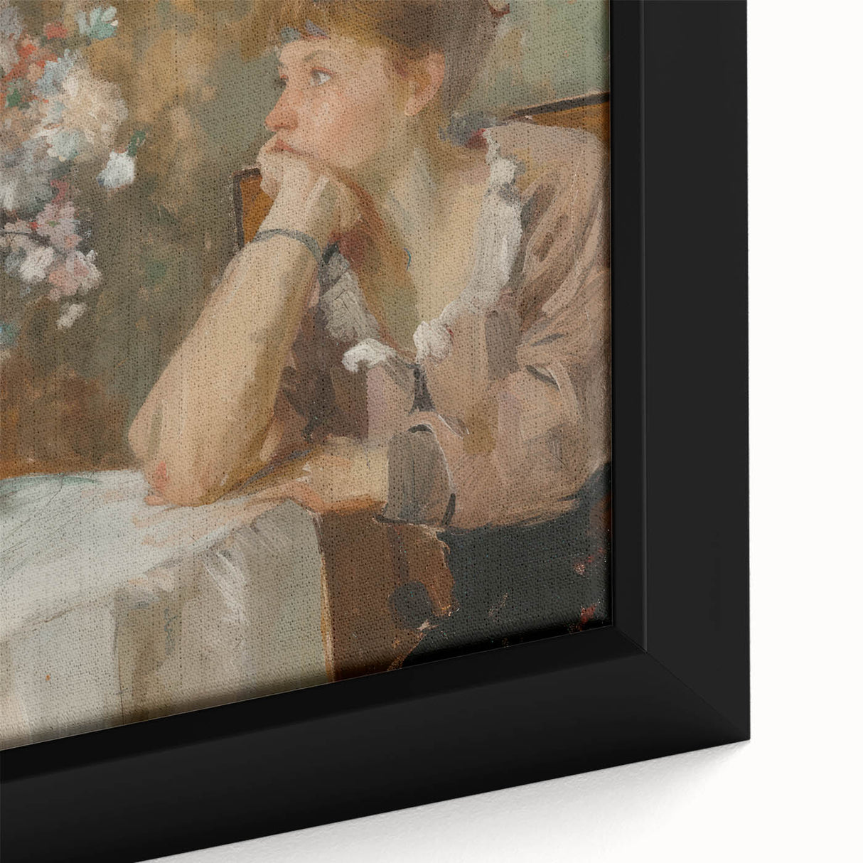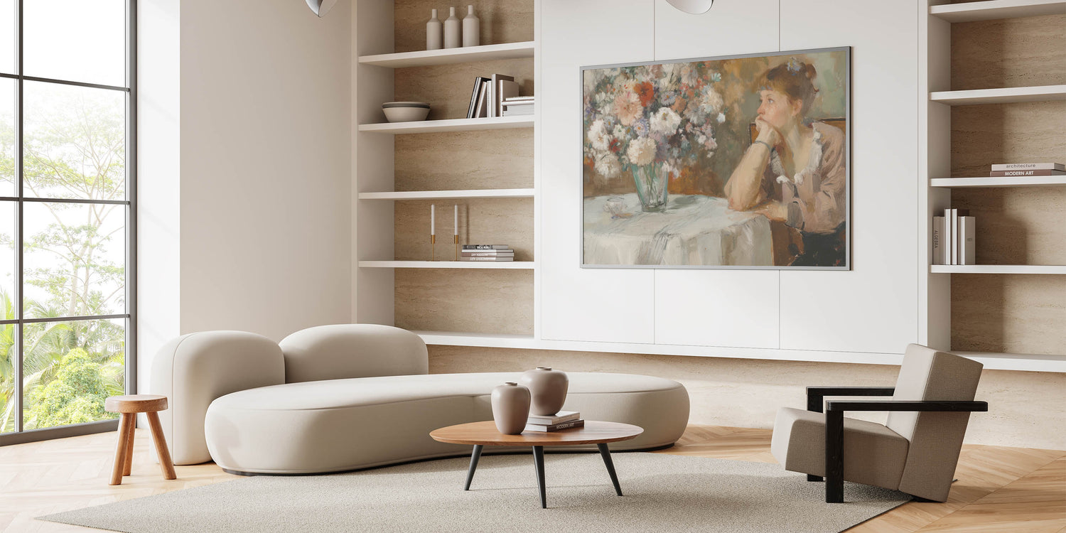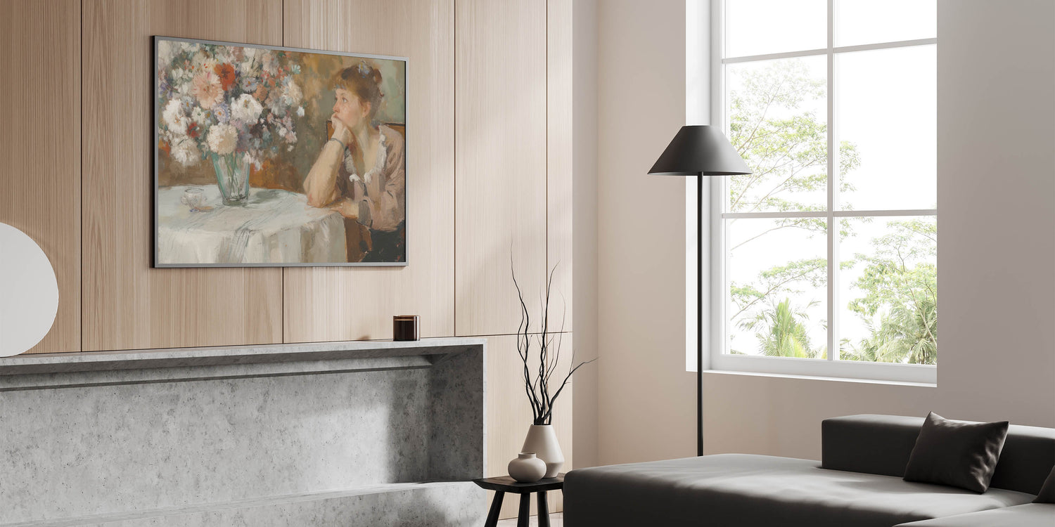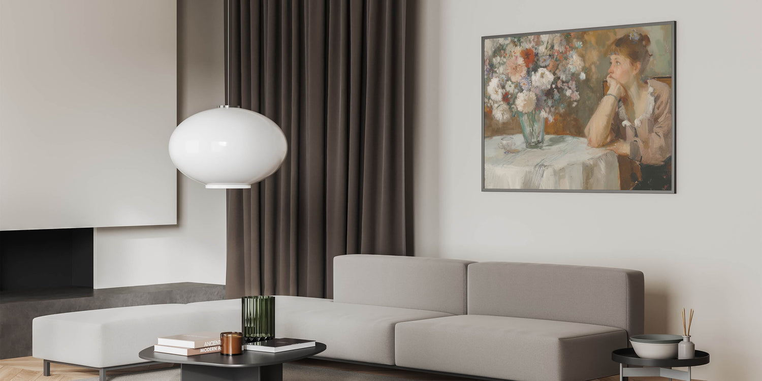This figurative abstract art captures a woman in quiet contemplation beside a vibrant floral arrangement. The soft brushstrokes and rich palette of warm tones lend an intimate and reflective quality to the piece. The lush bouquet of flowers adds a lively contrast to the thoughtful mood, making this stunning figurative canvas print a beautiful focal point in any room.