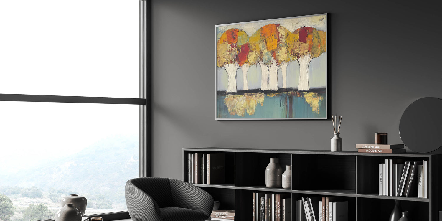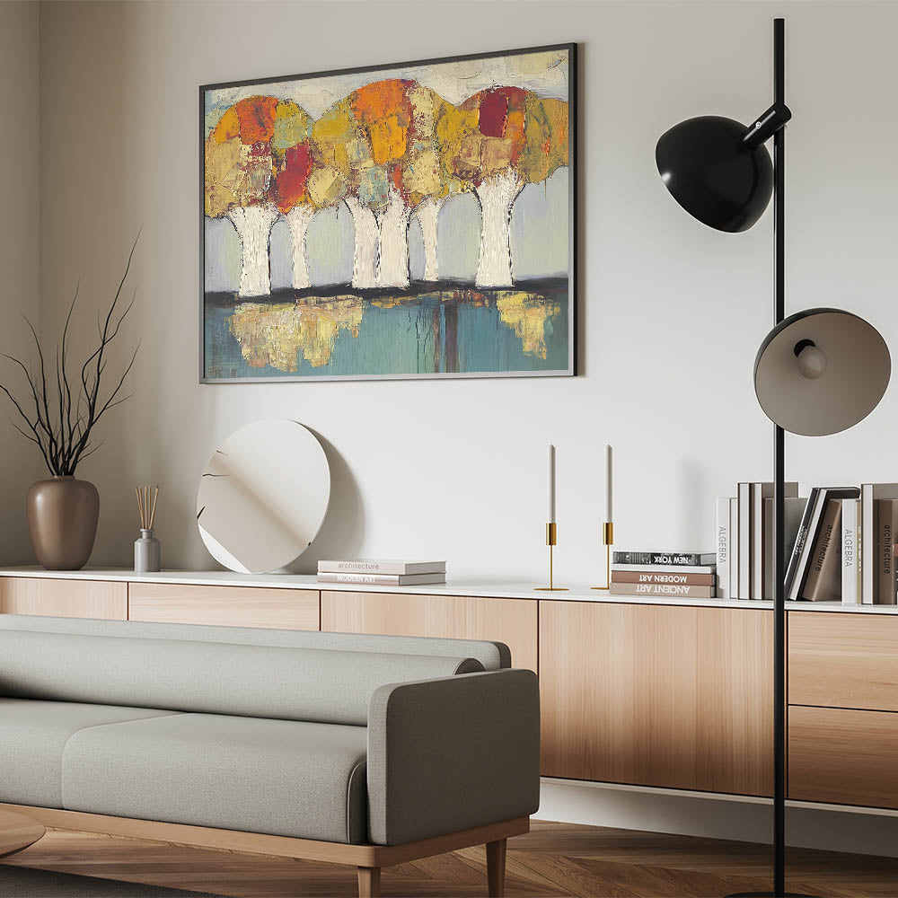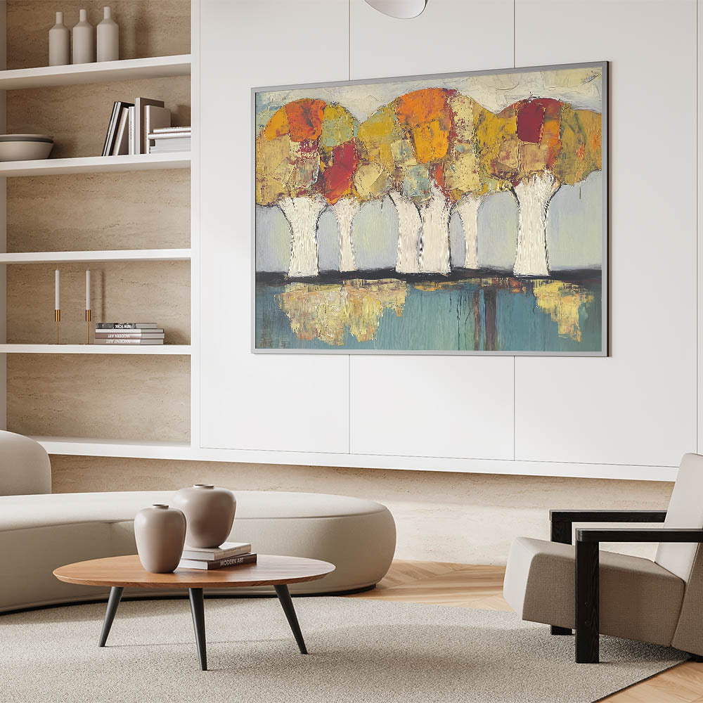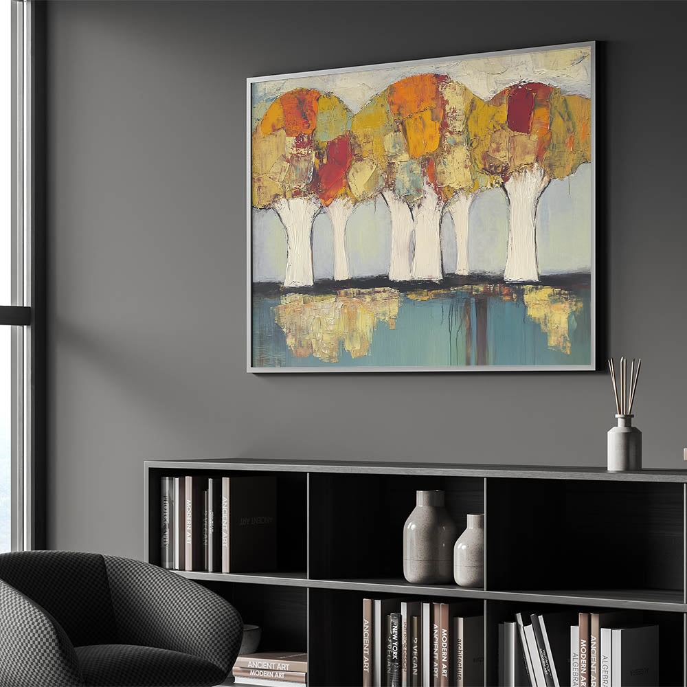 Add a burst of color and natural elegance to your decor with this stunning abstract floral artwork featuring five vibrant trees reflected in calm waters. The textured design combines warm tones of red, orange, and yellow with hints of green and blue, creating a harmonious and eye-catching composition.