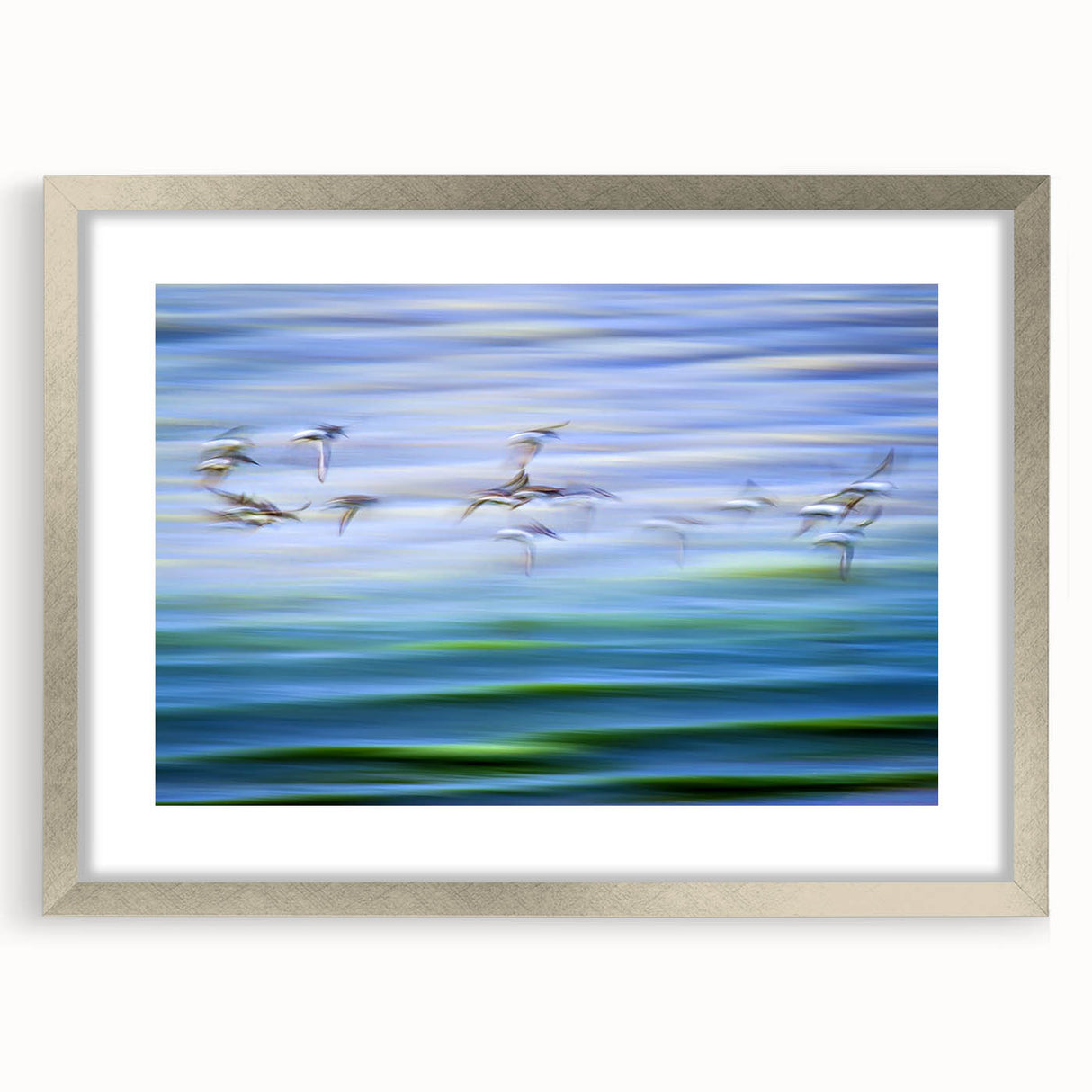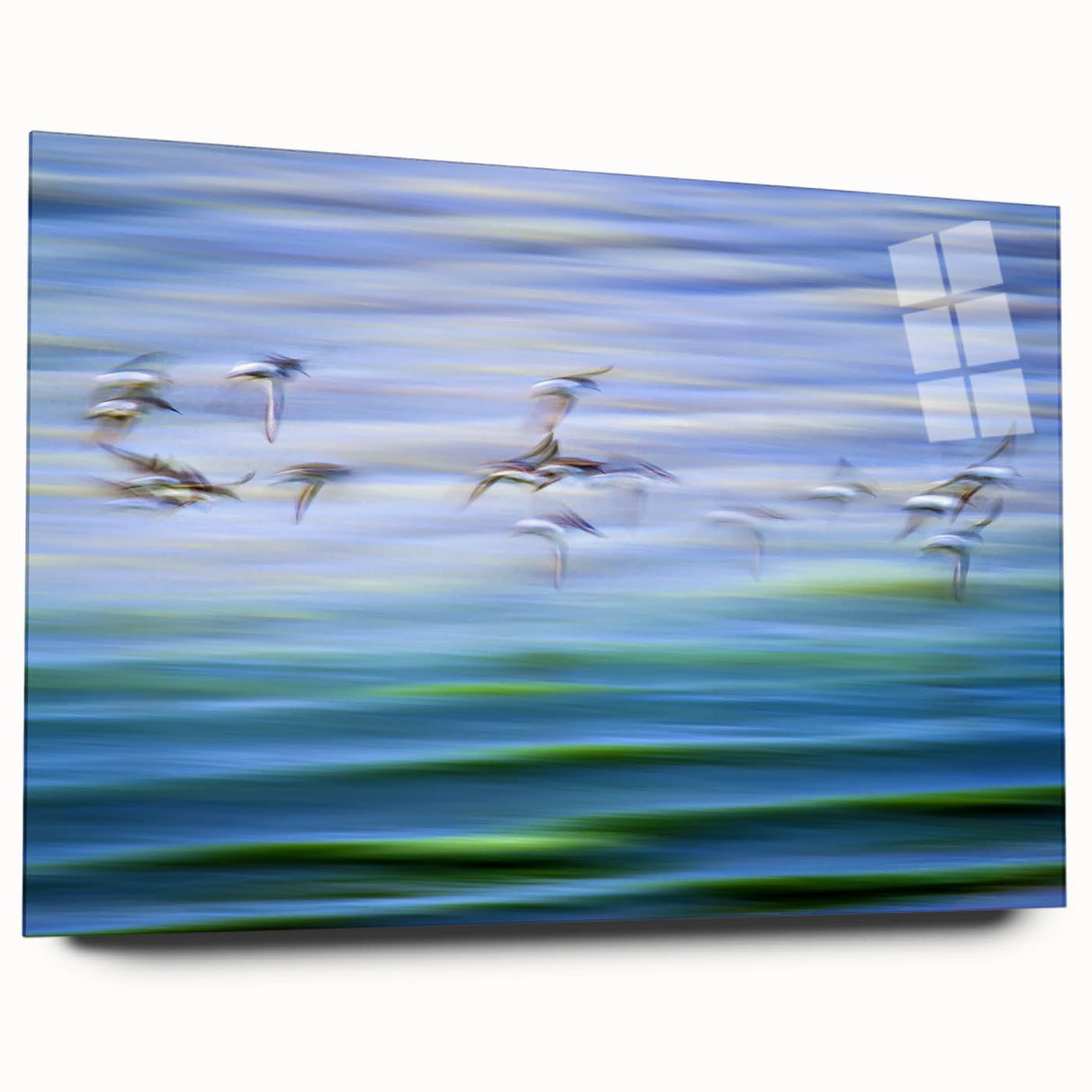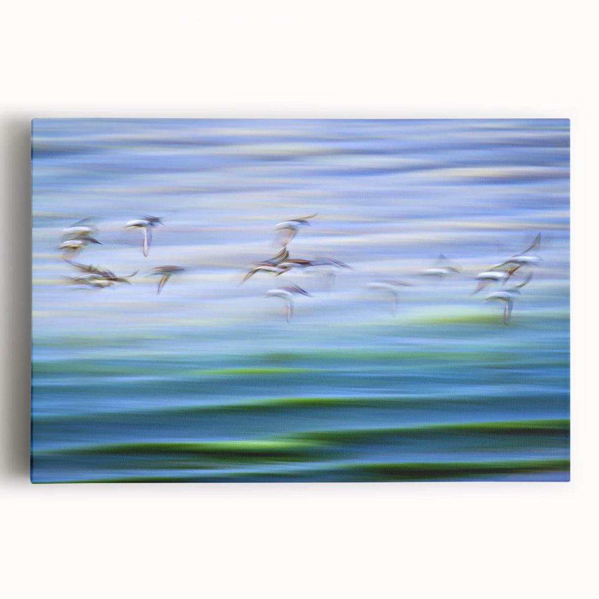 Immerse yourself in the serene beauty of nature with this fine art photography canvas print. Capturing a flock of birds gliding gracefully over shimmering waters, this piece uses a soft motion blur effect to create a dreamy, impressionistic feel. The gentle interplay of blues, teals, and greens enhances the tranquil and ethereal atmosphere.