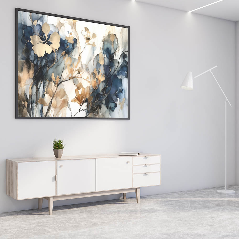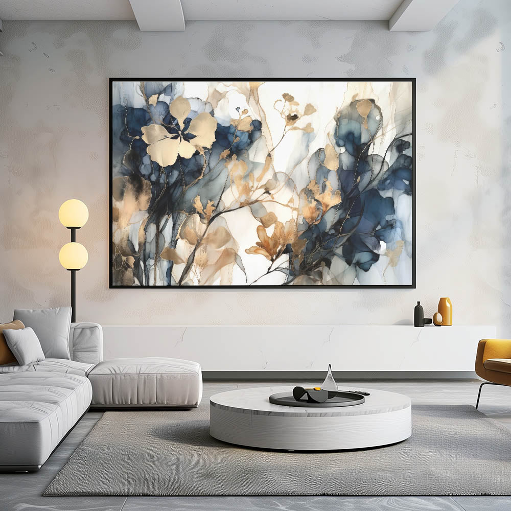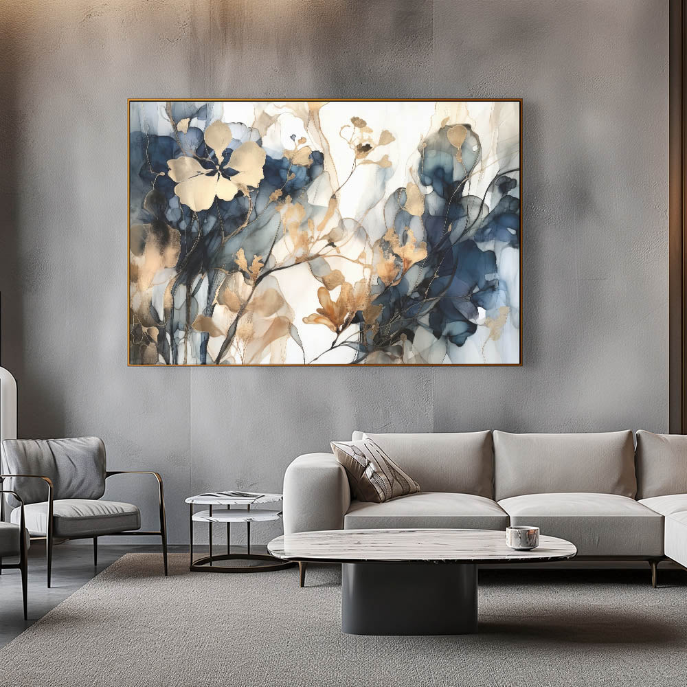 Elevate your space with this exquisite floral abstract canvas art, featuring an elegant blend of deep blue and warm gold tones. This sophisticated piece captures delicate botanical patterns that bring a sense of depth and tranquility to any room. The fluid, layered design creates a mesmerizing effect, perfect for enhancing modern and contemporary decor.