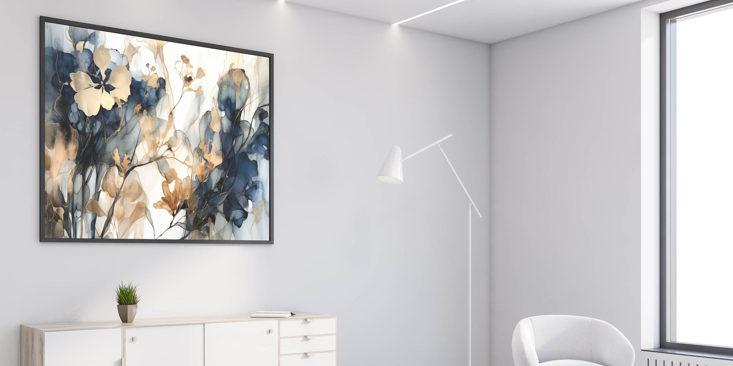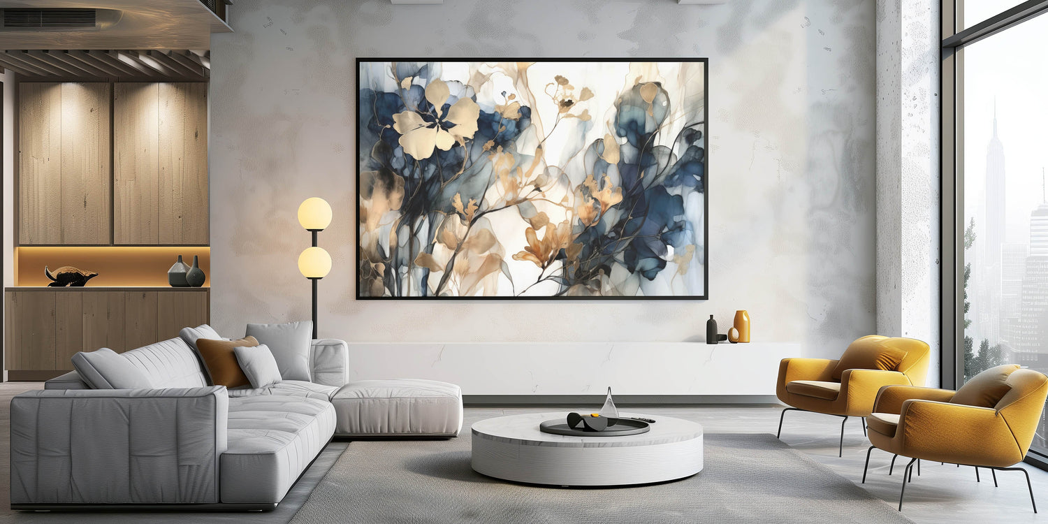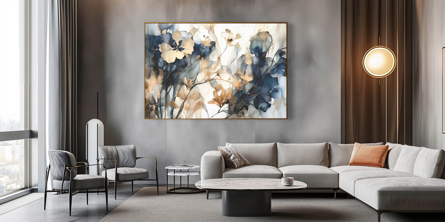- Refined Botanical Art: Showcases graceful floral forms with rich blue and gold accents, ideal for adding elegance to any wall.