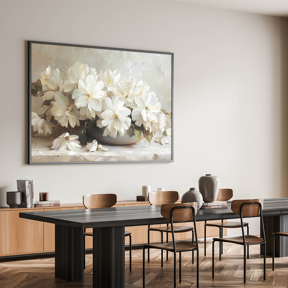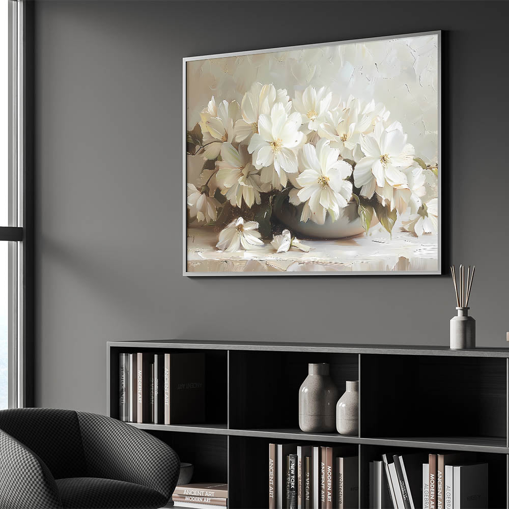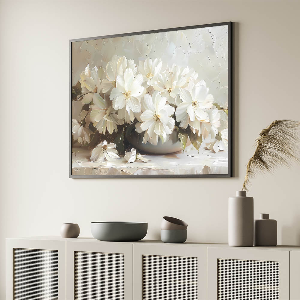 This Floral Abstract Canvas Art piece captures the timeless beauty of white blooms arranged in a soft, natural setting. With an Elegant White Flower Arrangement, this artwork adds a refined touch to any room, blending delicate textures and muted shades for a serene effect. The gentle colors and intricate details make it perfect for creating a calming, sophisticated atmosphere.