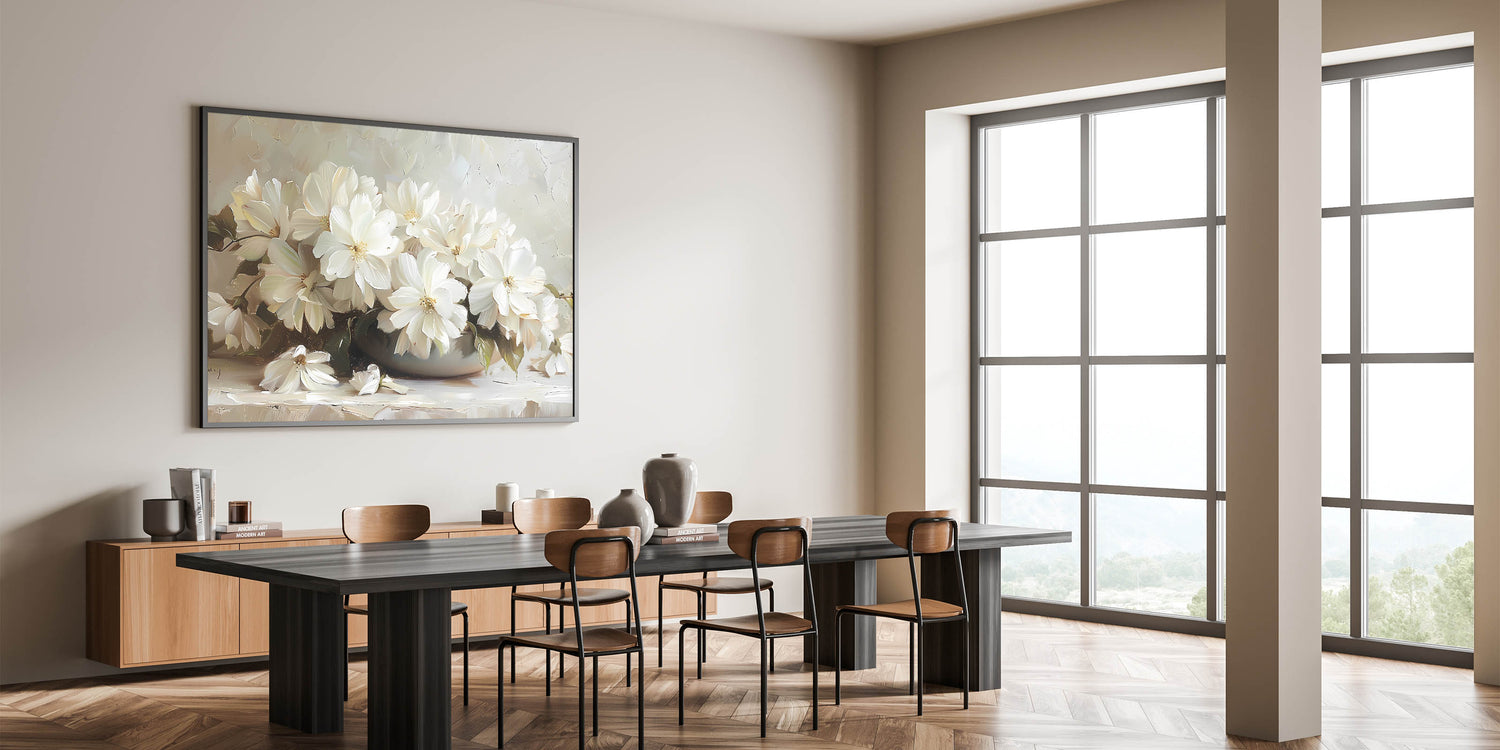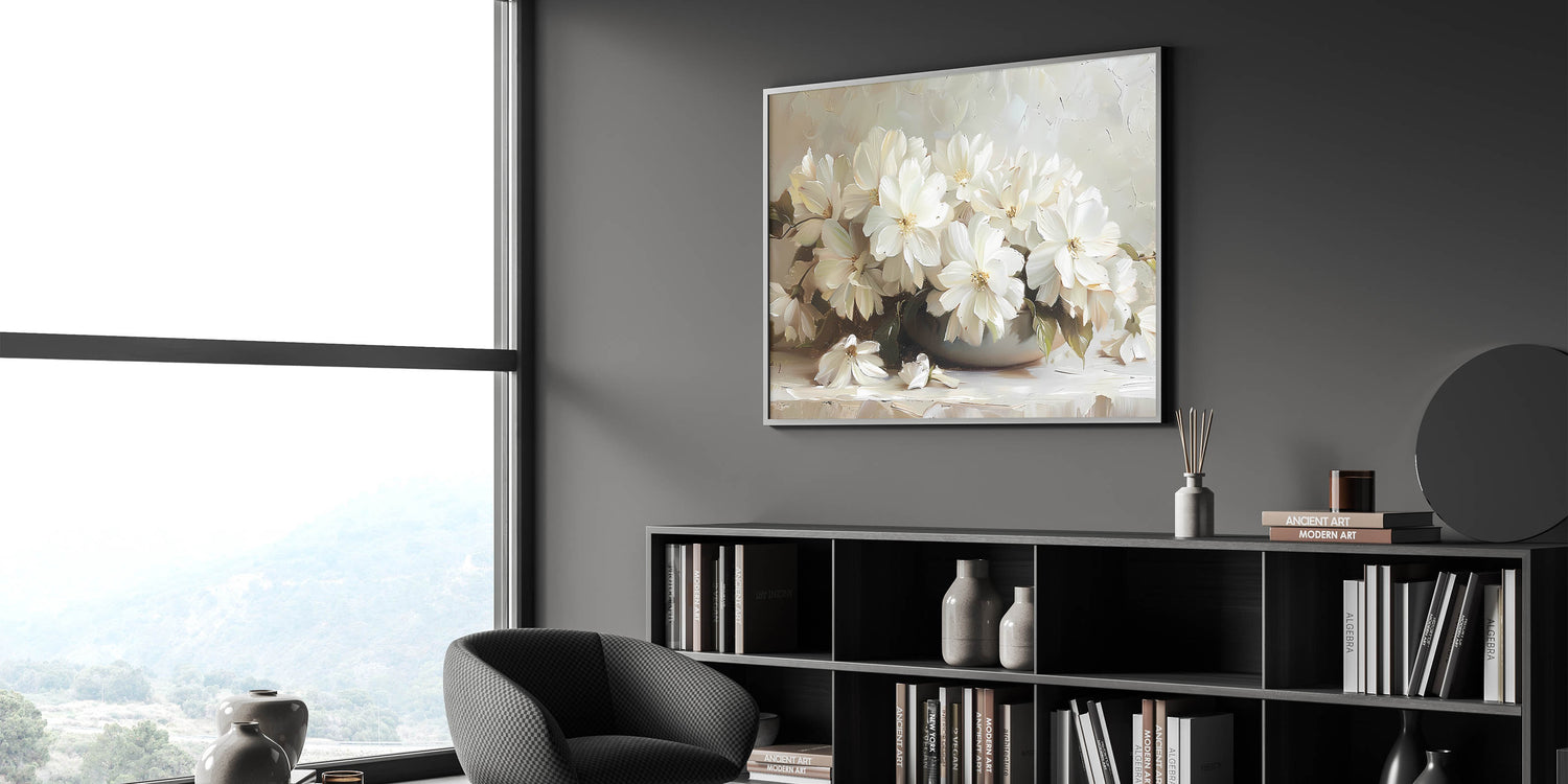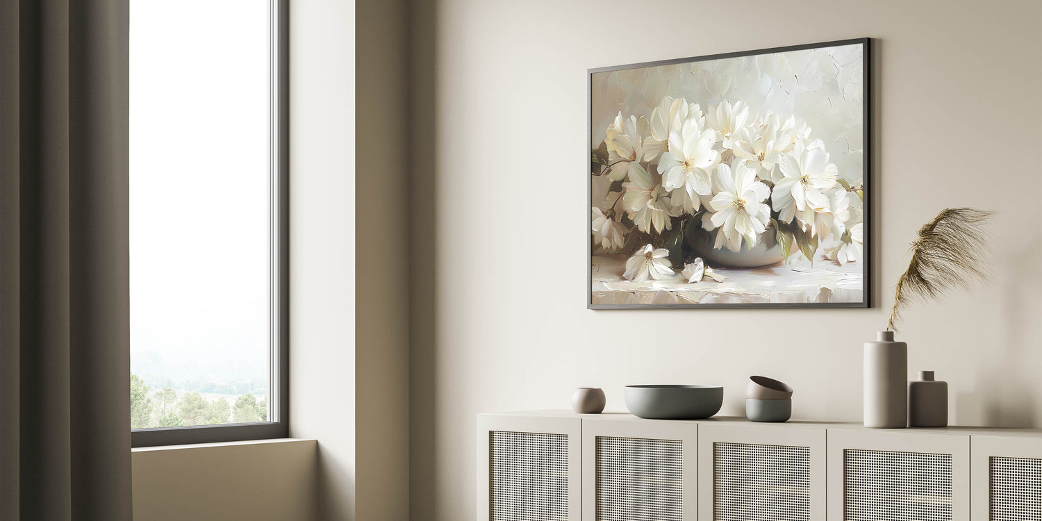 This Floral Abstract Canvas Art piece captures the timeless beauty of white blooms arranged in a soft, natural setting. With an Elegant White Flower Arrangement, this artwork adds a refined touch to any room, blending delicate textures and muted shades for a serene effect. The gentle colors and intricate details make it perfect for creating a calming, sophisticated atmosphere.