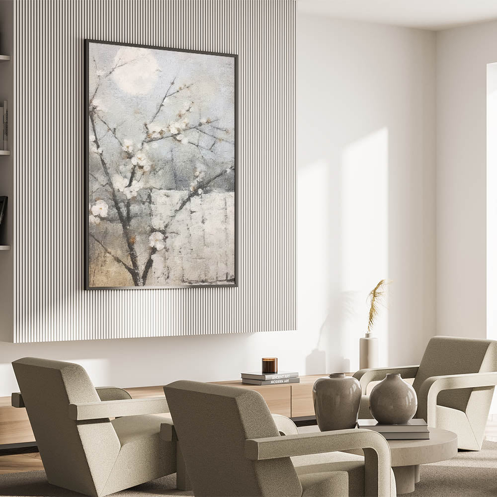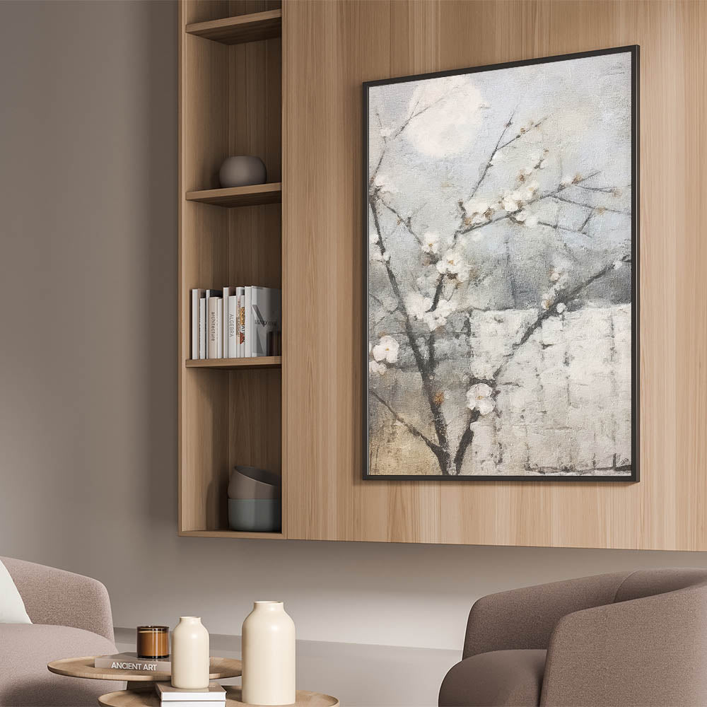 Bring the beauty of delicate blossoms into your home with this minimalist floral abstract canvas art. This serene piece features soft white flowers on slender branches against a muted, textured background, evoking a sense of peace and elegance. The subtle contrast and organic design make this artwork a perfect addition to any room aiming for a calm, sophisticated atmosphere.