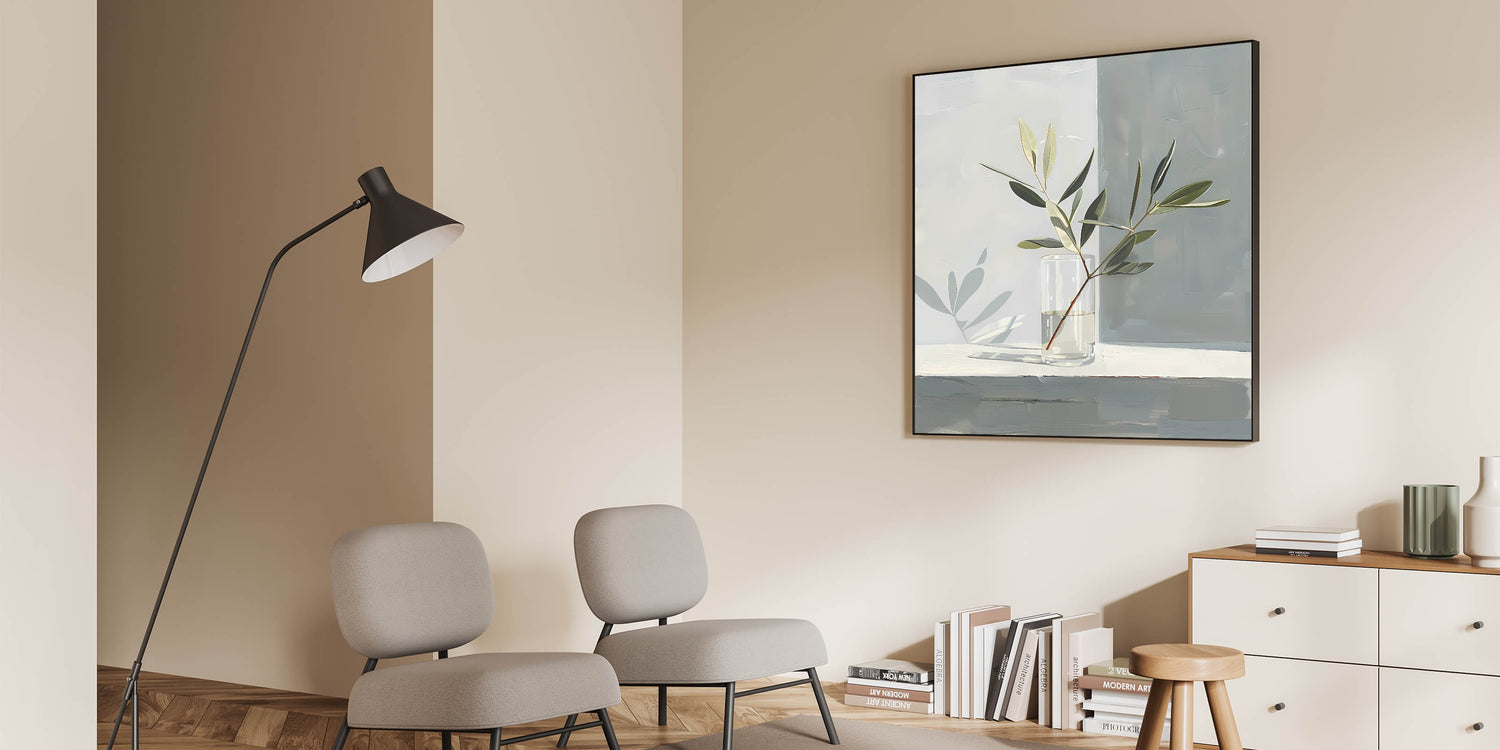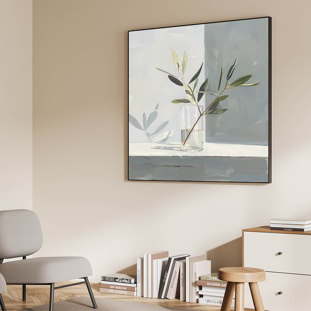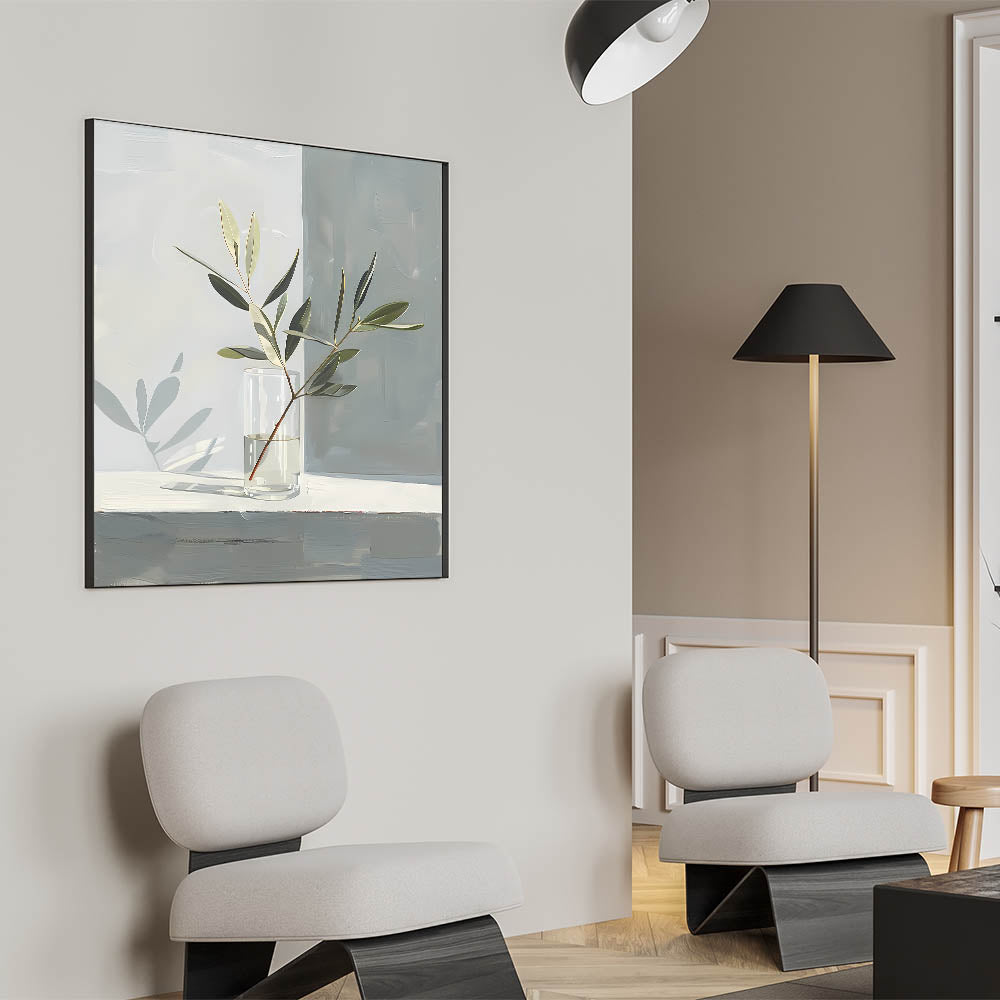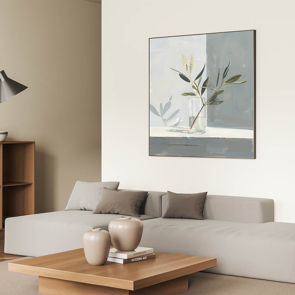 Add a fresh, natural touch to your decor with this sophisticated piece from our Abstract Florals Collection. This artwork features olive green leaves delicately placed in a glass vase, set against a soft gray backdrop. Ideal for modern spaces, this floral abstract canvas art brings a calm and stylish aesthetic to any room.