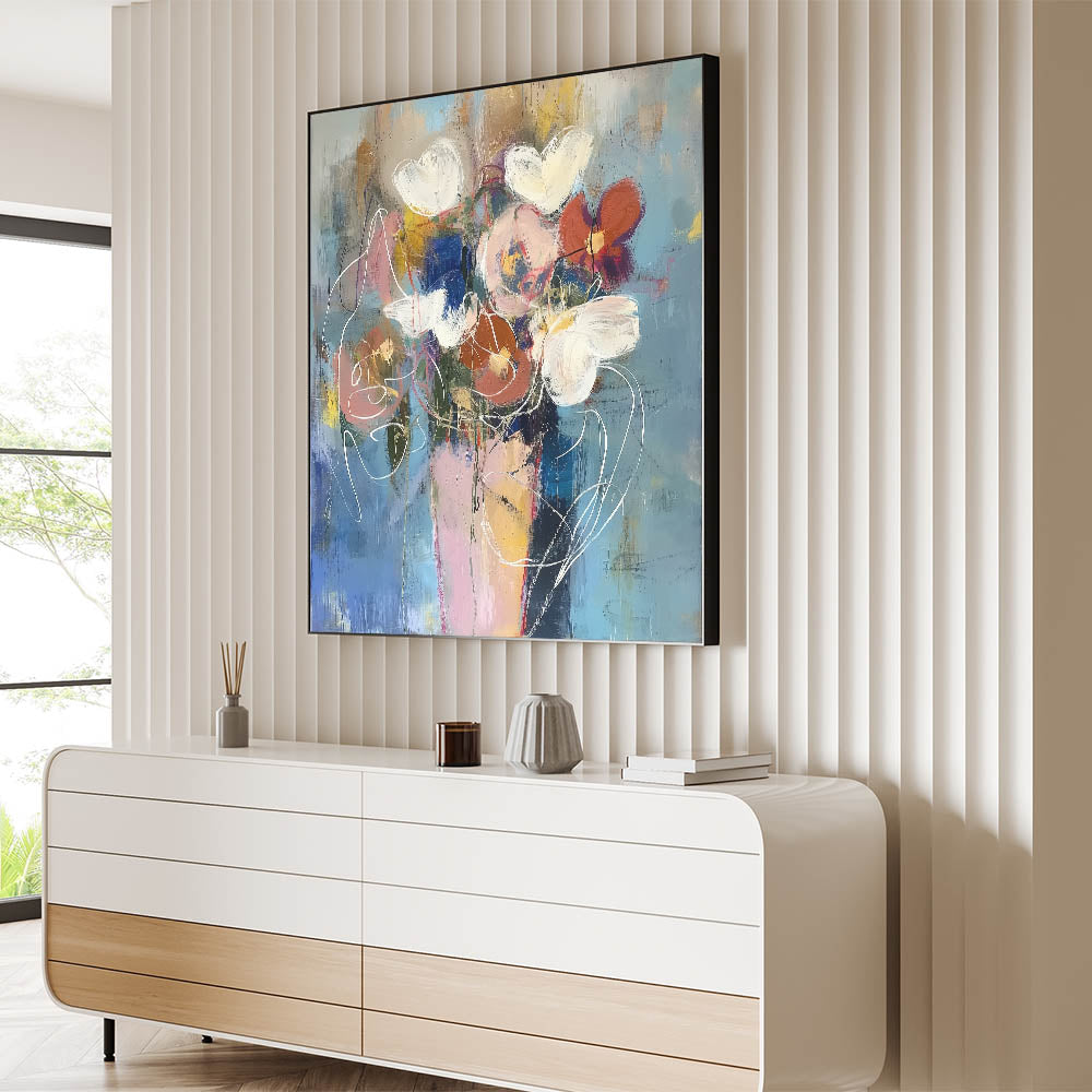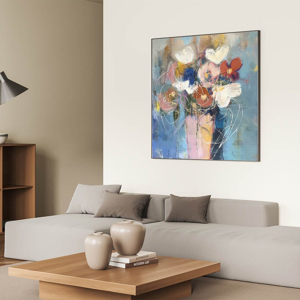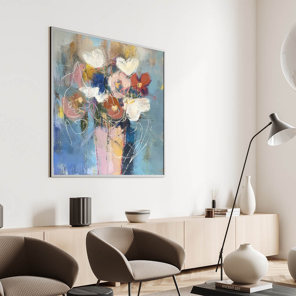Celebrate the vibrant energy of abstract florals with this modern floral abstract, ideal for creating a joyful and welcoming atmosphere. Whether as a gift or a personal addition to your home, Floral Essence is a timeless and elegant choice.