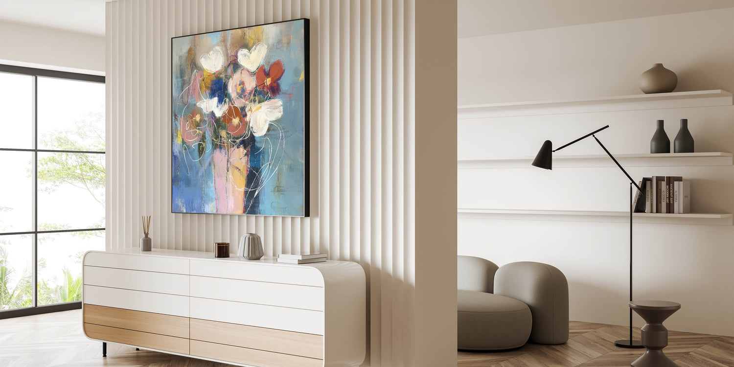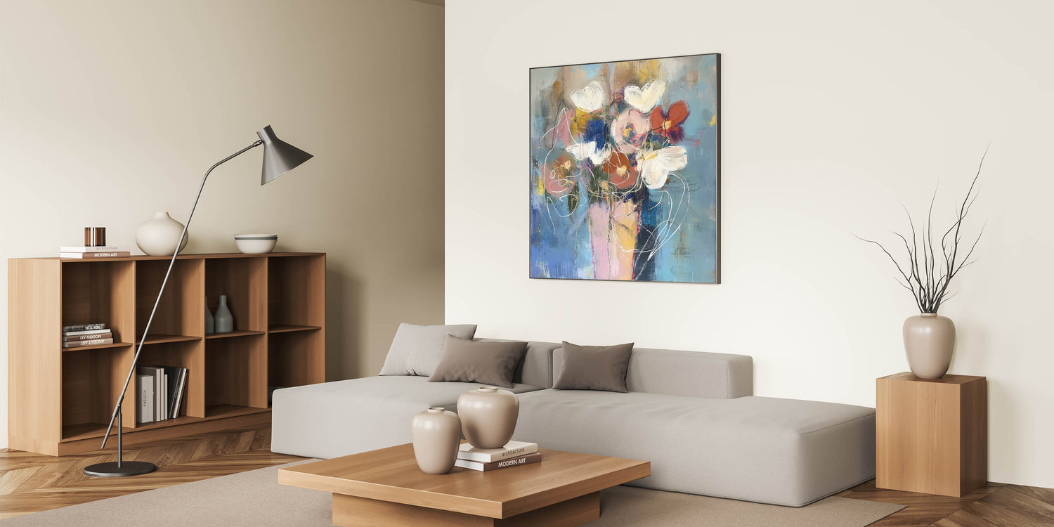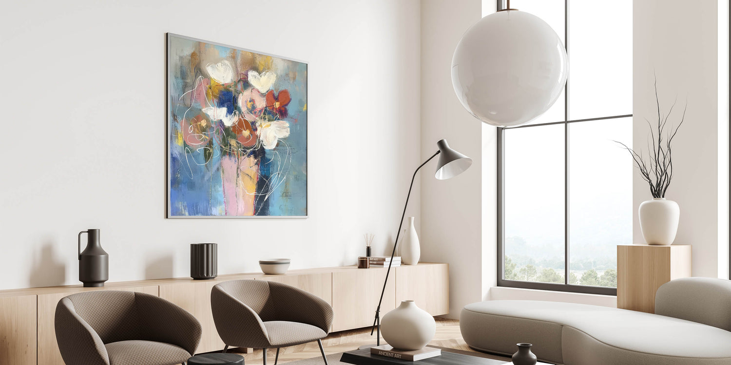 Celebrate the vibrant energy of abstract florals with this modern floral abstract, ideal for creating a joyful and welcoming atmosphere. Whether as a gift or a personal addition to your home, Floral Essence is a timeless and elegant choice.