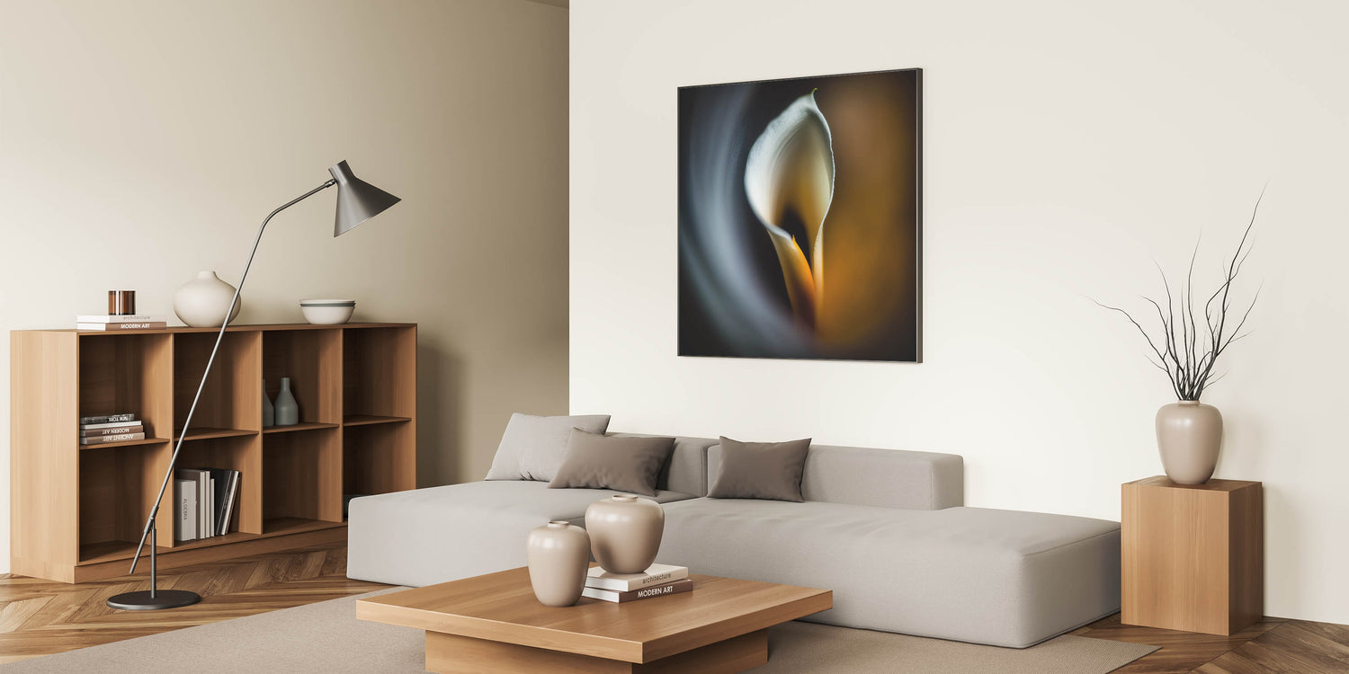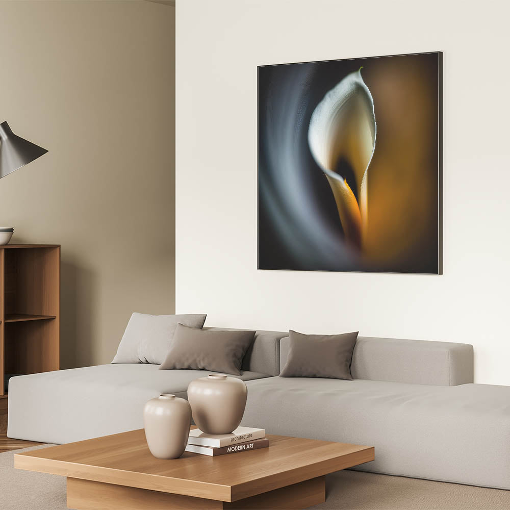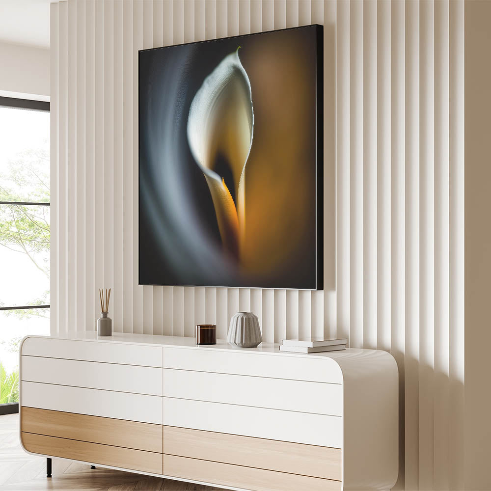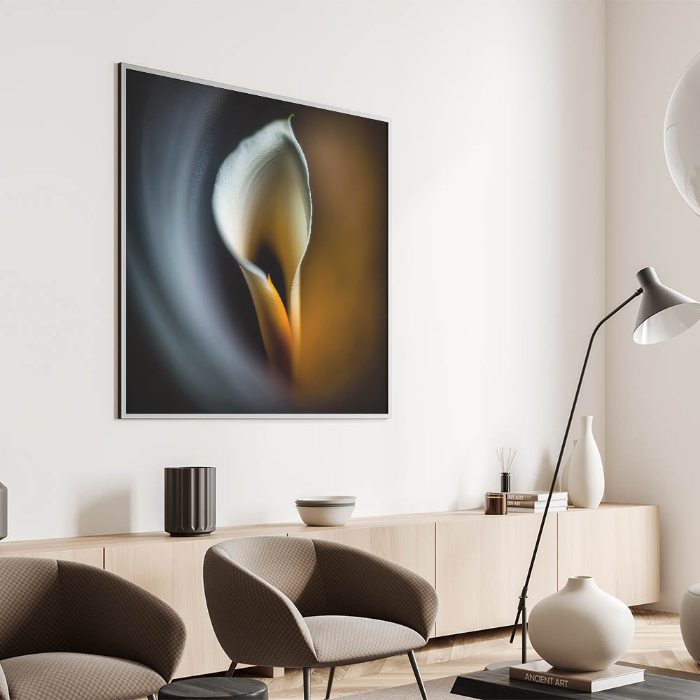 This sophisticated floral wall art captures a minimalist view of a calla lily bathed in soft, delicate light. The elegant curves of the flower’s petals, combined with gentle gradients of white, gold, and black, create a sense of timeless beauty and serenity. Perfect for modern and minimalist interiors, this artwork adds a refined touch to any space, highlighting the beauty of simplicity in nature.