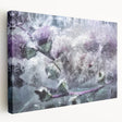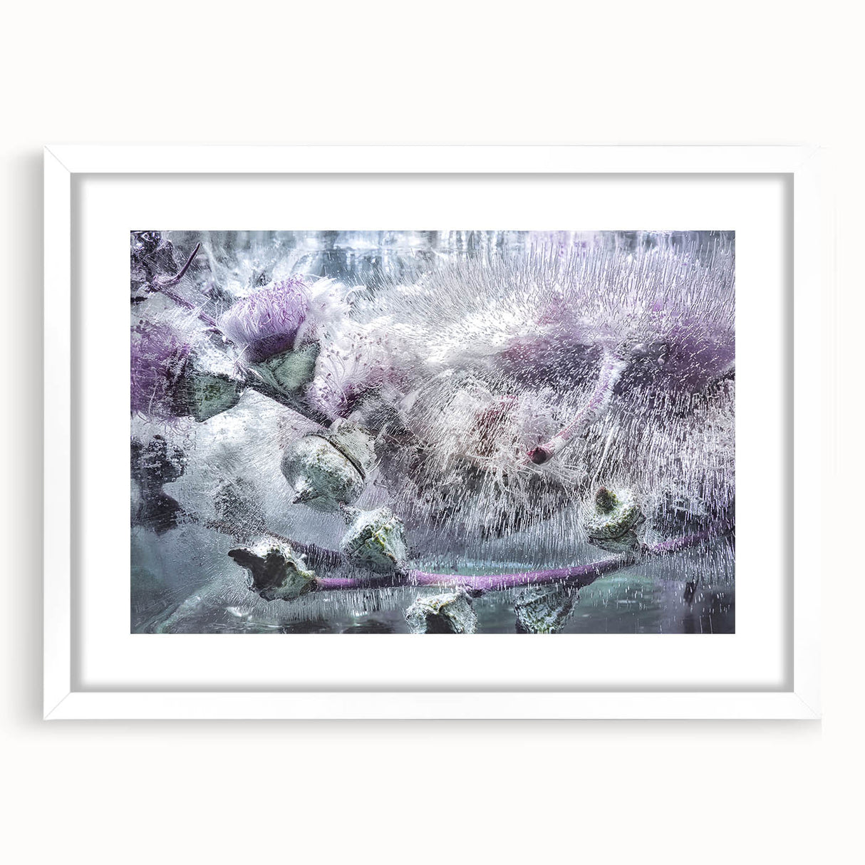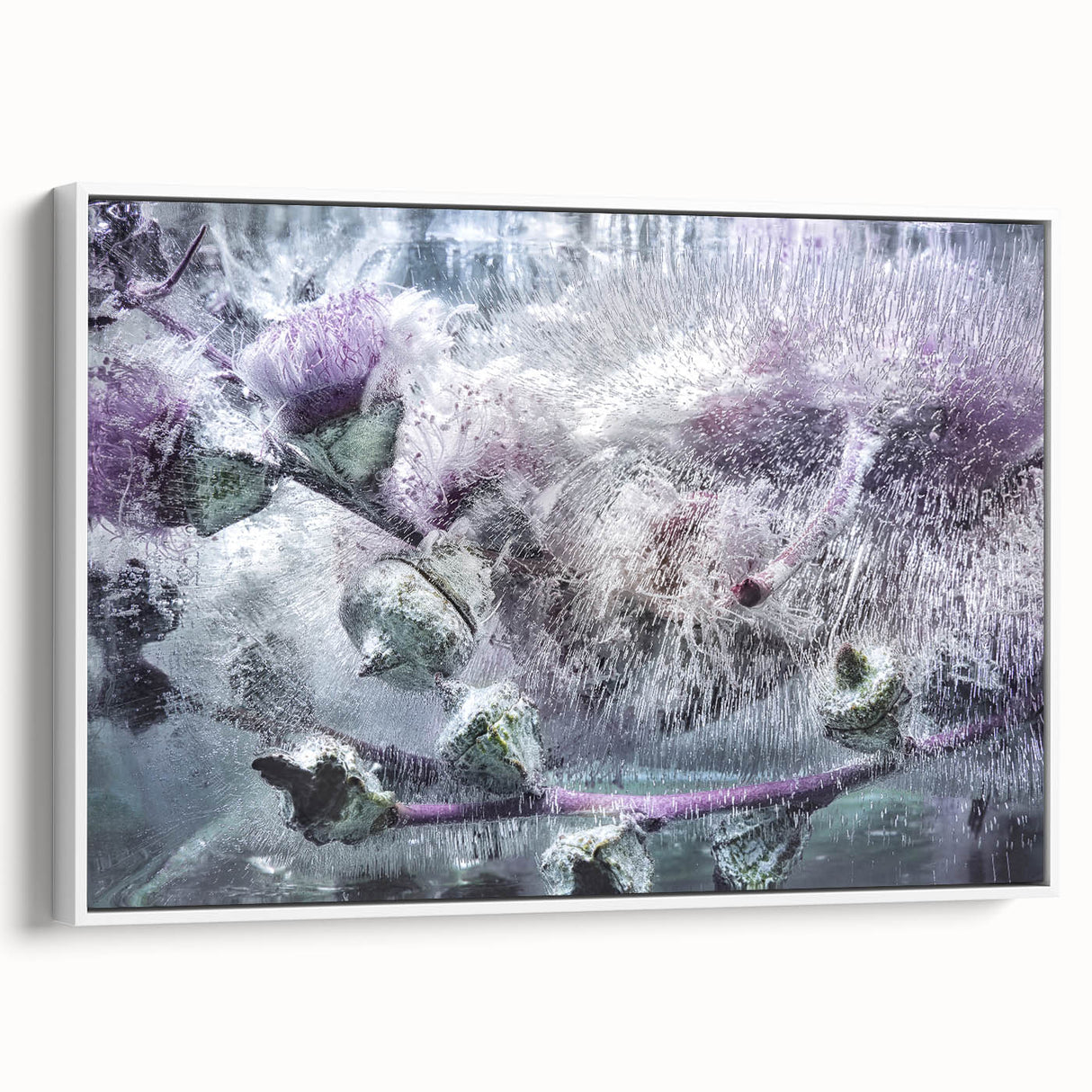 Experience the ethereal beauty of nature suspended in time with this fine art photography canvas print. Featuring delicate purple flowers and seed pods encased in ice, this artwork highlights intricate frost patterns and shimmering textures.