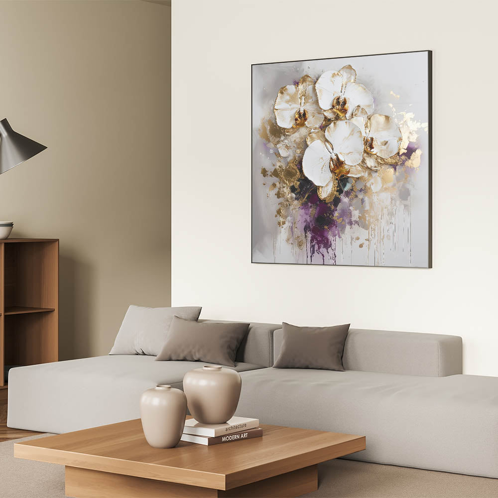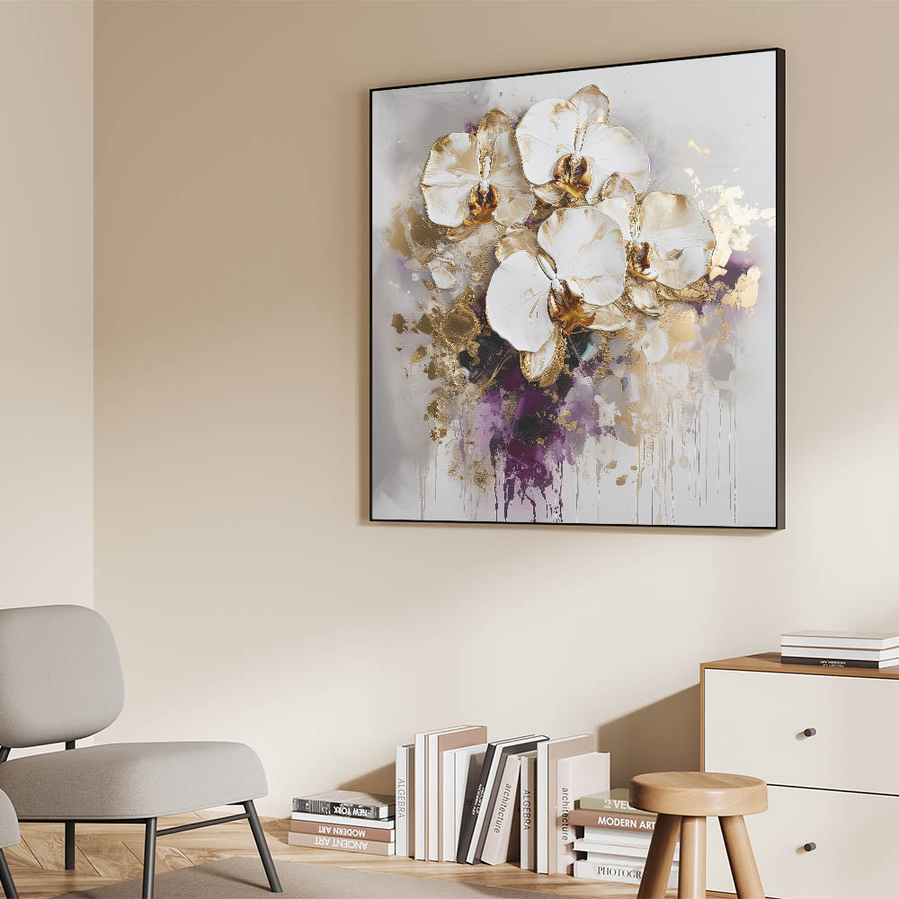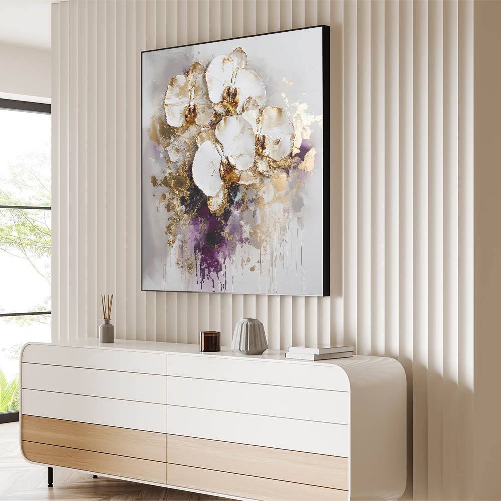 Transform your space with the elegance of this abstract floral art featuring delicate white orchids accented by shimmering gold and touches of deep plum. This luxurious design combines rich textures with a sophisticated color palette, creating a masterpiece that exudes opulence and modern artistry. Perfect for enhancing any living space, this artwork blends timeless beauty with contemporary flair.