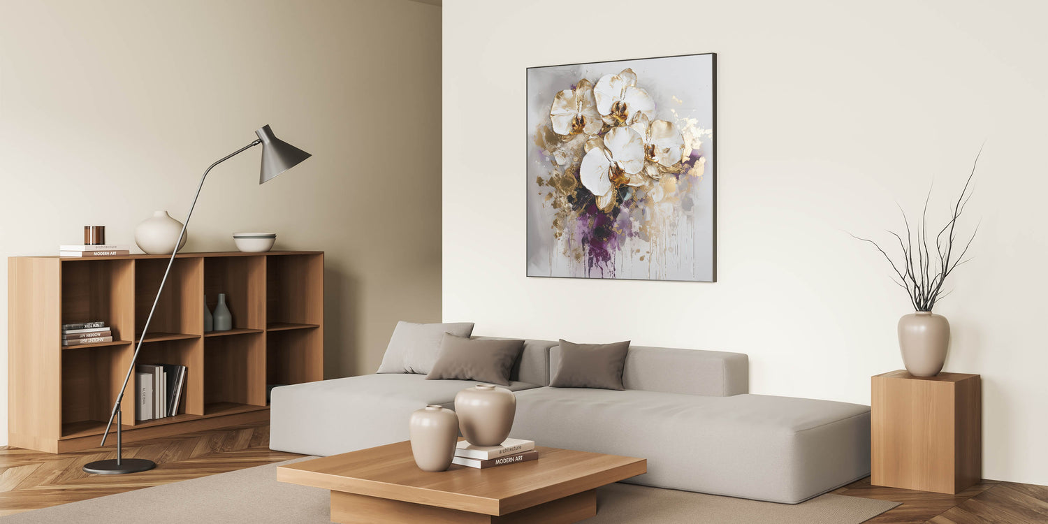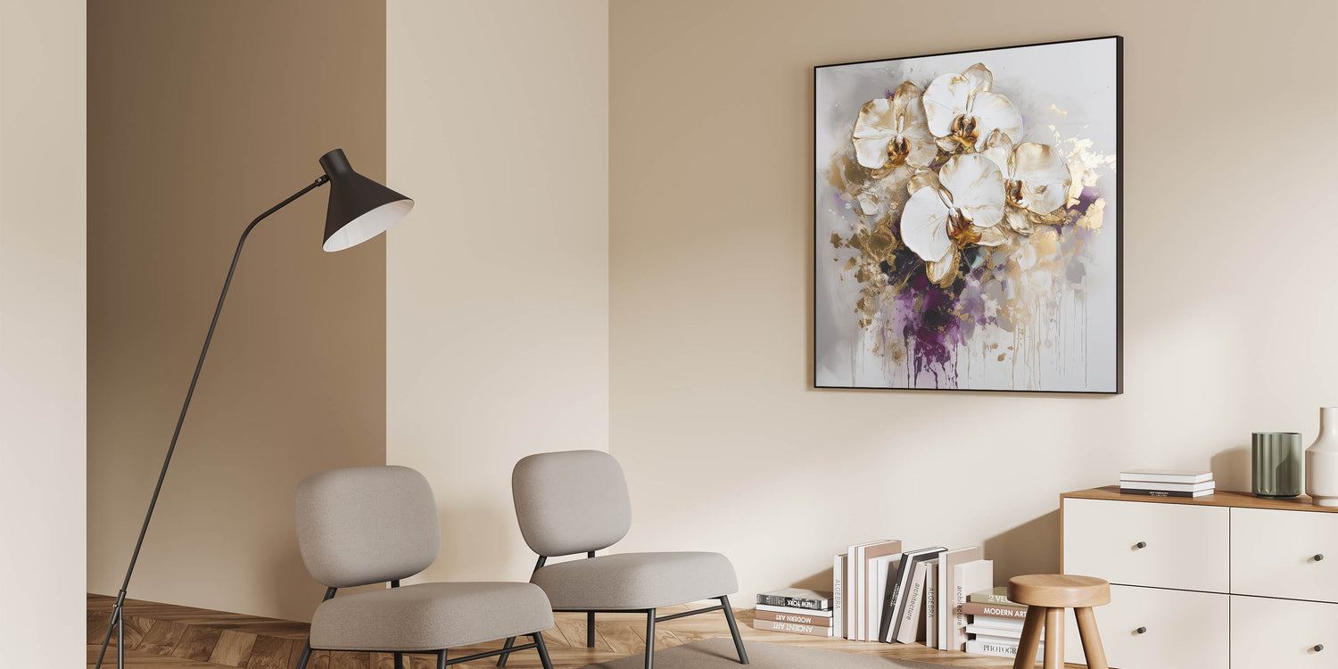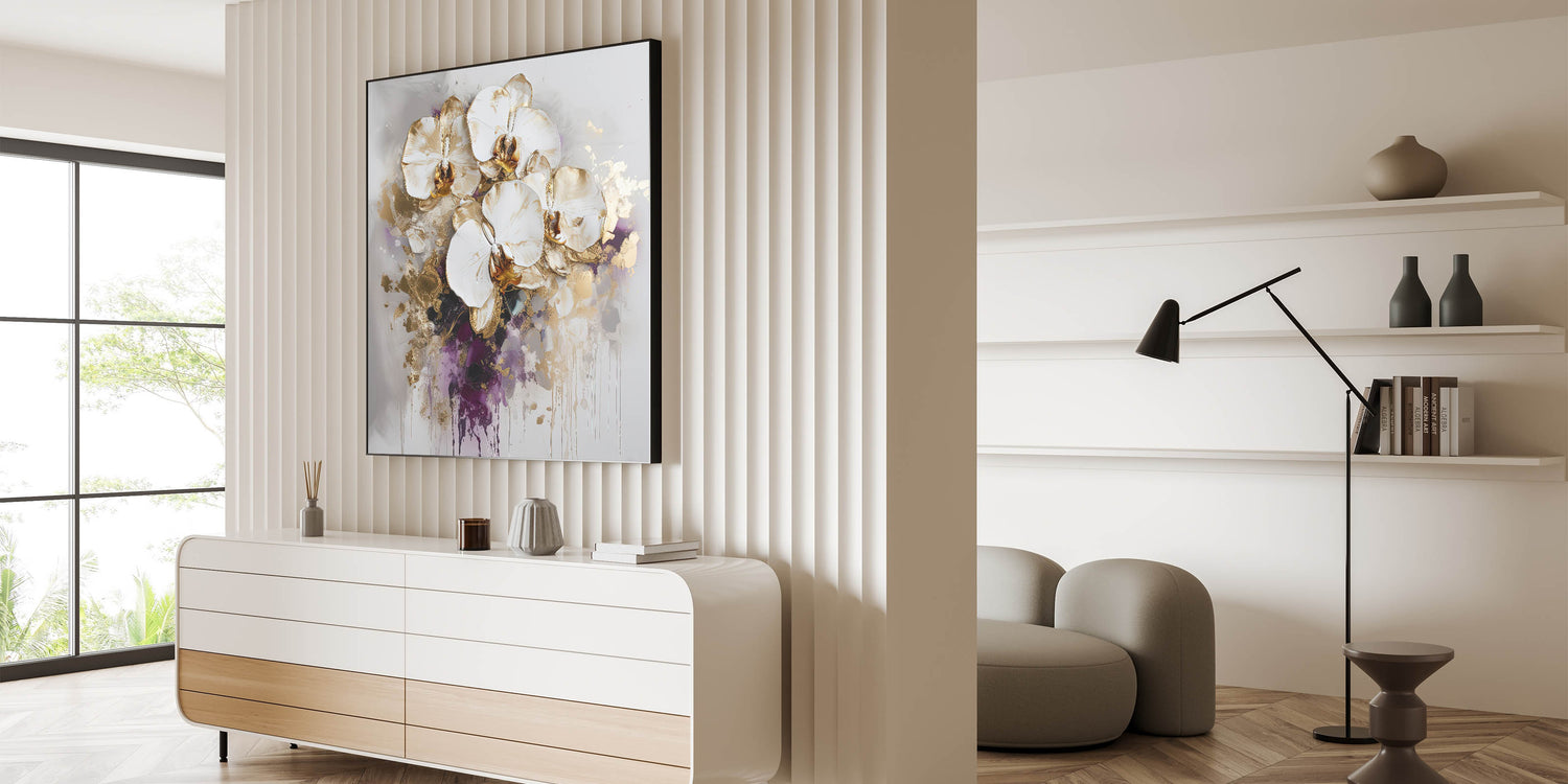 Transform your space with the elegance of this abstract floral art featuring delicate white orchids accented by shimmering gold and touches of deep plum. This luxurious design combines rich textures with a sophisticated color palette, creating a masterpiece that exudes opulence and modern artistry. Perfect for enhancing any living space, this artwork blends timeless beauty with contemporary flair.
