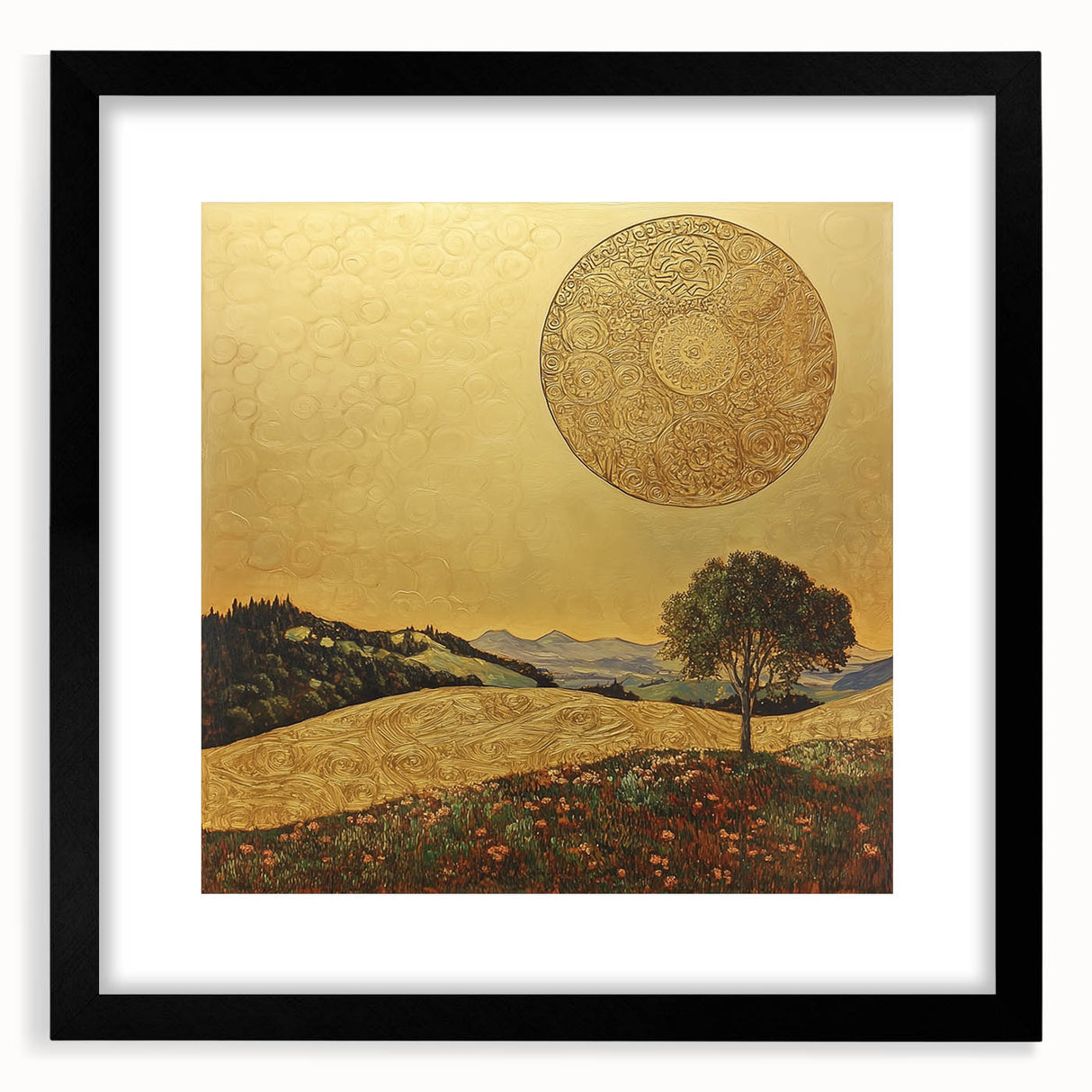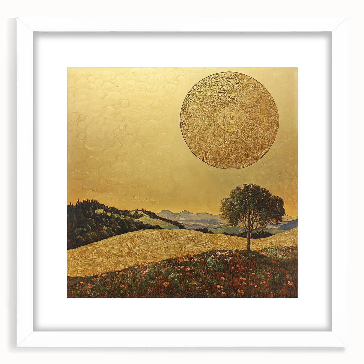 Immerse yourself in the beauty of this abstract floral artwork for home decor, featuring a luminous golden sky, intricate celestial patterns, and a tranquil landscape. This modern flower abstract painting combines elements of nature and cosmic wonder, creating a harmonious contemporary botanical canvas print that radiates warmth and serenity.