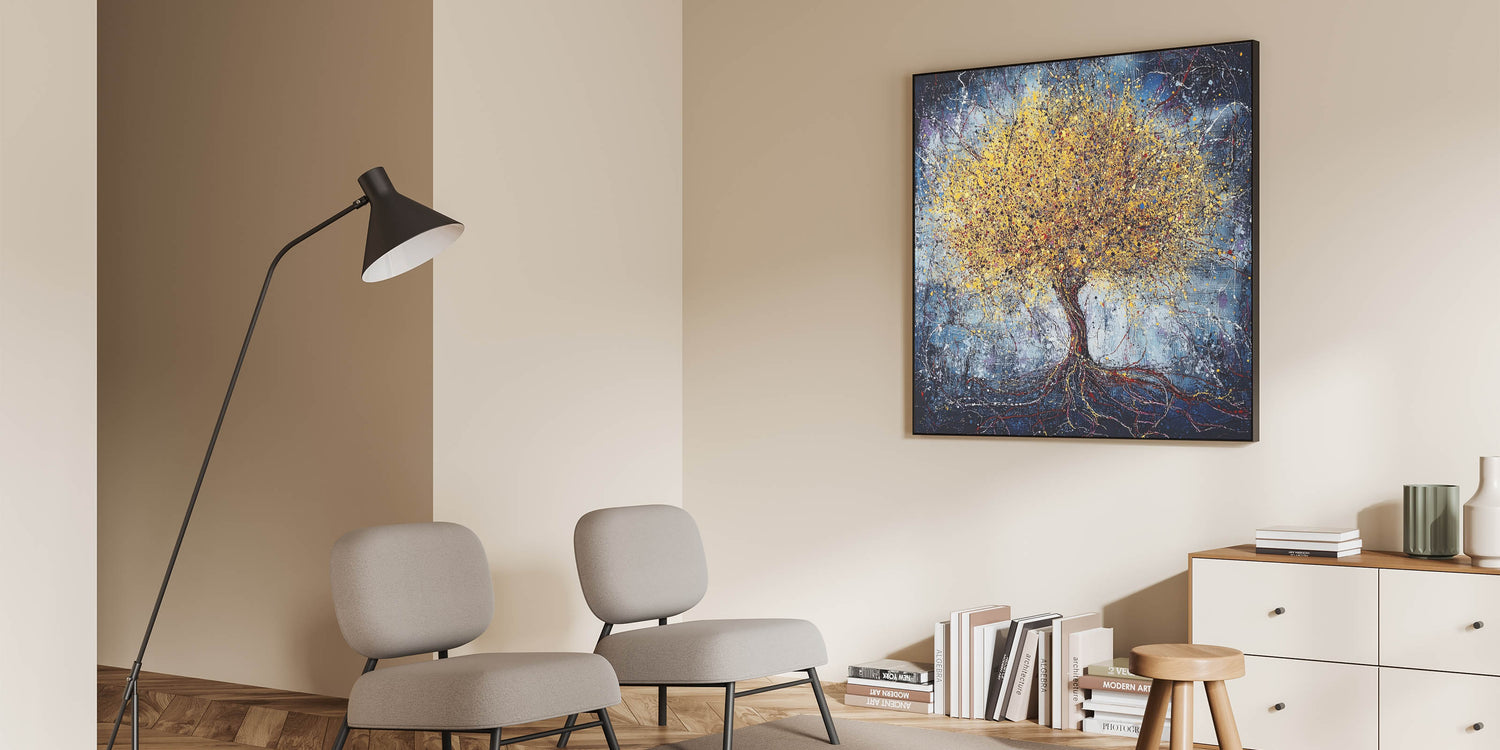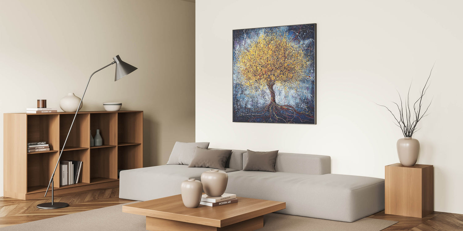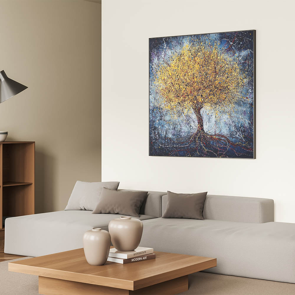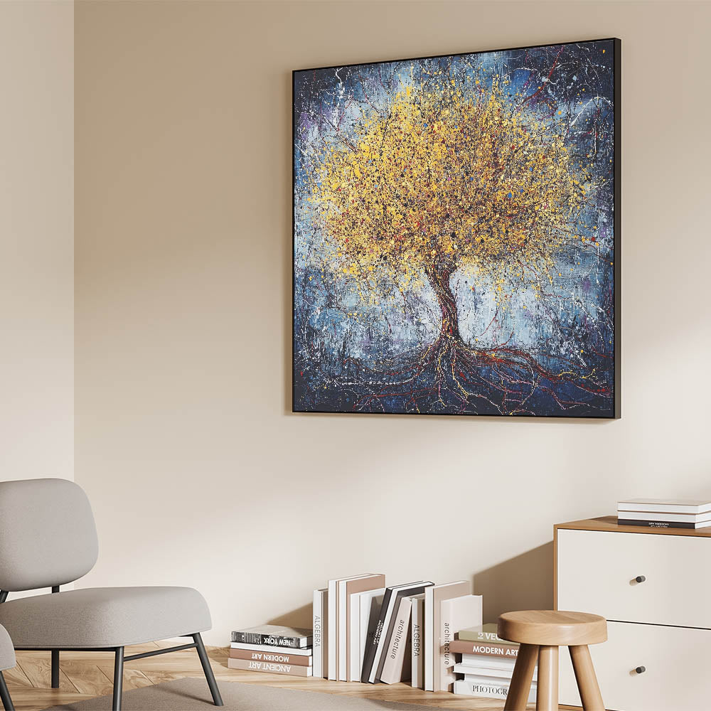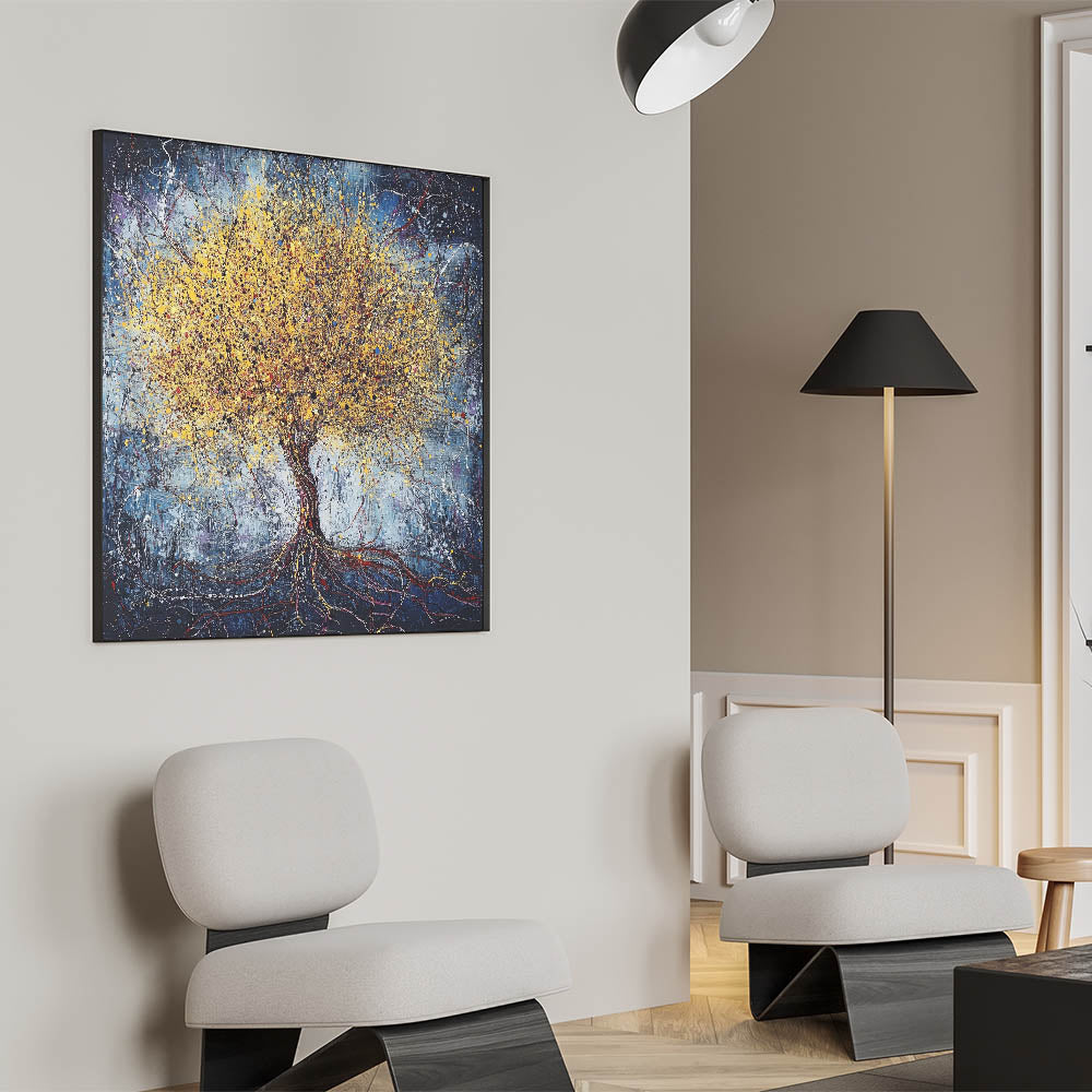 Bring the beauty of nature into your home with this stunning abstract tree art featuring a golden tree set against a textured blue background. The intricate detailing of the tree, combined with splashes of vibrant yellow and metallic gold, creates a sense of energy and life. The dark blue backdrop enhances the luminous tones of the tree, making it a striking centerpiece for any room.
