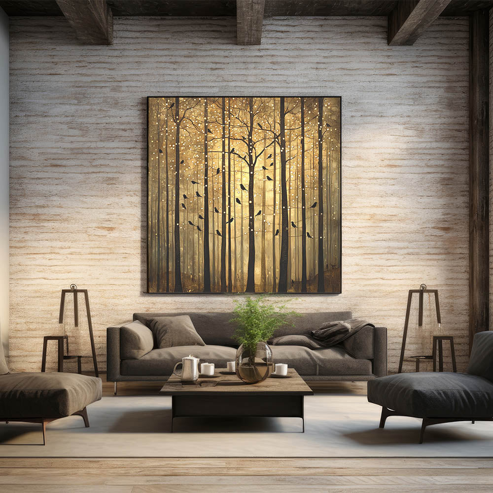 Transform your space with this abstract floral artwork for home decor, featuring a mesmerizing golden forest with silhouetted birds perched among illuminated branches. This modern flower abstract painting blends rich gold and deep black tones, creating a dramatic yet serene atmosphere. A perfect balance of mystery and elegance, this contemporary botanical canvas print adds depth and intrigue to any space.