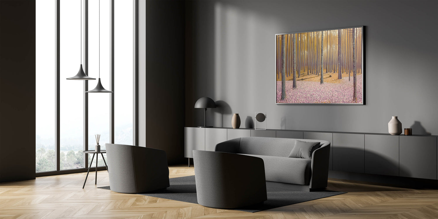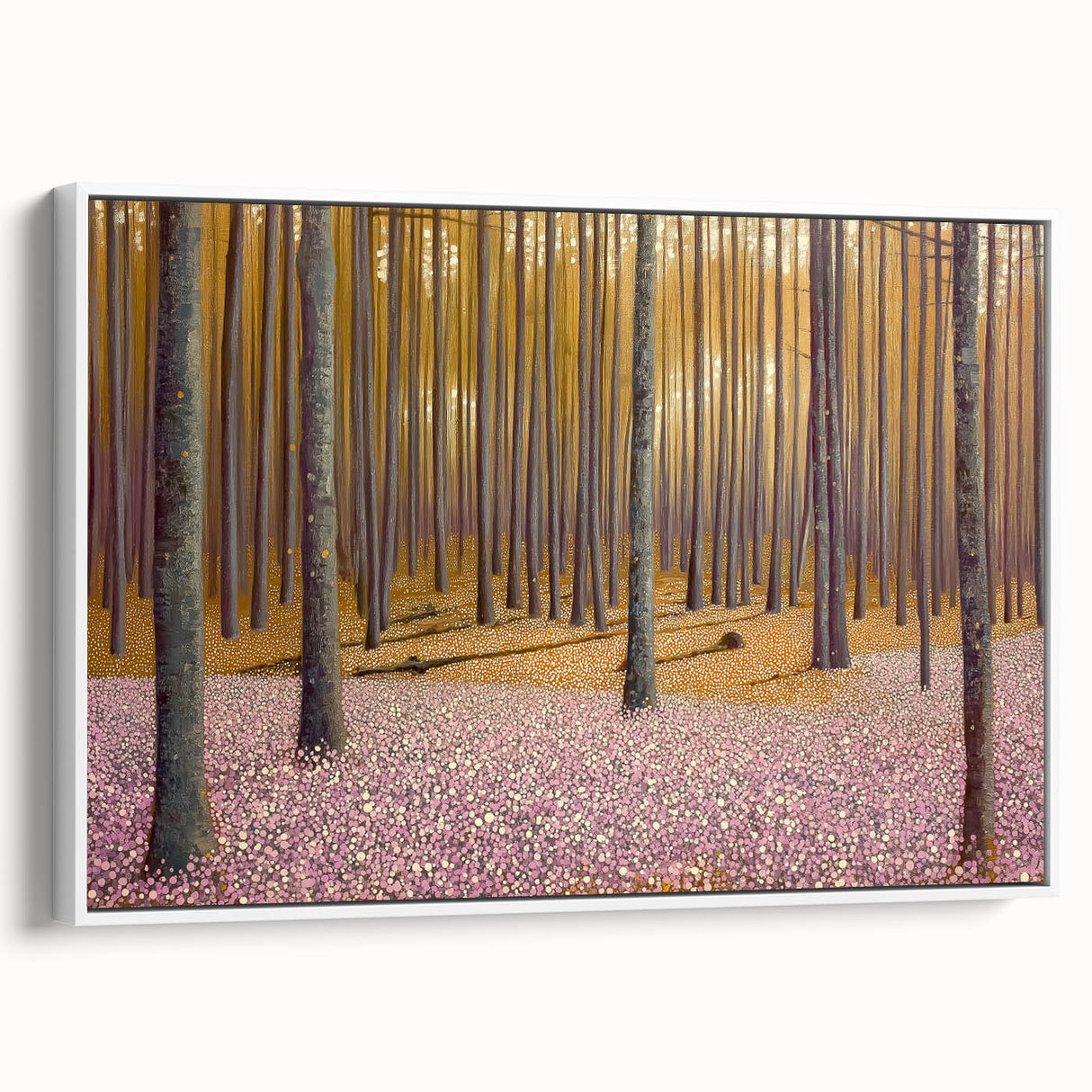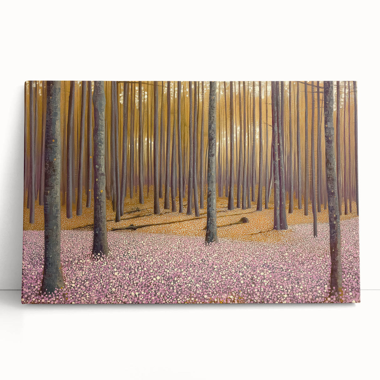 Invite the beauty of nature into your home with this abstract floral artwork for home decor, featuring a golden-lit forest and a soft pink floral ground. This modern flower abstract painting captures the tranquility of a dreamy woodland scene, where warm light filters through tall trees, casting long shadows over a delicate sea of blossoms. The balance of earthy tones and soft pastels makes this contemporary botanical canvas print a versatile and captivating piece.