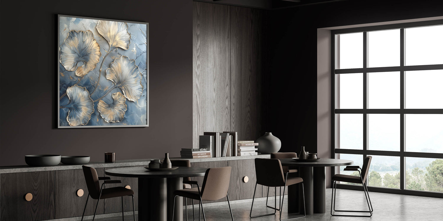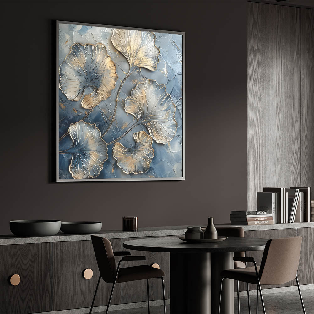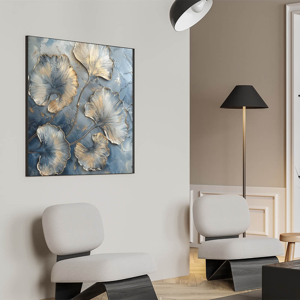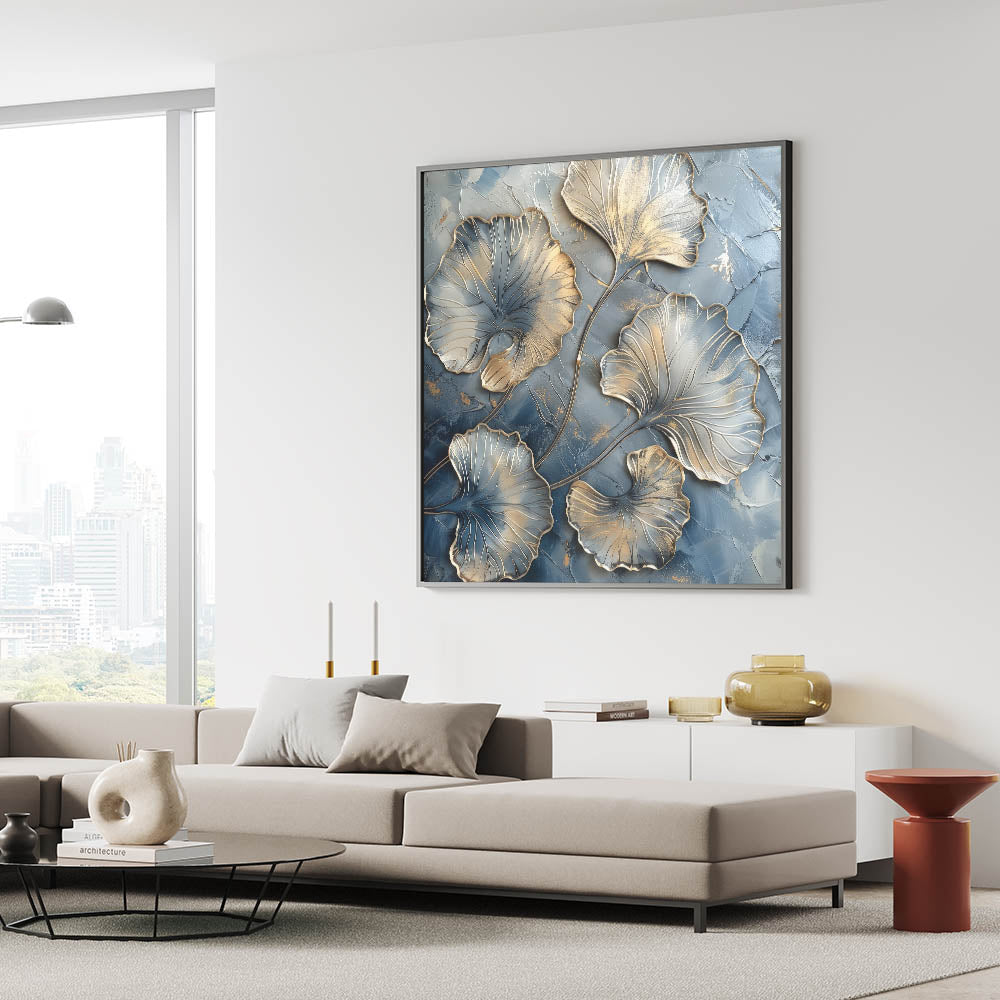 Elevate your interior with this stunning abstract floral art, featuring golden gingko leaves against a textured blue background. The intricate detailing of the leaves, combined with the rich interplay of metallic gold and soft blue tones, creates a harmonious balance of elegance and modernity. This artwork is perfect for enhancing any living or professional space with sophistication.
