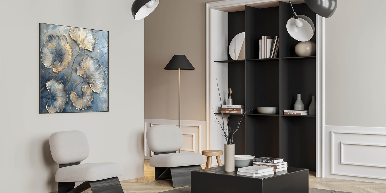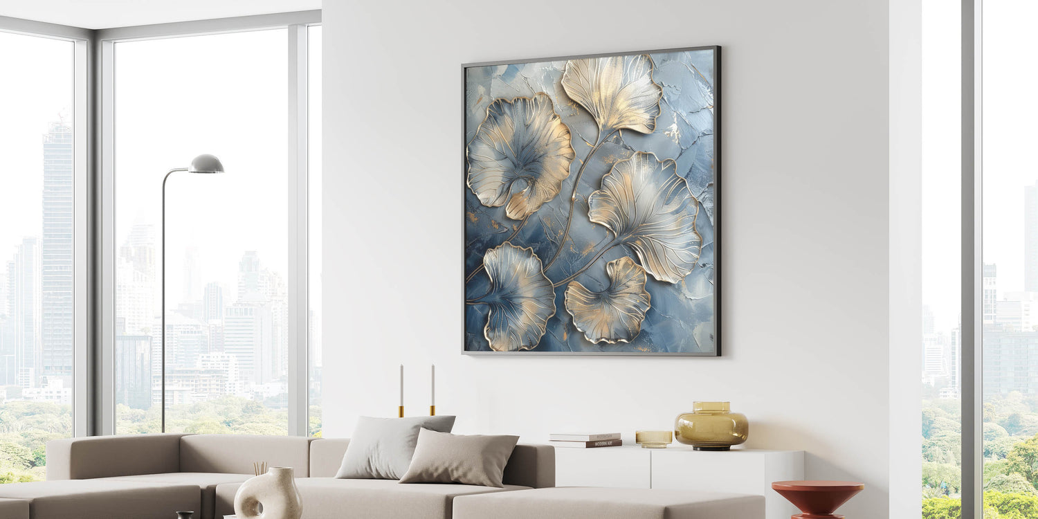 This modern floral abstract is designed to bring understated luxury to your decor. The delicate gingko leaf motif and textured background make it a versatile piece that pairs effortlessly with both bold and minimalist interiors.