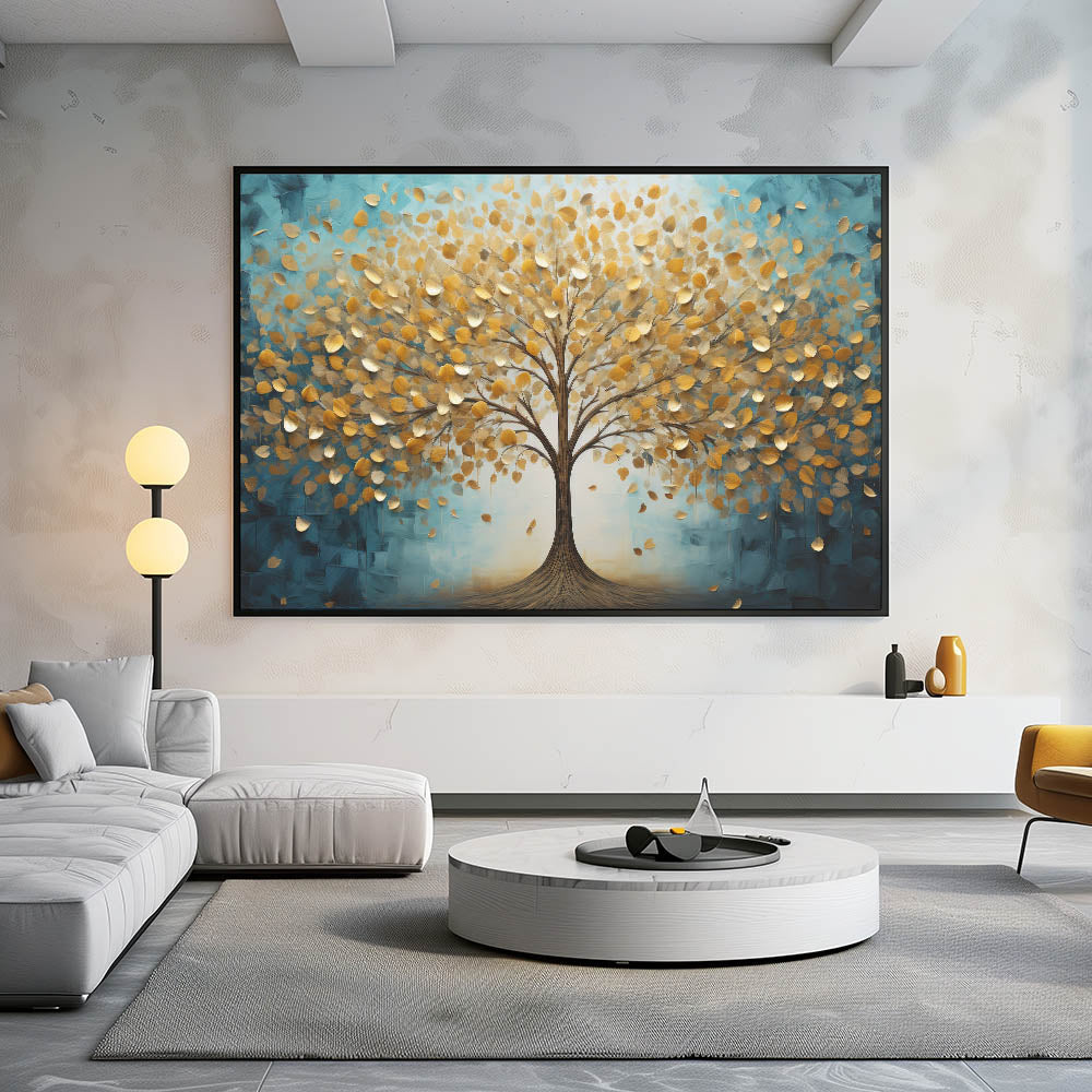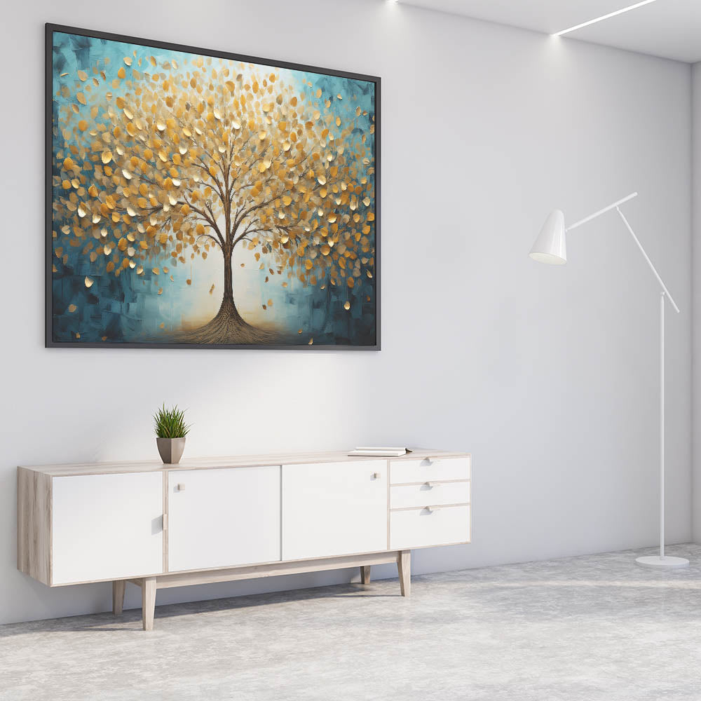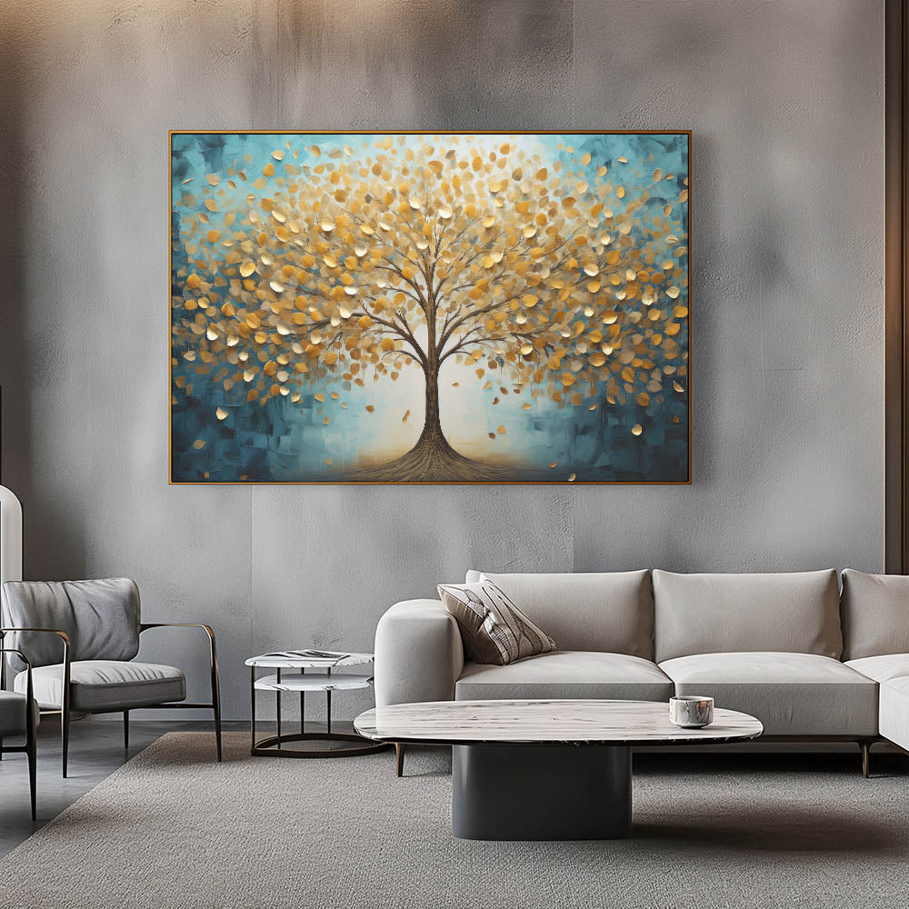 Transform your space with this enchanting abstract tree art, featuring a majestic golden tree against a serene teal background. The shimmering gold leaves, delicately textured, bring warmth and elegance, while the deep teal hues add a calming, modern touch. This artwork embodies the harmony of nature and contemporary design, making it an ideal statement piece for any room.