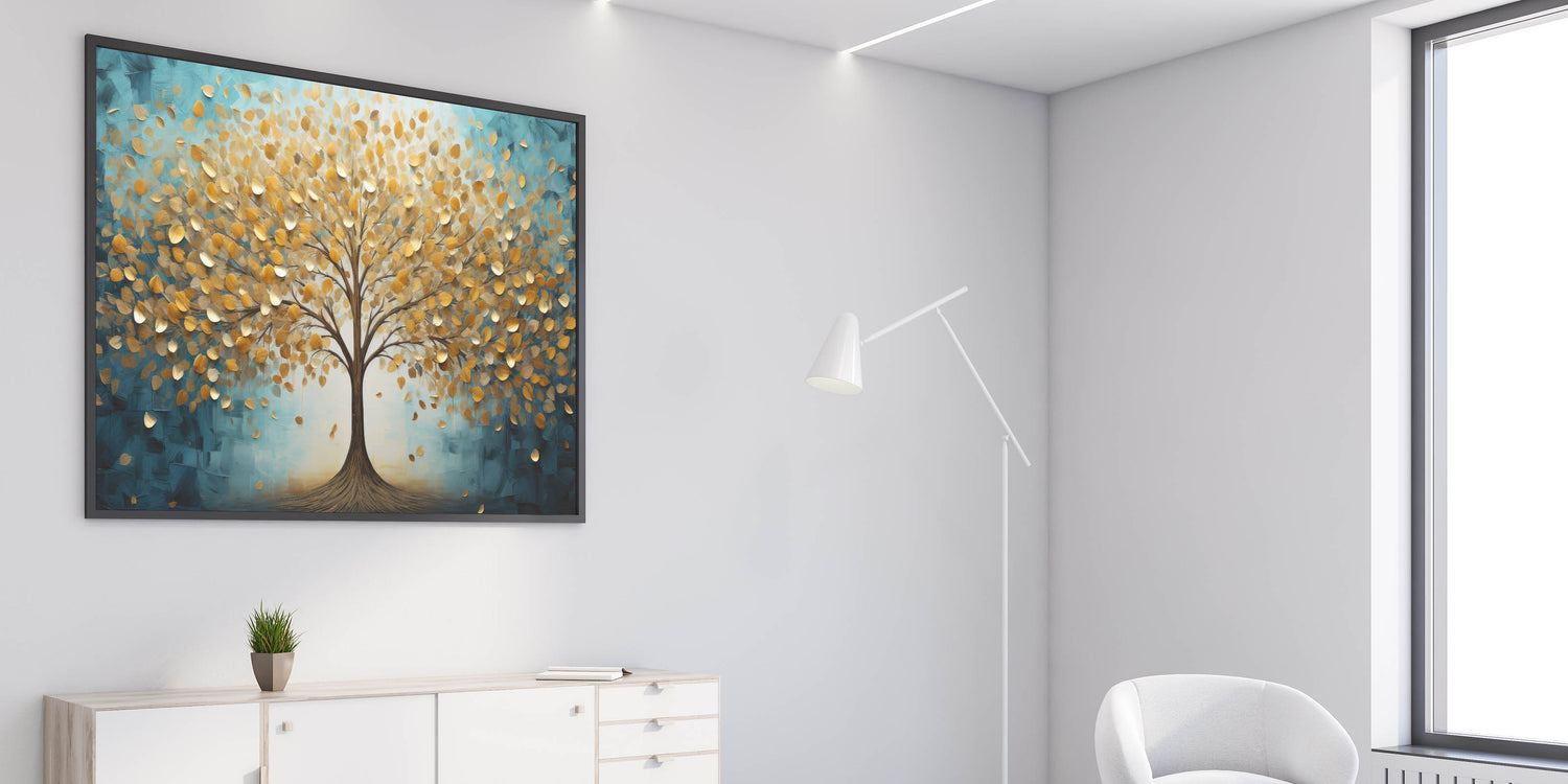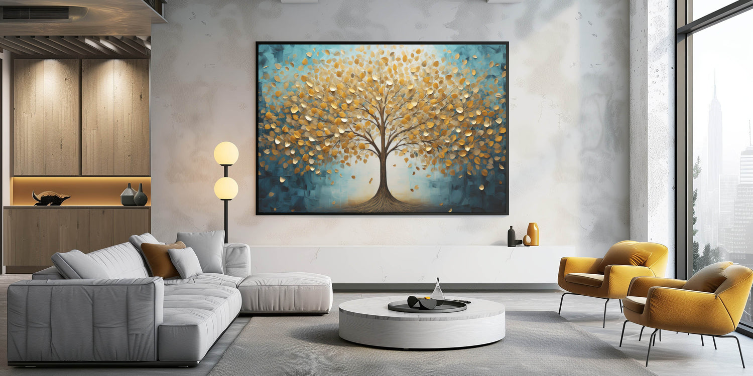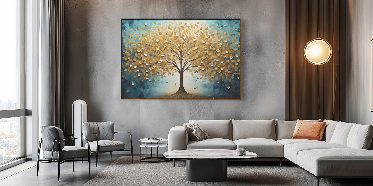 Transform your space with this enchanting abstract tree art, featuring a majestic golden tree against a serene teal background. The shimmering gold leaves, delicately textured, bring warmth and elegance, while the deep teal hues add a calming, modern touch. This artwork embodies the harmony of nature and contemporary design, making it an ideal statement piece for any room.