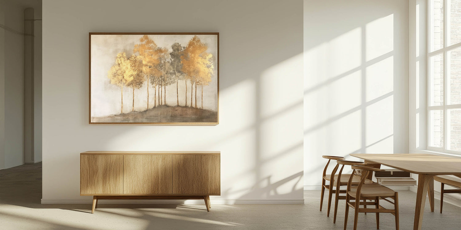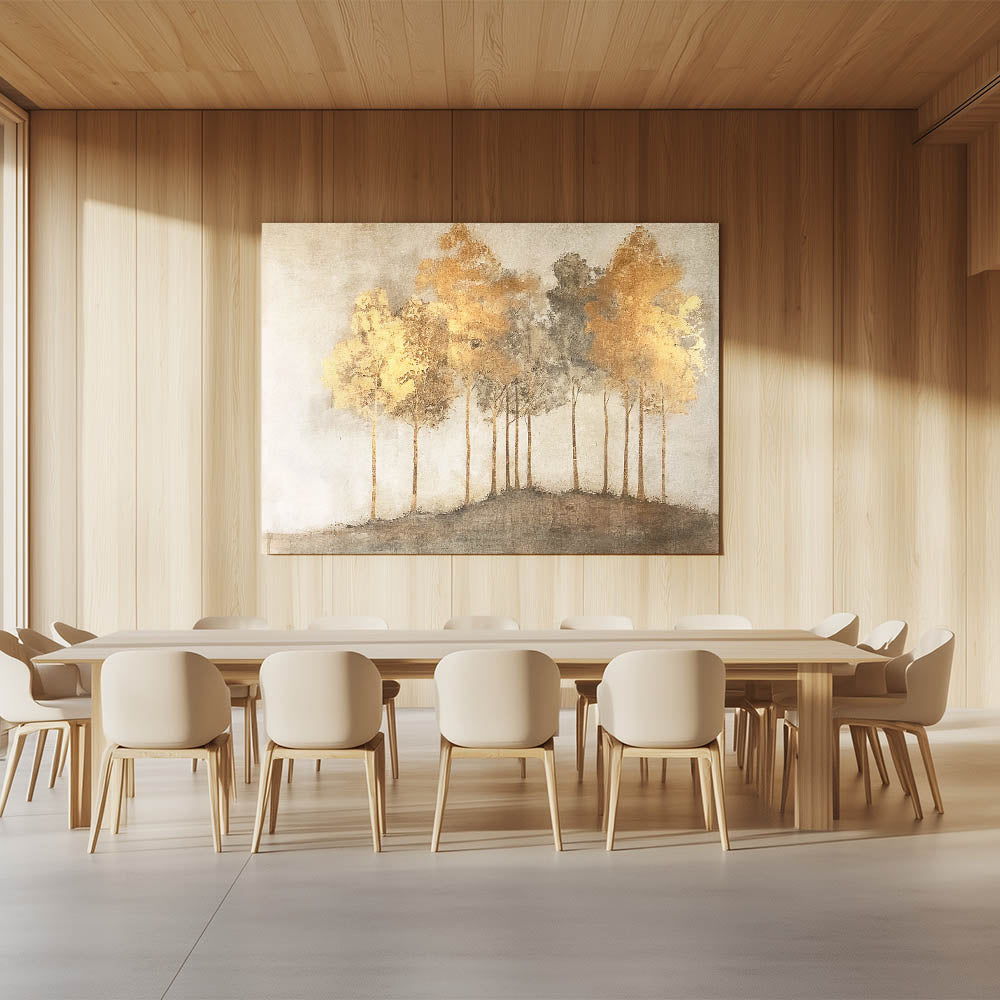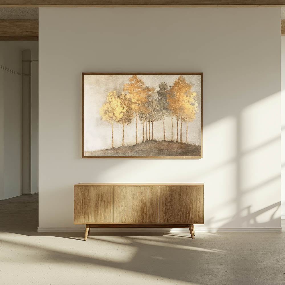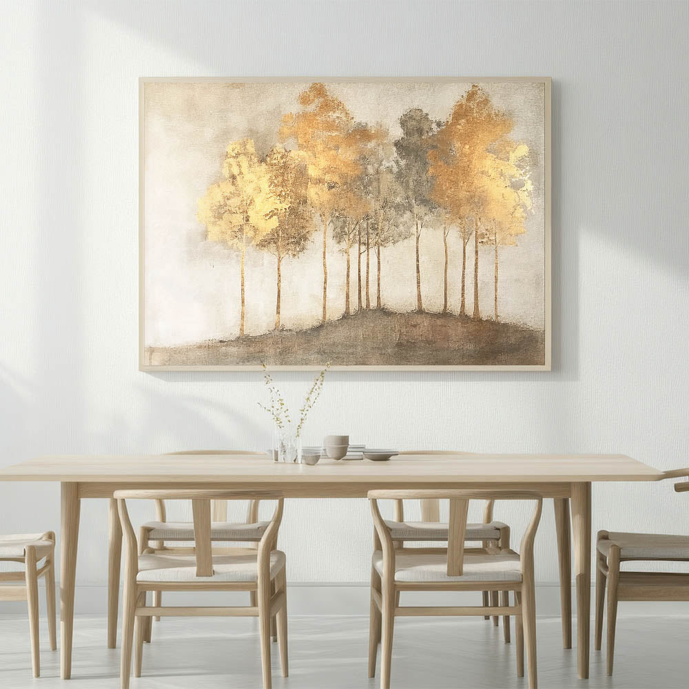 This elegant abstract landscape features a grove of golden trees standing gracefully against a soft, neutral background. The warm tones of gold and beige create a harmonious and sophisticated look, while the textured details add depth and character. Perfect for bringing a touch of nature indoors, this artwork fits beautifully with modern, rustic, and classic decor styles, adding a sense of tranquility and elegance to any space.