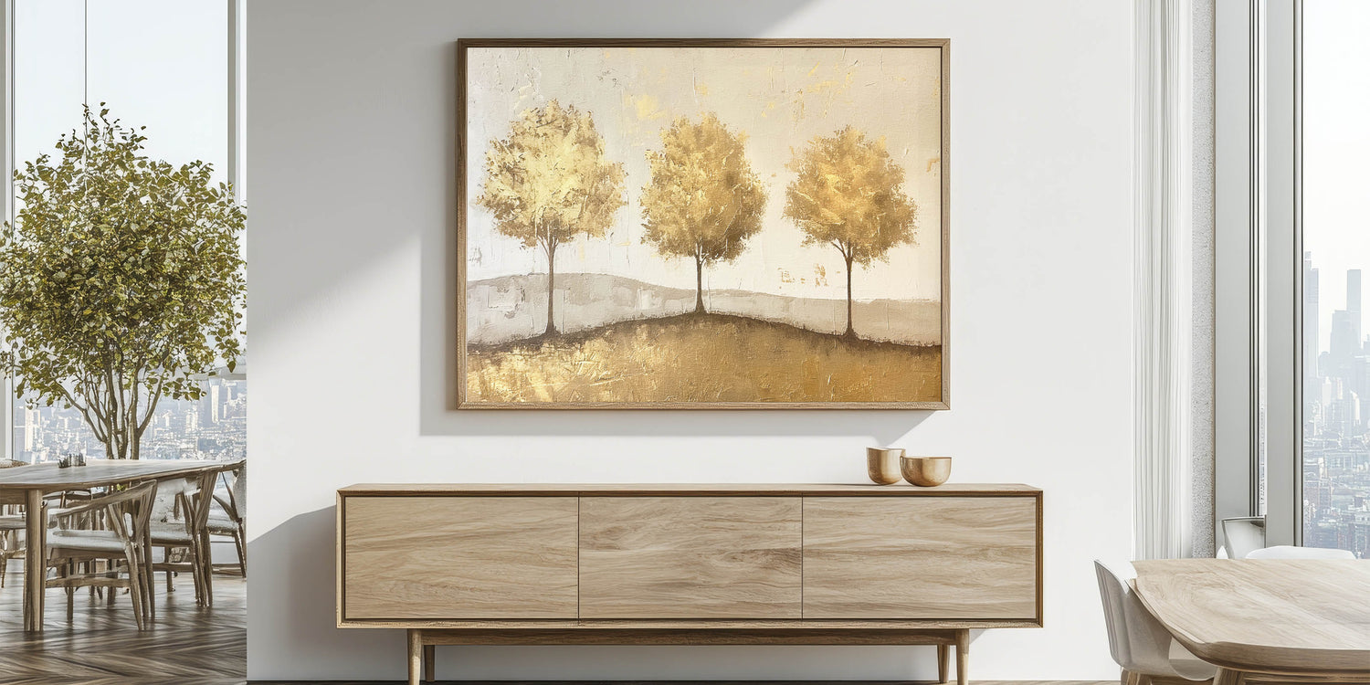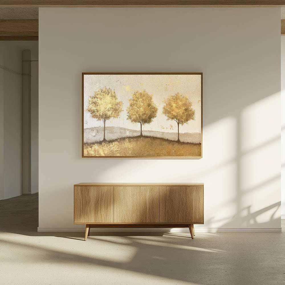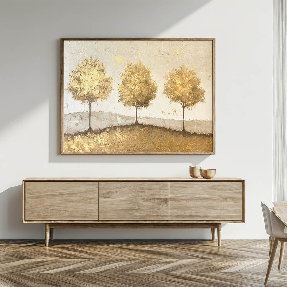 This elegant abstract landscape features a trio of golden trees standing gracefully on a subtle, textured background. With warm shades of gold and beige, this artwork radiates a sense of harmony and sophistication, making it a perfect addition to any space. The golden trees and gentle texture create a timeless look that pairs beautifully with modern, rustic, and classic decor styles.