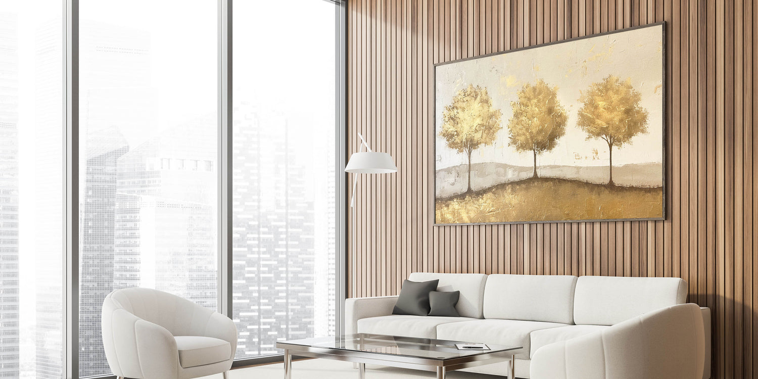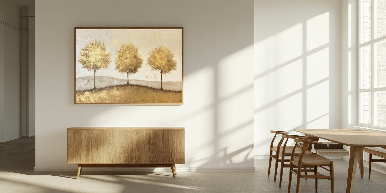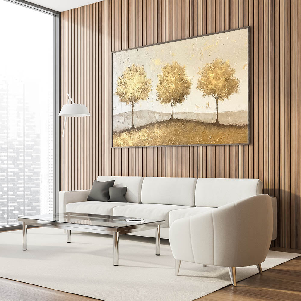 This elegant abstract landscape features a trio of golden trees standing gracefully on a subtle, textured background. With warm shades of gold and beige, this artwork radiates a sense of harmony and sophistication, making it a perfect addition to any space. The golden trees and gentle texture create a timeless look that pairs beautifully with modern, rustic, and classic decor styles.