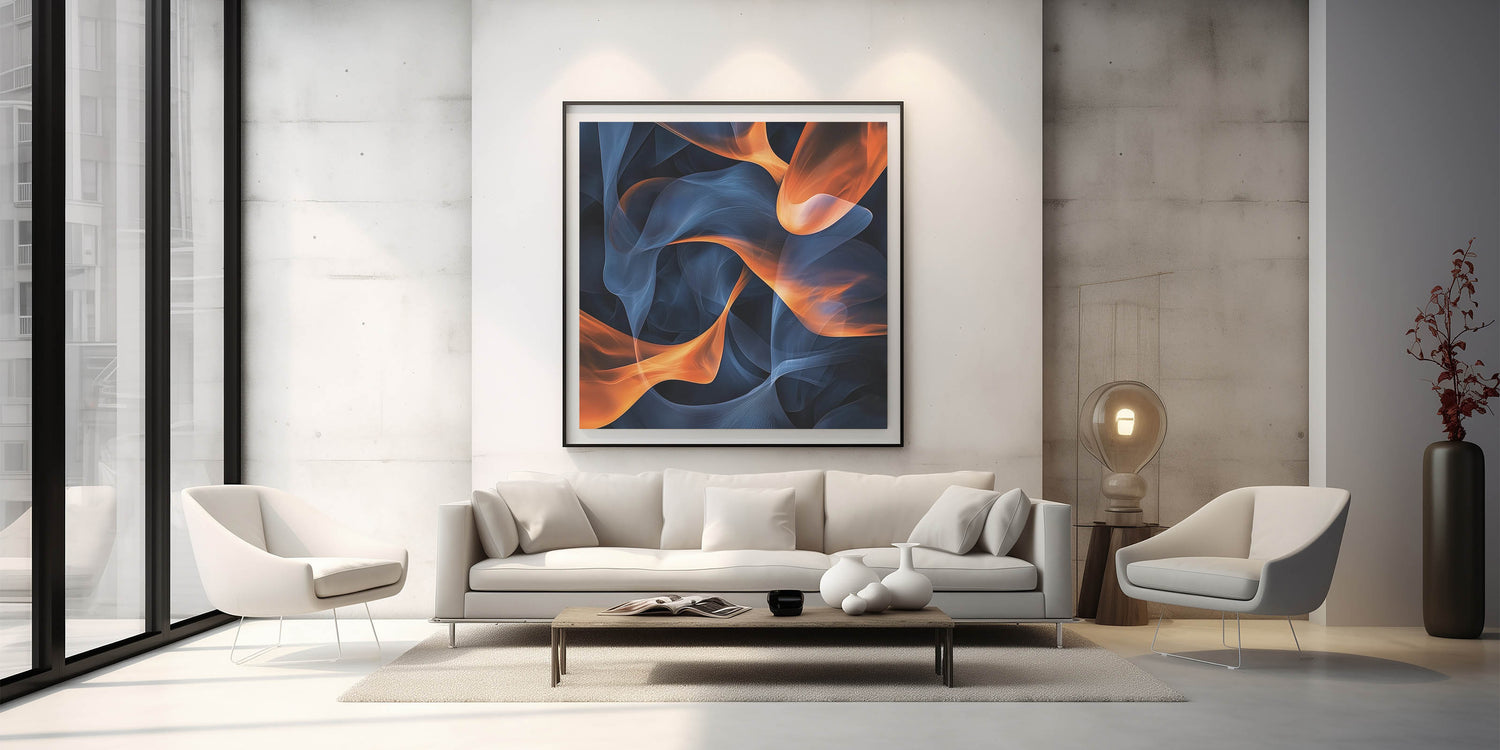 Add a touch of drama and movement to your space with this large abstract painting, a mesmerizing blend of deep navy blue and vibrant fiery orange. This modern abstract wall art features fluid, smoke-like swirls that create a sense of energy and depth, making it a perfect statement piece for contemporary interiors. The high-contrast color palette brings warmth and intensity, making this artwork a striking focal point for any room.