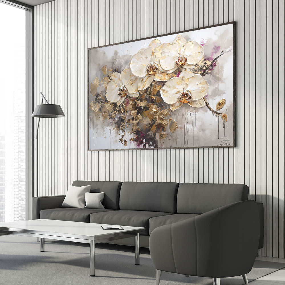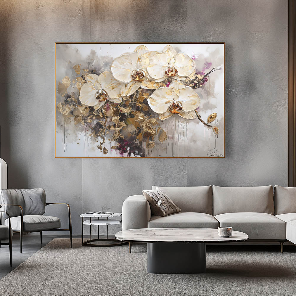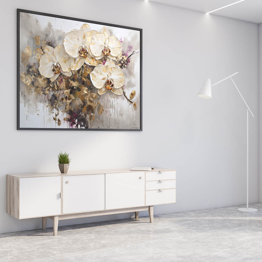 Elevate your home decor with this breathtaking abstract floral art, showcasing elegant white orchids accentuated with shimmering gold details. This sophisticated piece blends modern artistry with timeless botanical beauty, making it a luxurious statement for any interior. The dramatic contrast of delicate petals against abstract splashes of gold and muted tones adds depth and visual intrigue to your space.