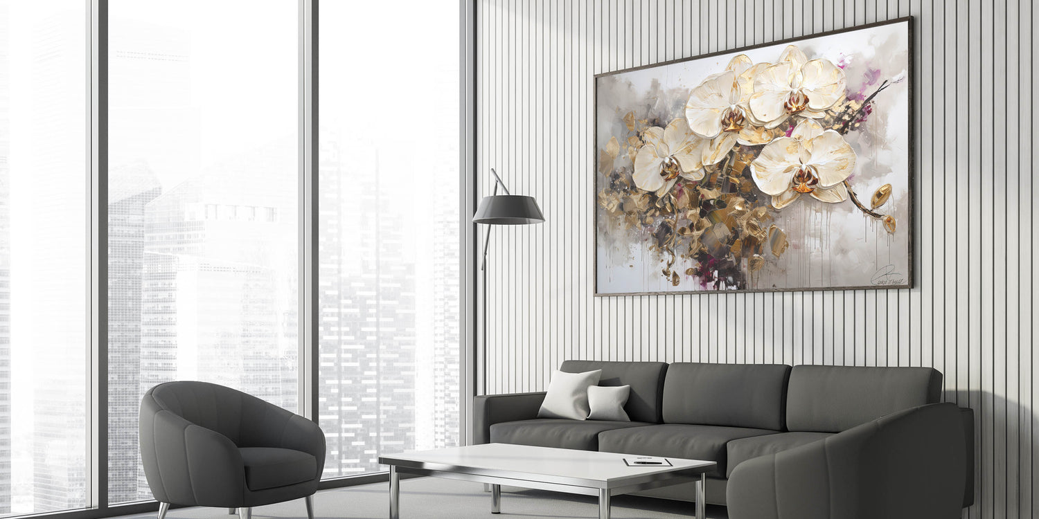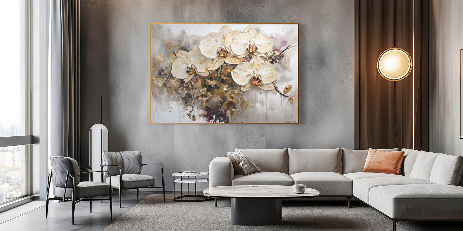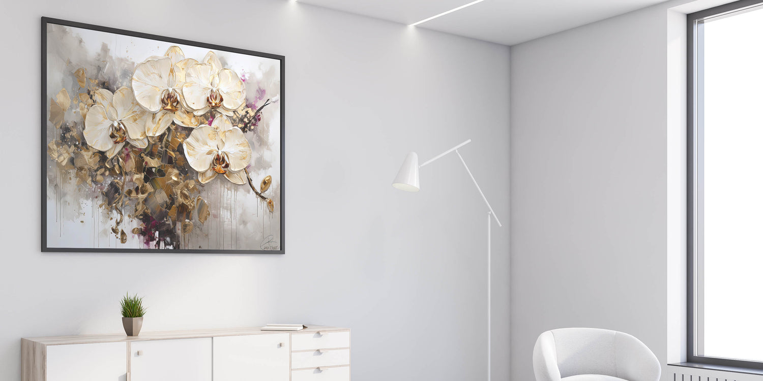 Elevate your home decor with this breathtaking abstract floral art, showcasing elegant white orchids accentuated with shimmering gold details. This sophisticated piece blends modern artistry with timeless botanical beauty, making it a luxurious statement for any interior. The dramatic contrast of delicate petals against abstract splashes of gold and muted tones adds depth and visual intrigue to your space.