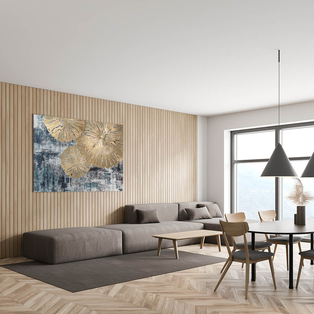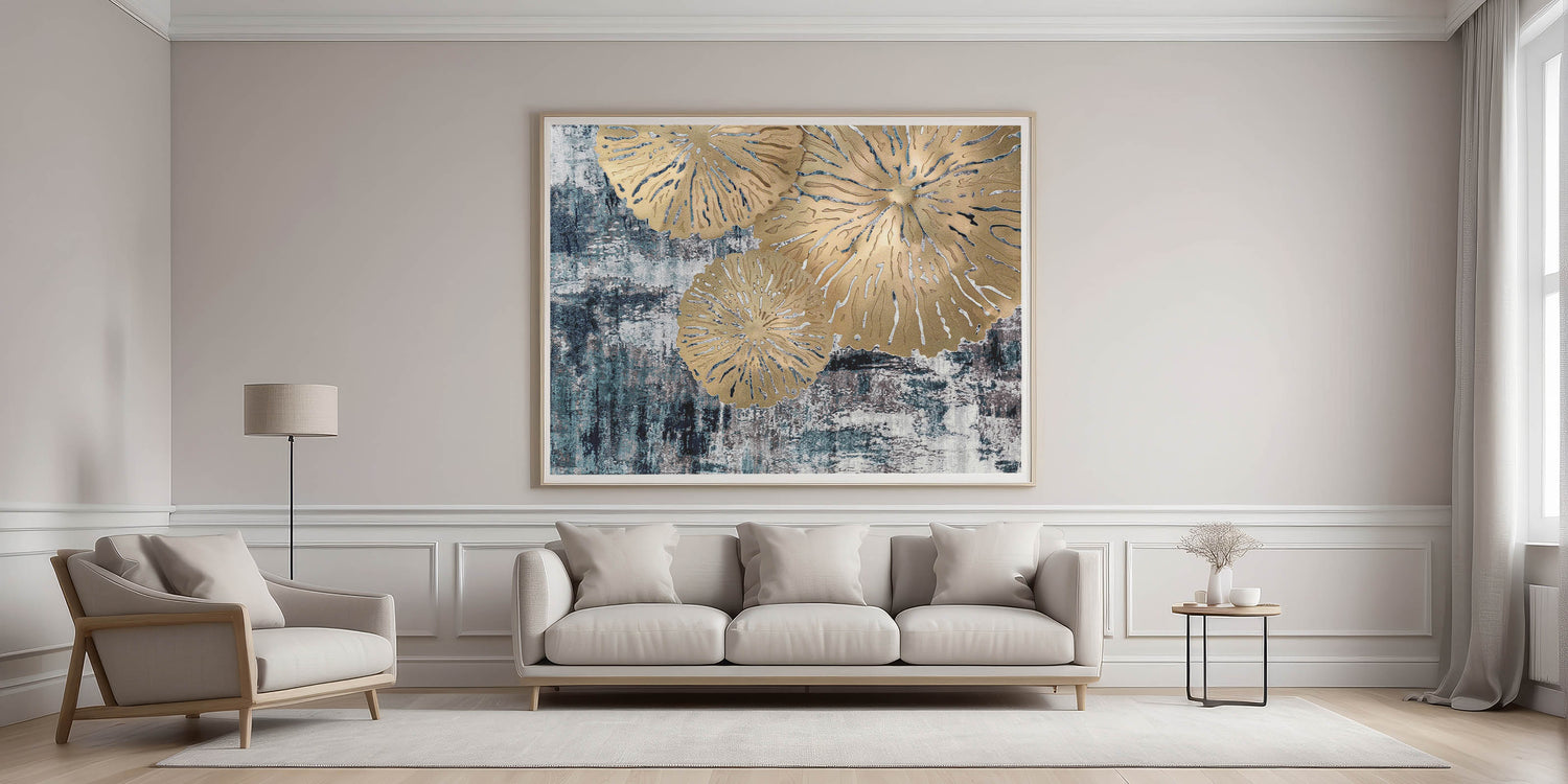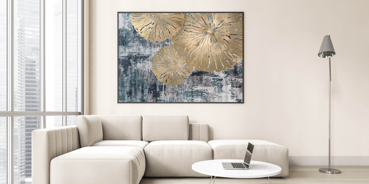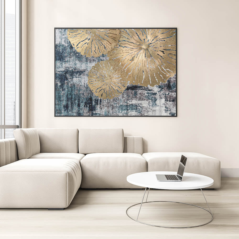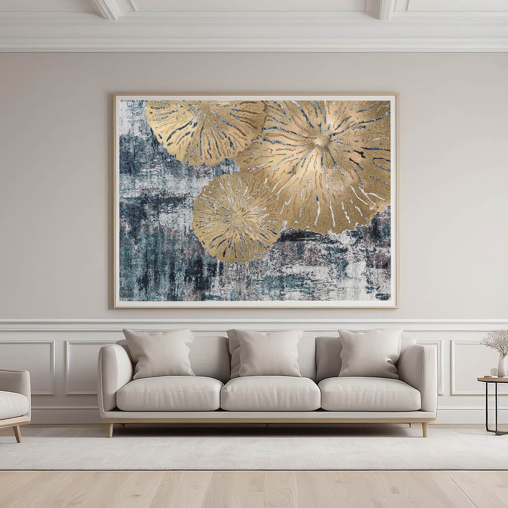 Add a touch of luxury to your home with this stunning gold botanical abstract art piece. The design features intricately textured gold floral elements that radiate against a background of deep blue, gray, and white tones. The combination of rich colors and detailed patterns creates a captivating and elegant piece that will enhance any modern interior. This artwork is perfect for those who appreciate sophisticated and contemporary designs with a hint of natural inspiration.
