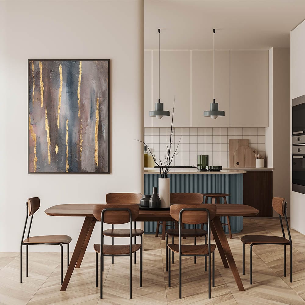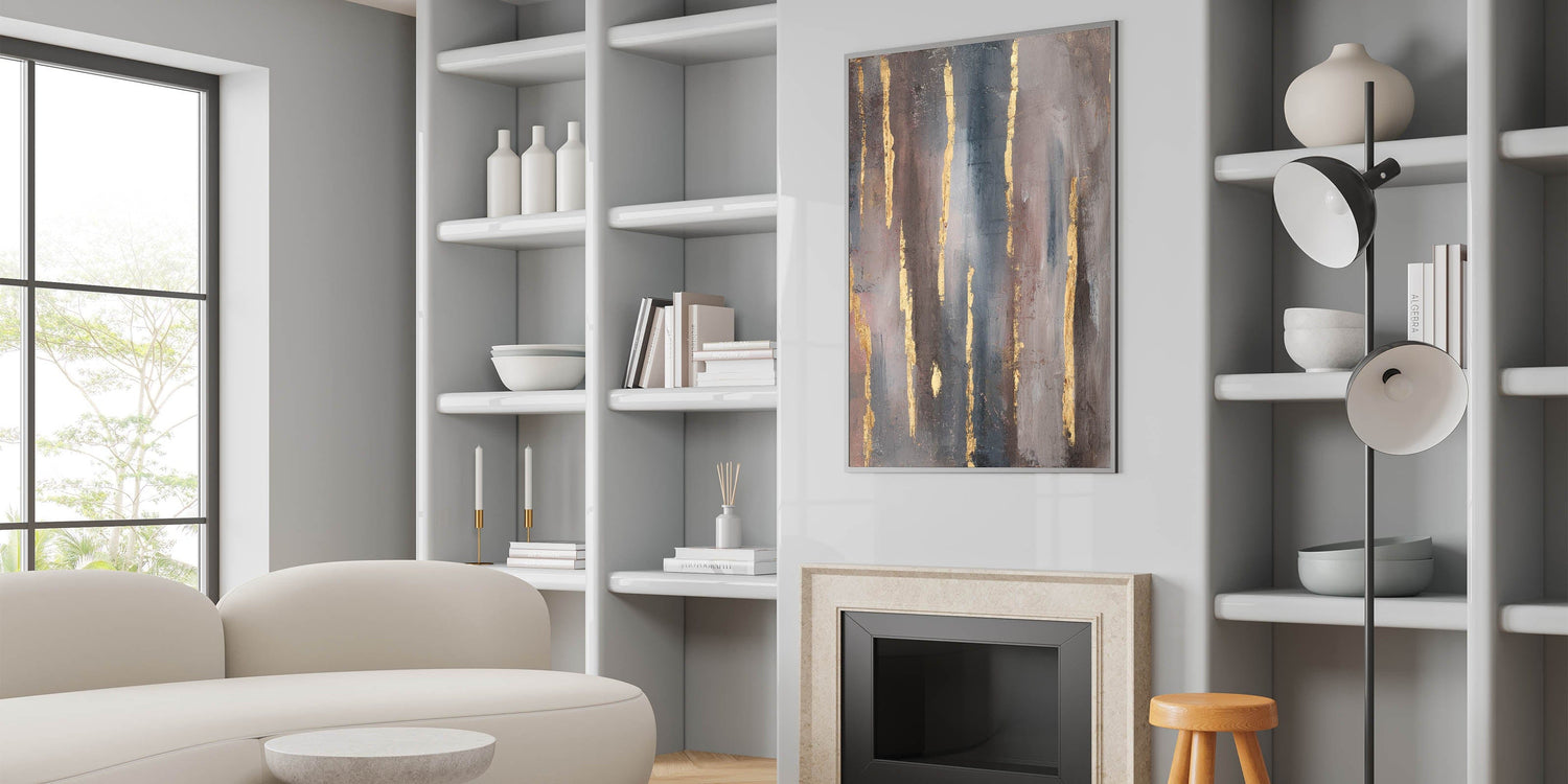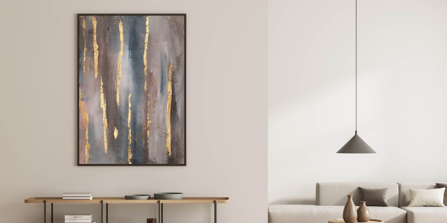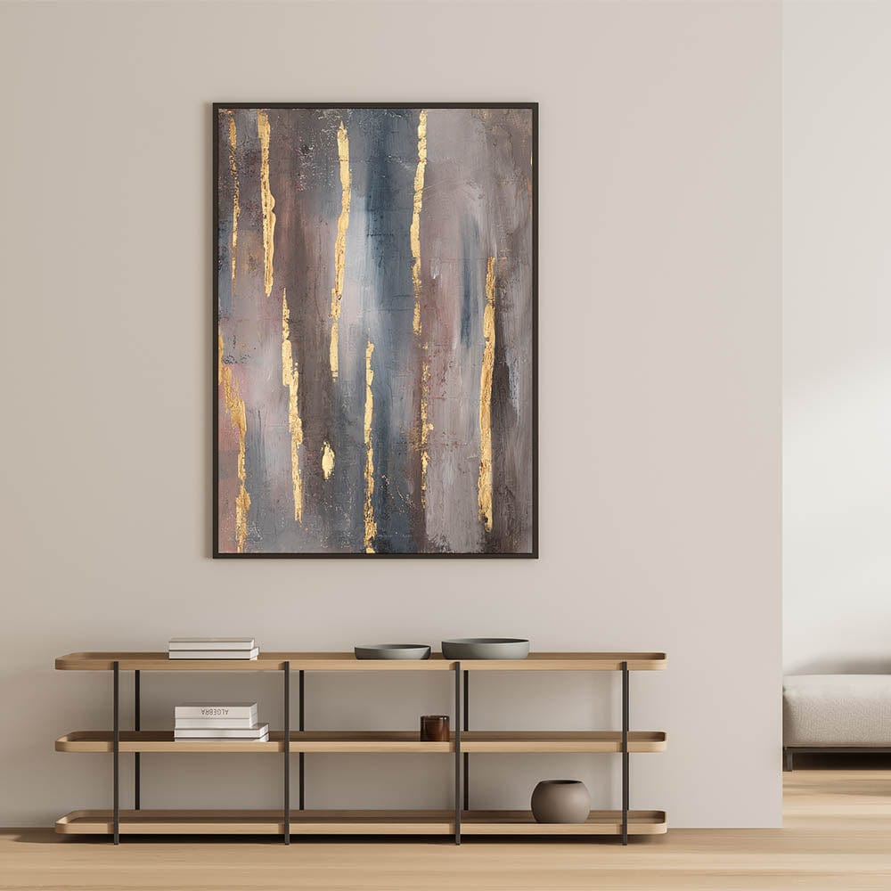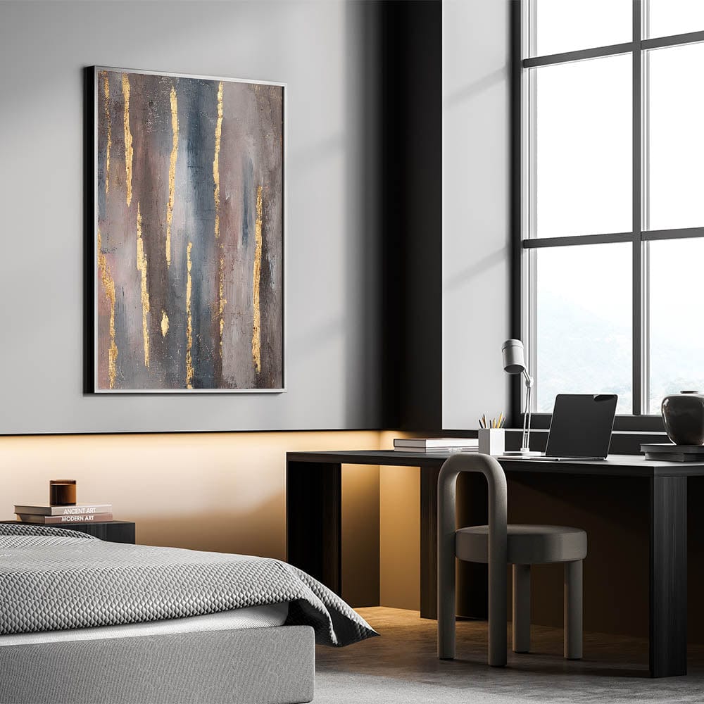 Introduce elegance and depth to your decor with this moody modern wall art, featuring a striking blend of gray, gold, and brown tones. The vertical gold accents contrast beautifully with the rich, moody hues, creating a sophisticated and artistic appeal. This abstract wall art brings a sense of modern luxury to contemporary interiors, making it an ideal statement piece for homes, offices, or creative spaces.