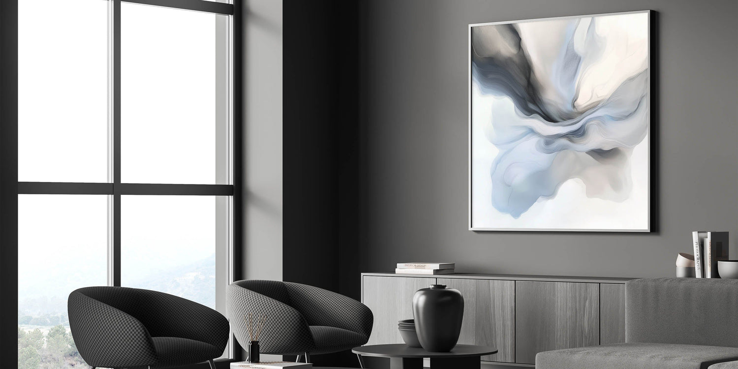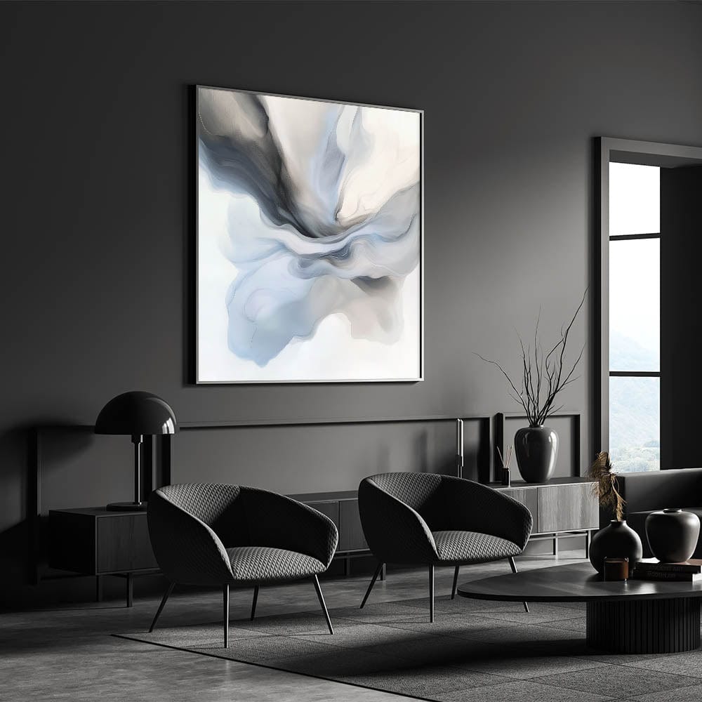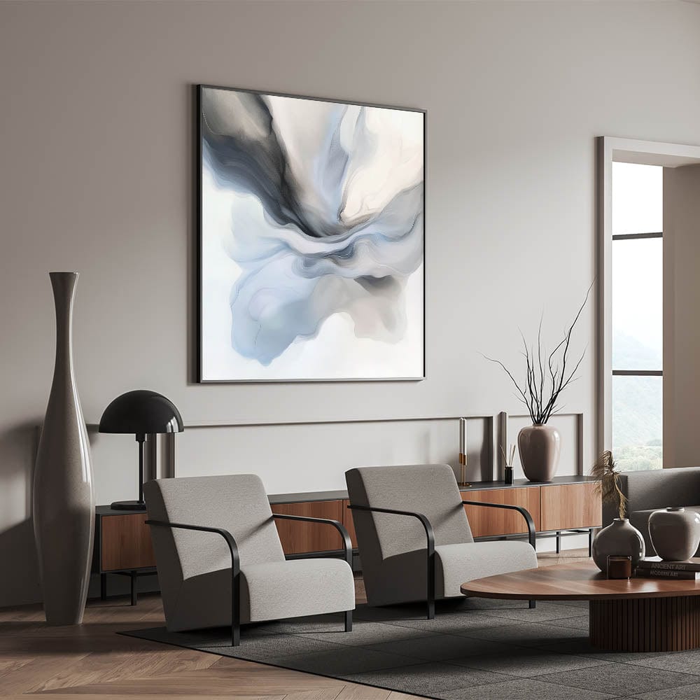 Immerse your space in calm with “Cloud Bloom in Gray, Blue & White,” a minimalist abstract wall art design inspired by soft movement and atmospheric flow. This contemporary abstract canvas captures elegant swirls of pale gray, charcoal, white, and hints of blue, resembling blooming petals or gentle clouds unfolding.