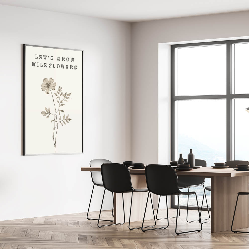 This minimalist wall art features a beautiful, nature-inspired design with the phrase "Let’s Grow Wildflowers" delicately placed above a hand-drawn flower and foliage. The subtle tones and clean composition make it a perfect addition to minimalist home decor, adding a touch of nature and positivity to your space. Its minimalist art style brings both elegance and tranquility to any room.