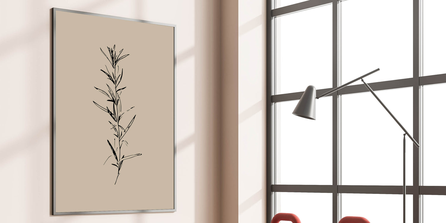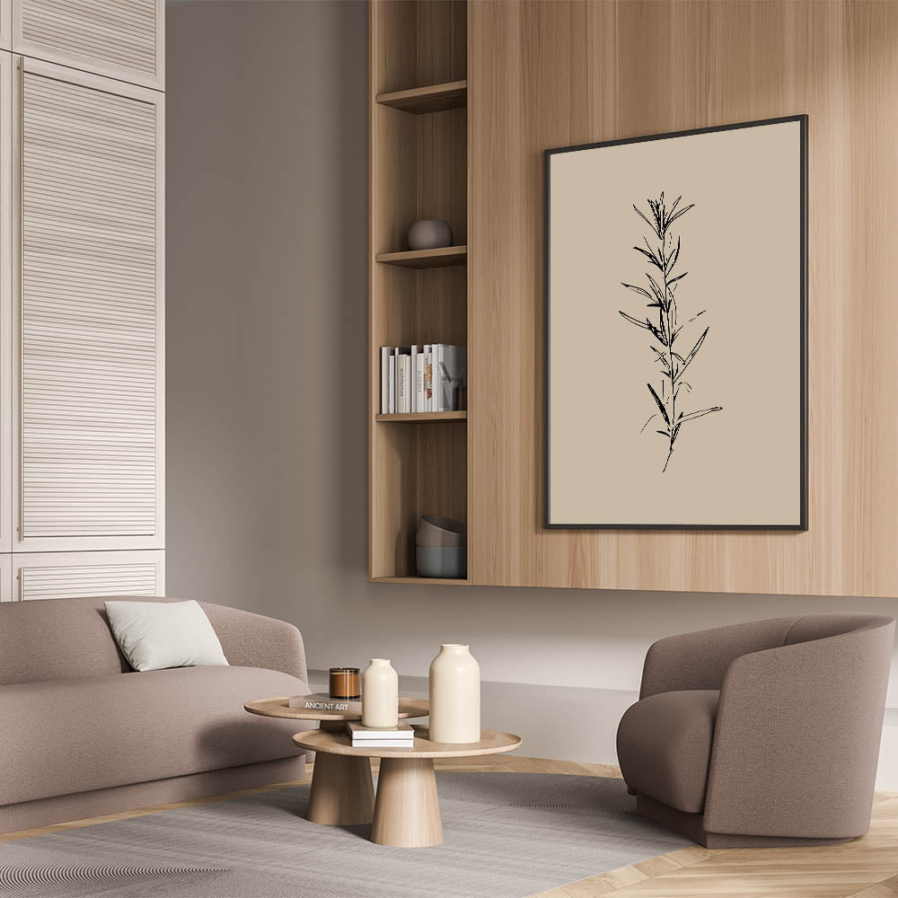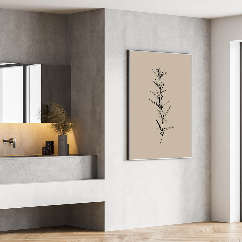 Enhance your space with this minimalist botanical line art, featuring an elegant depiction of a plant stem in sleek black lines against a muted beige background. This simple yet sophisticated artwork captures the essence of modern minimalist design, perfect for bringing a touch of nature-inspired elegance into contemporary interiors. Its clean lines and subtle palette make it a versatile piece, ideal for any room in the home.