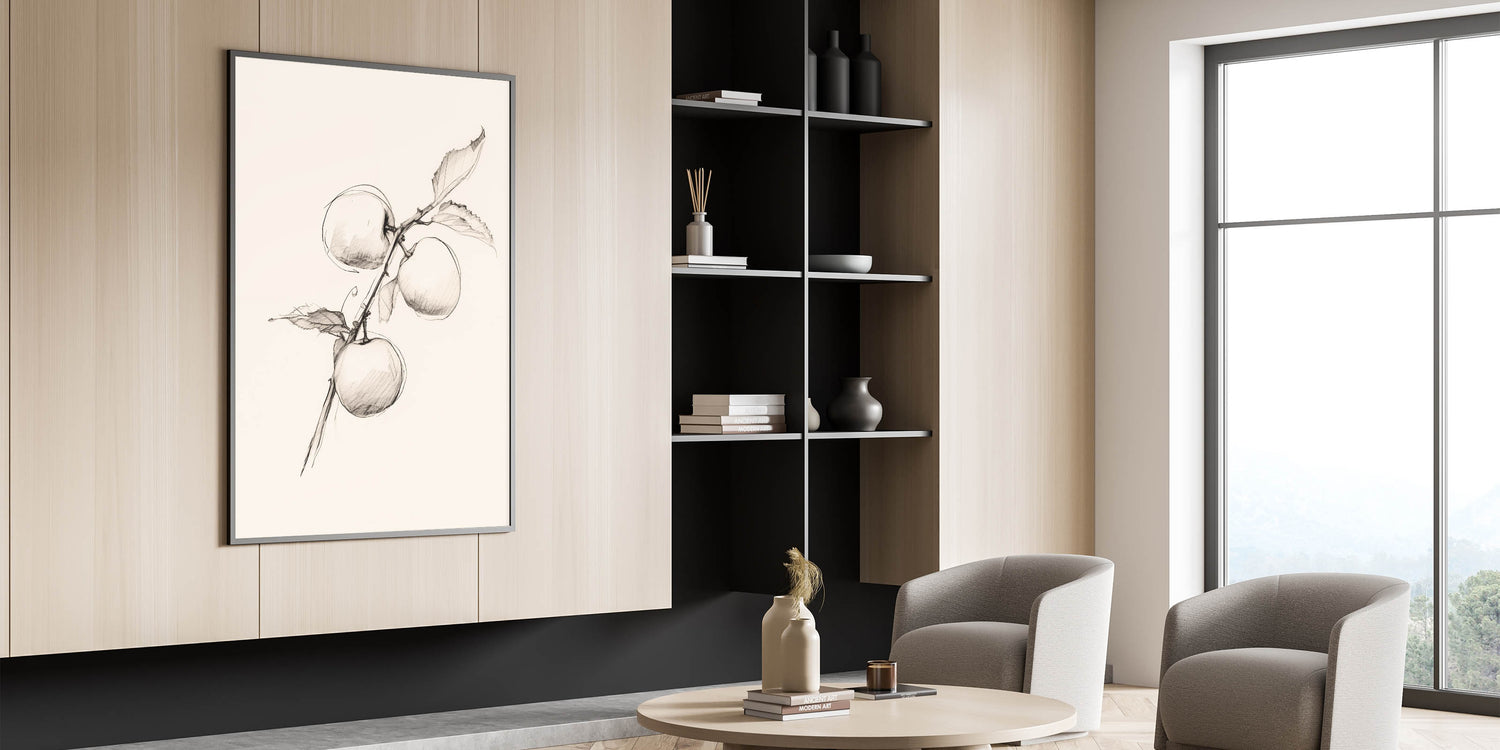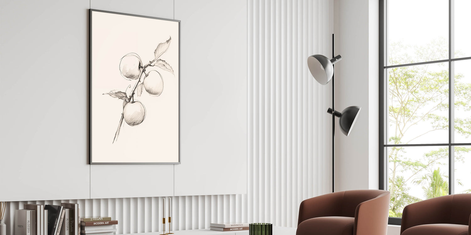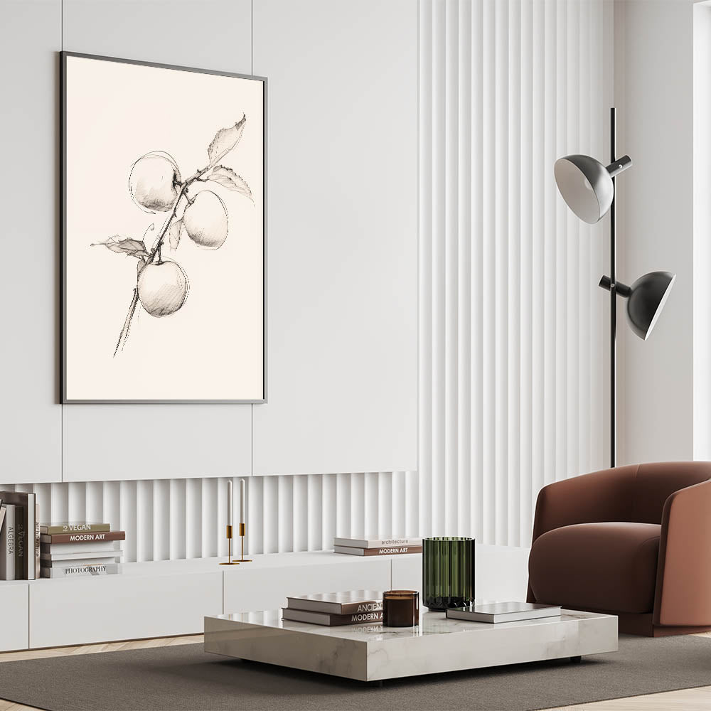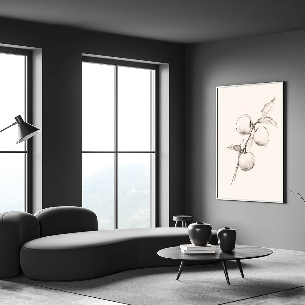 Introduce a touch of natural beauty to your space with this Minimalist Fruit Art, featuring a detailed apple sketch. The precise lines and subtle shading capture the essence of fresh fruit on a branch, making this artwork a perfect addition to any modern or classic decor.