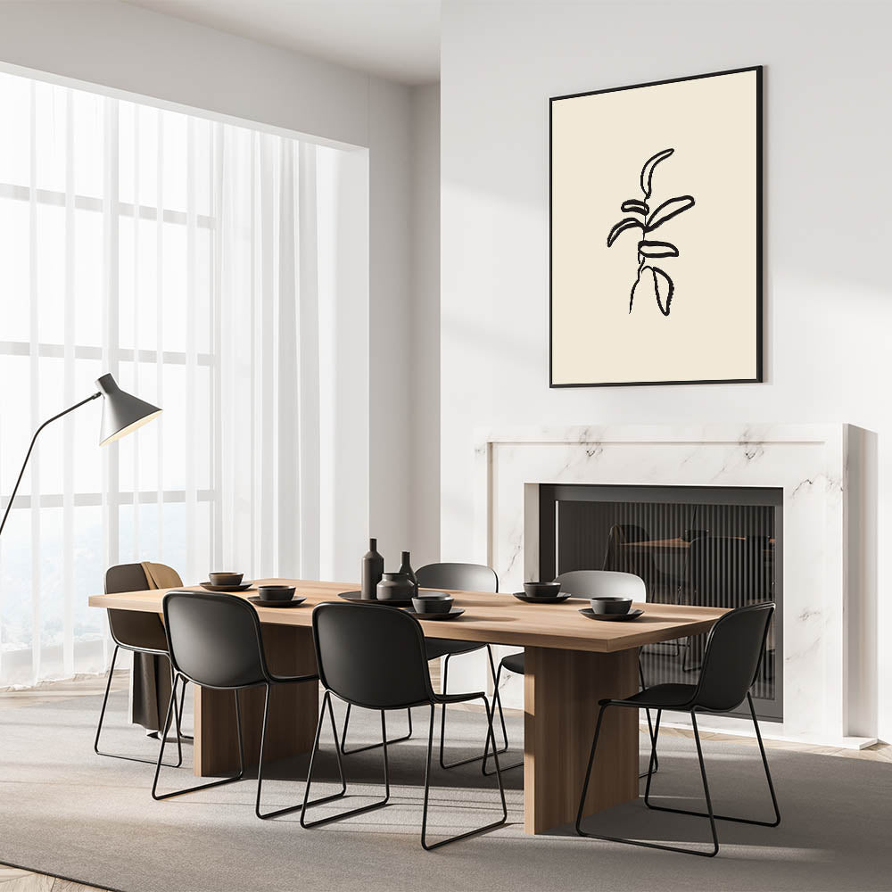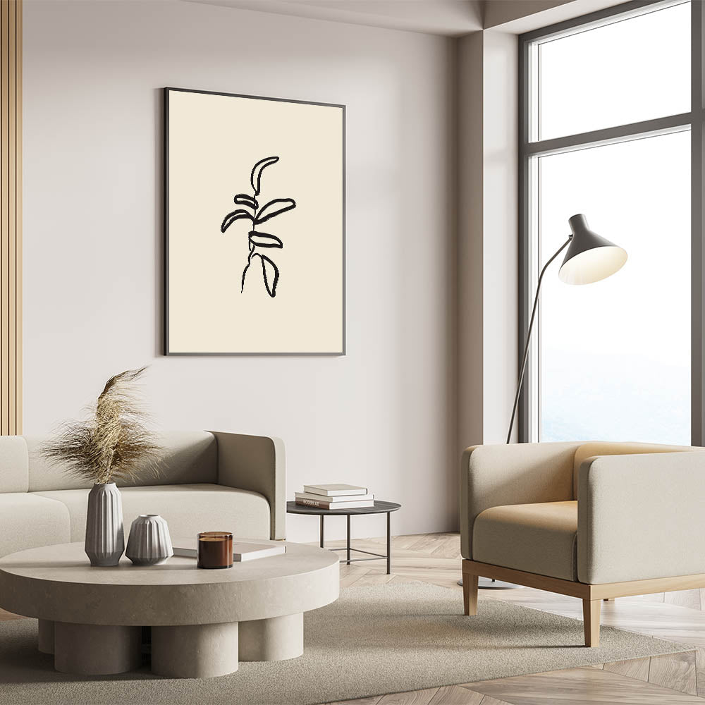 This elegant minimalist wall art features a sleek black line drawing of a plant on a soft beige background. The simple, clean lines evoke a sense of calm and serenity, making it the perfect addition to any contemporary or minimalist home decor. The understated design allows the natural beauty of the plant to shine through, bringing a touch of nature into your living space.