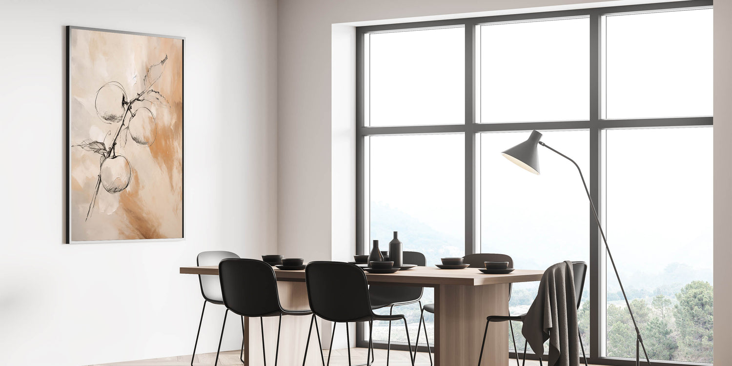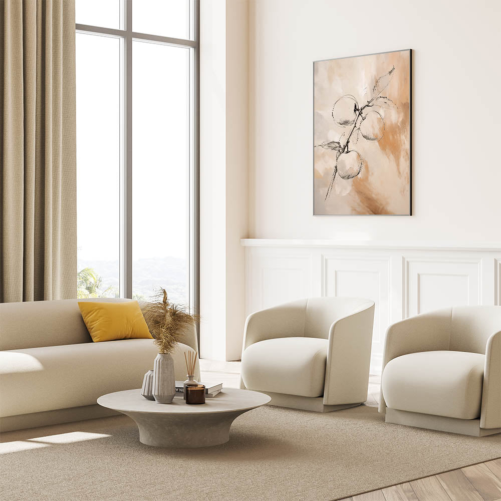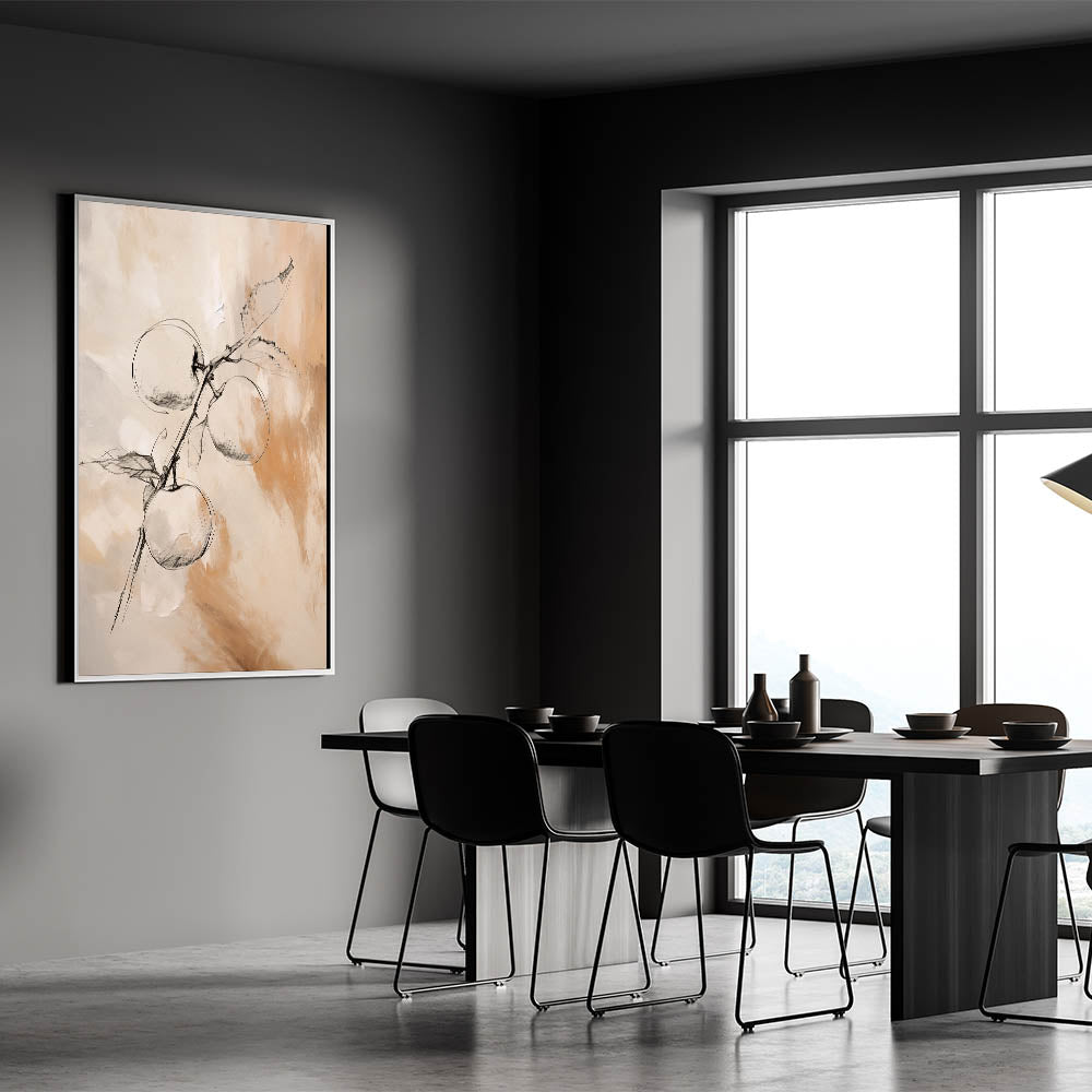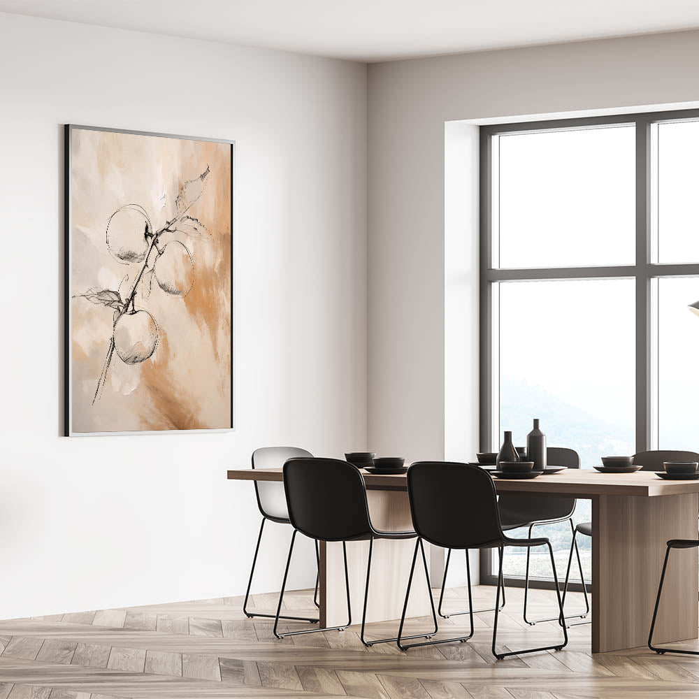 Add a touch of nature to your modern home with this stunning minimalist wall art featuring a delicate sketch of apples on a branch. The combination of fine black lines with soft beige and cream tones creates a beautiful balance between simplicity and elegance. This piece is perfect for spaces that value natural inspiration while maintaining a minimalist aesthetic, making it ideal for kitchens, dining areas, or living rooms.