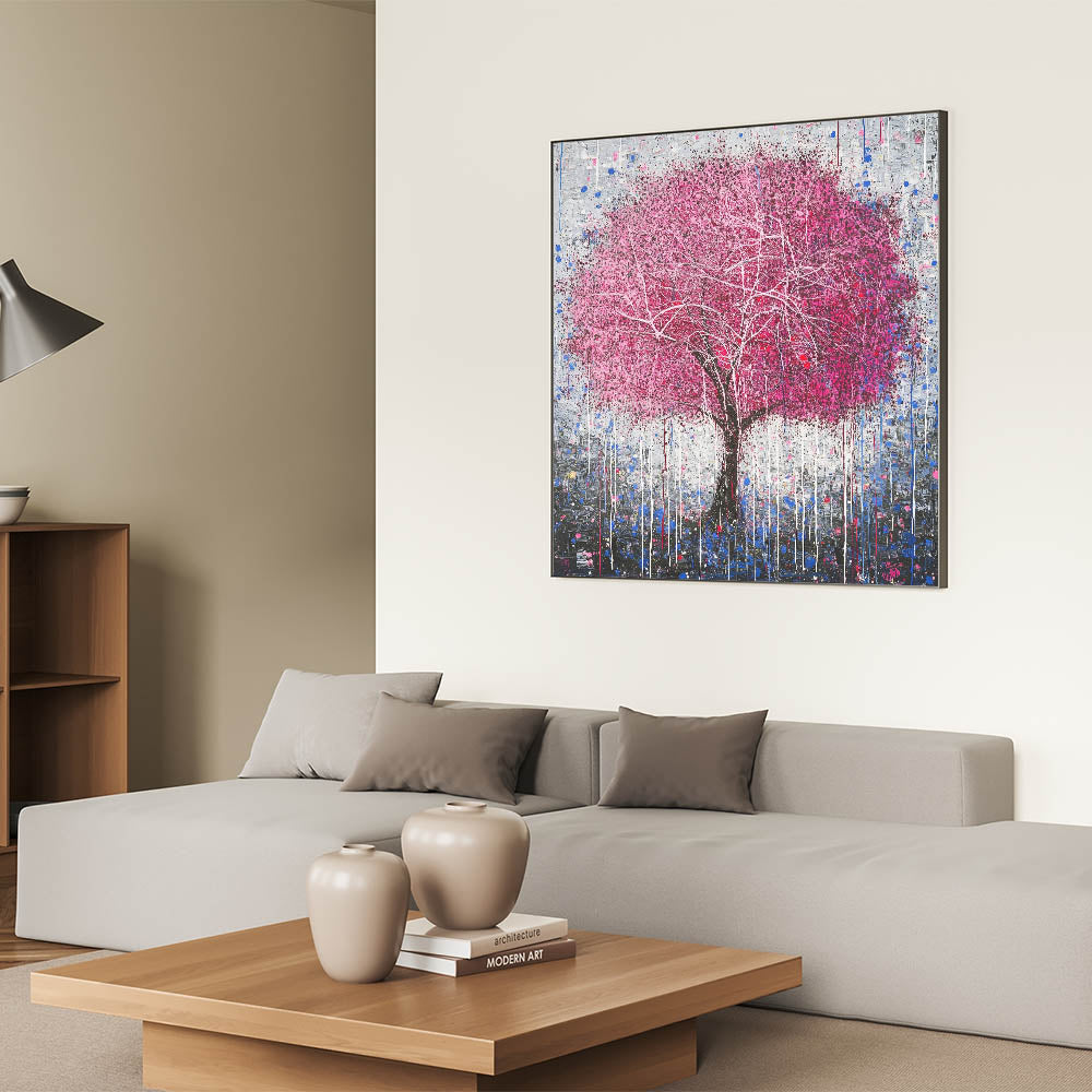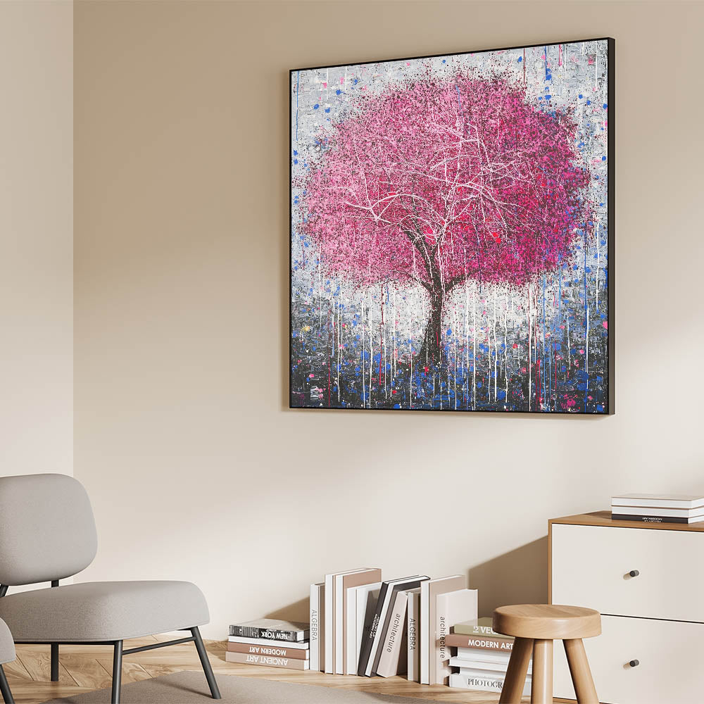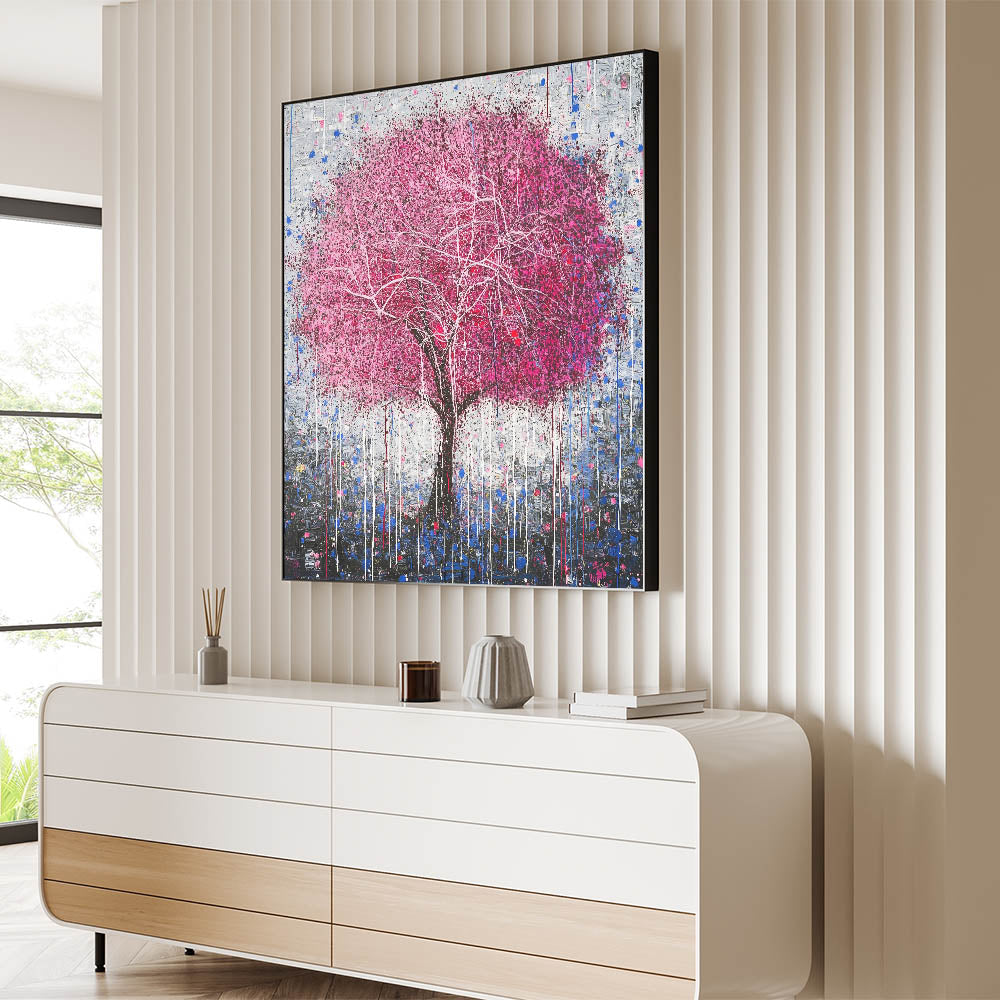 Add a bold and artistic touch to your home with this Modern Abstract Floral Tree Art. Featuring a striking pink tree with delicate white branches, this design is set against a textured gray and blue backdrop. The dripping paint details add a unique, contemporary flair, making it an eye-catching centerpiece for any room. Perfect for modern living spaces, bedrooms, or offices, this vibrant artwork combines creativity with sophistication.