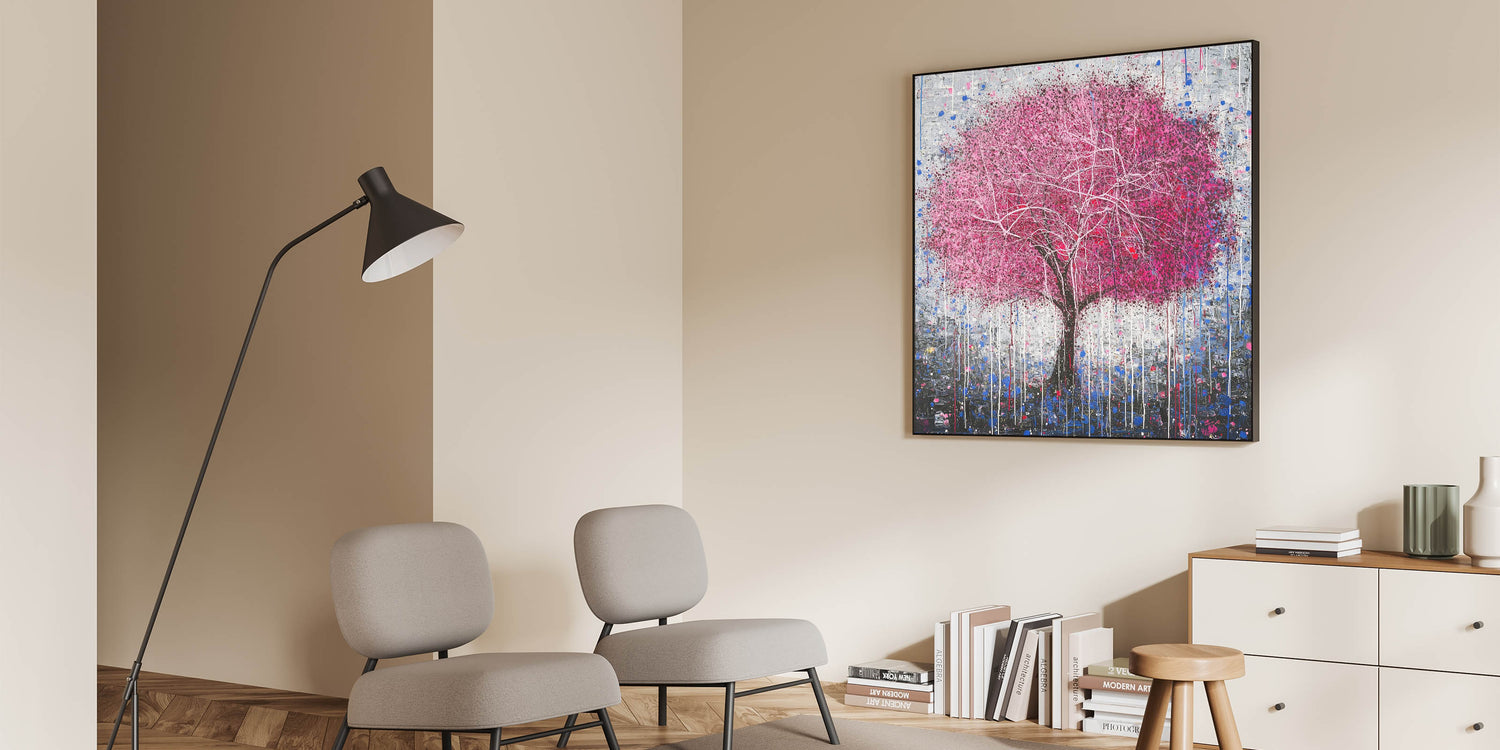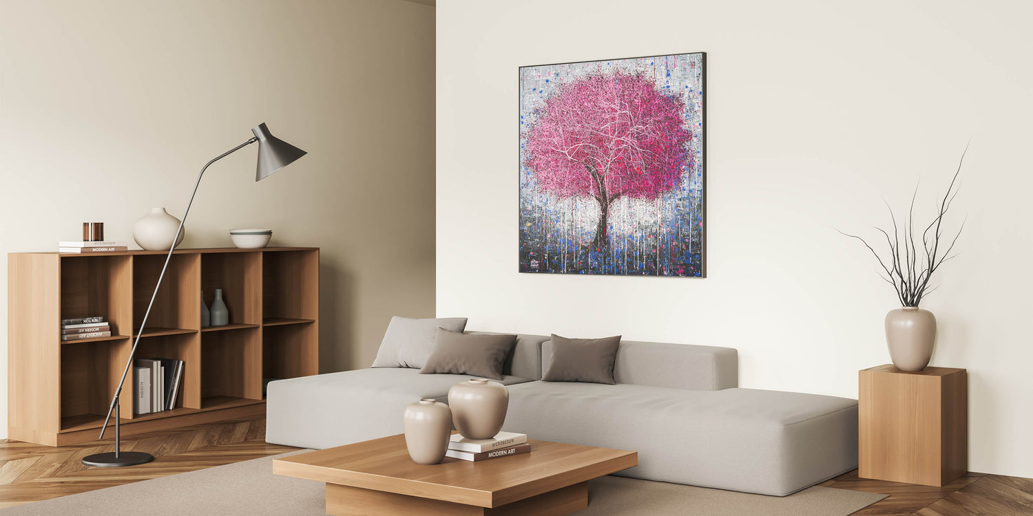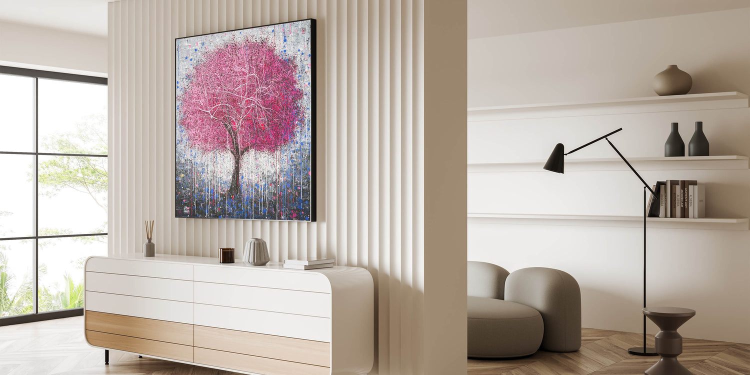 Add a bold and artistic touch to your home with this Modern Abstract Floral Tree Art. Featuring a striking pink tree with delicate white branches, this design is set against a textured gray and blue backdrop. The dripping paint details add a unique, contemporary flair, making it an eye-catching centerpiece for any room. Perfect for modern living spaces, bedrooms, or offices, this vibrant artwork combines creativity with sophistication.