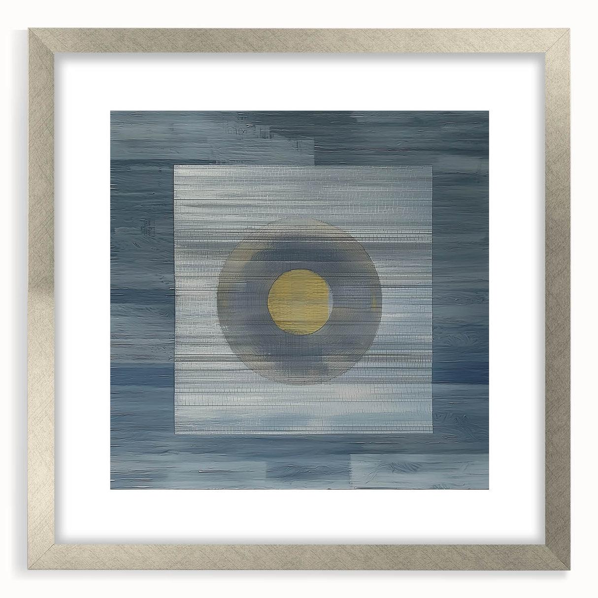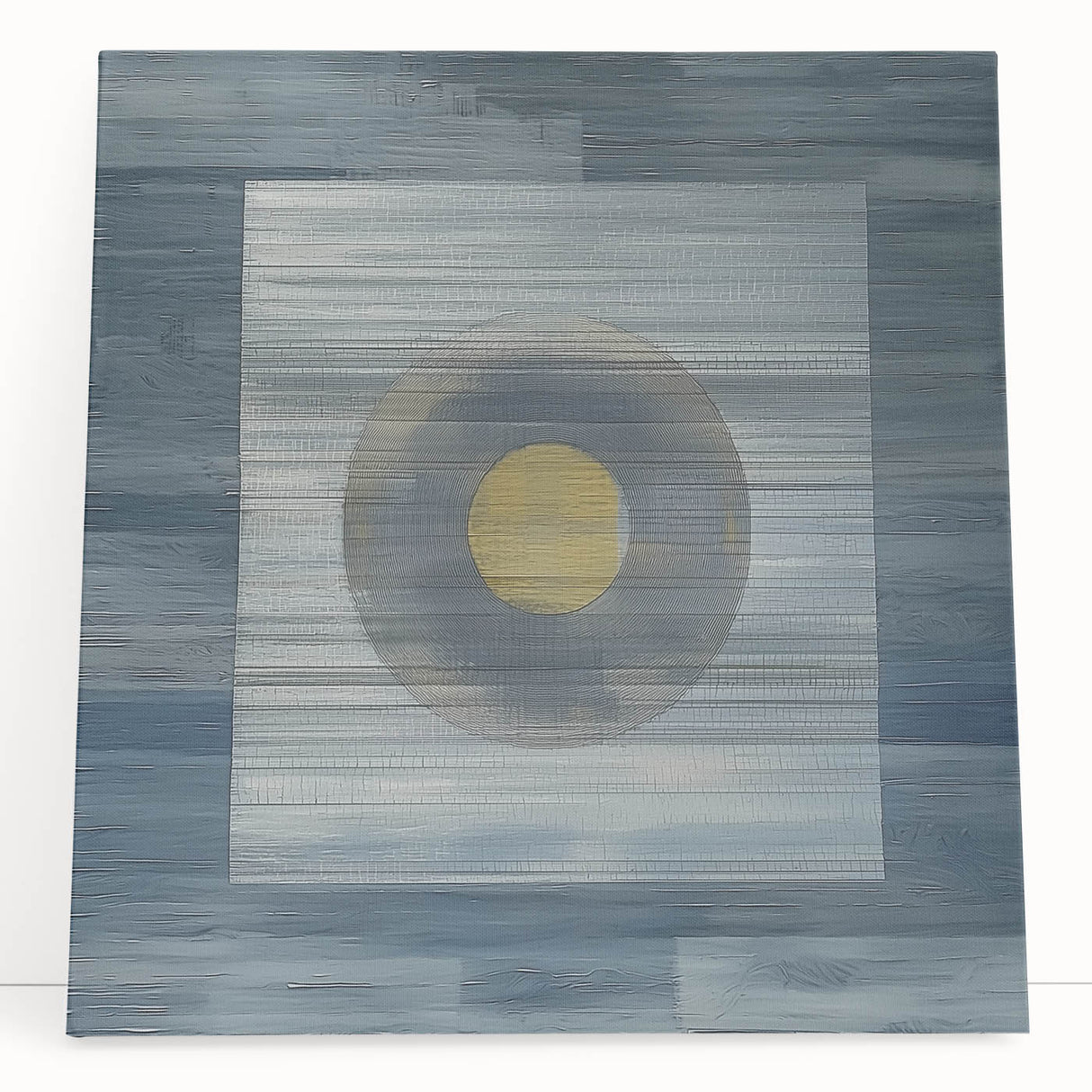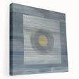 Elevate your space with this modern abstract wall art, featuring a minimalist geometric composition in deep blue, soft gray, and gold. The structured layering of textures and the central circular focal point create a mesmerizing balance of simplicity and depth. This geometric abstract painting is perfect for contemporary interiors, adding a sophisticated and artistic touch to any room.