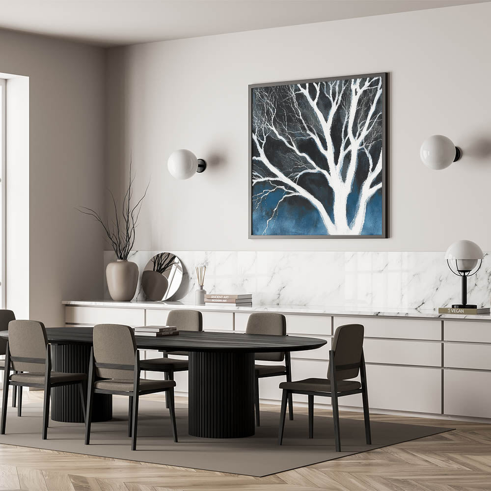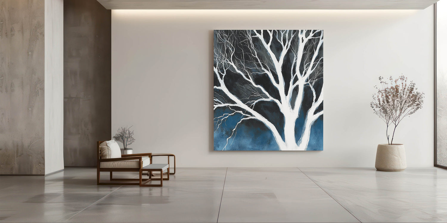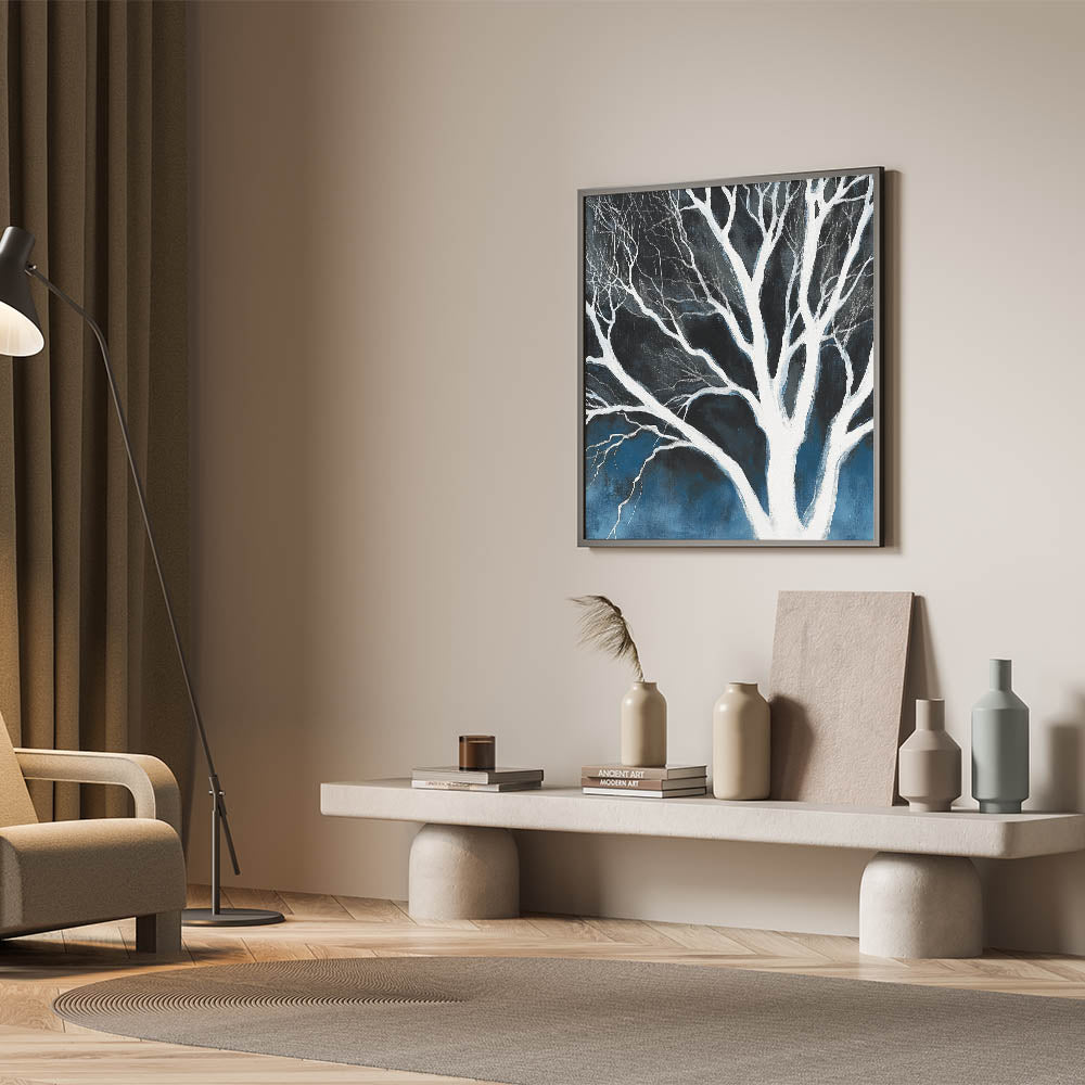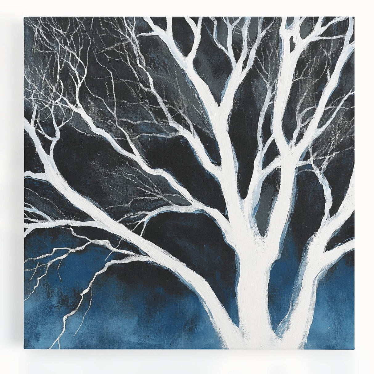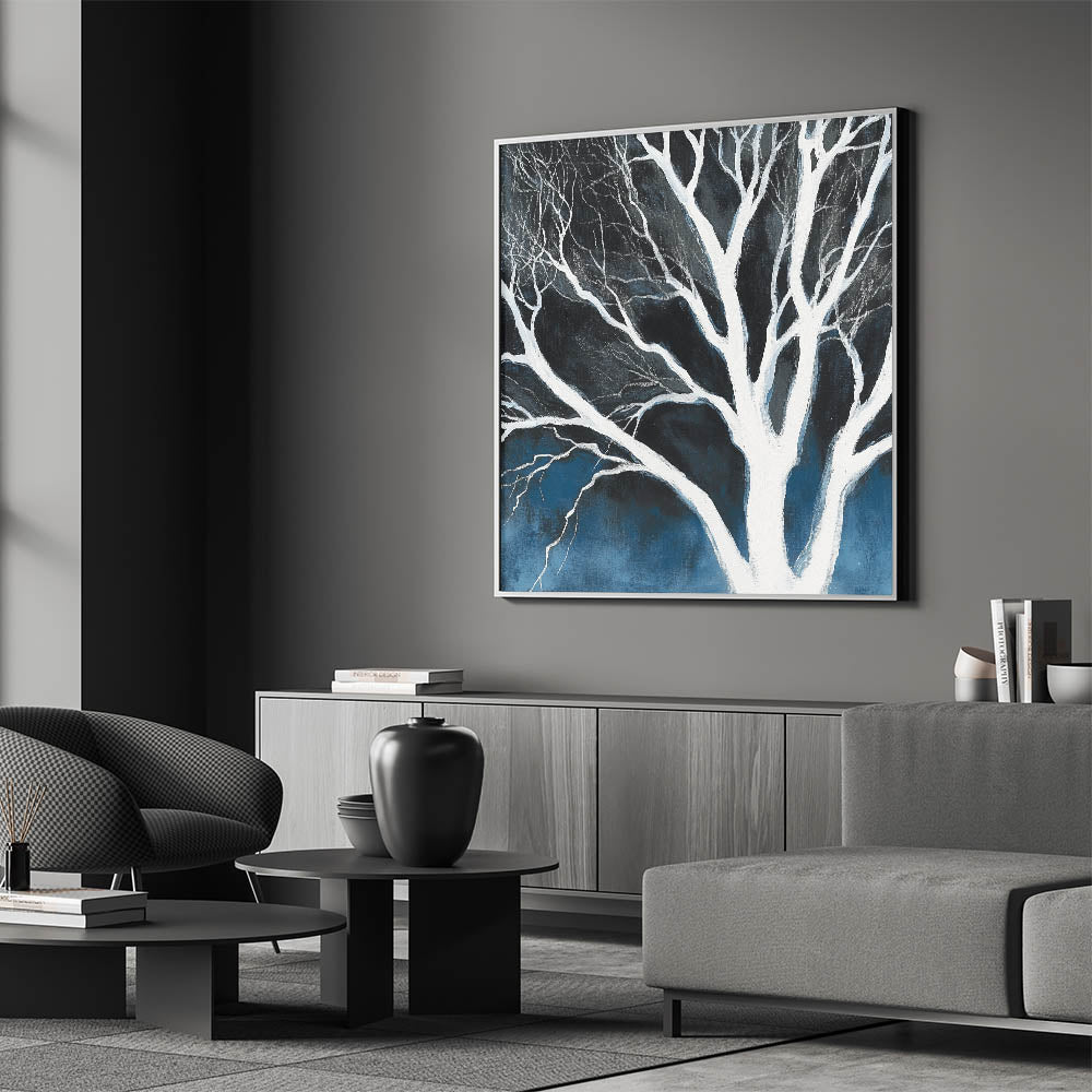 Bring bold contrast and minimalist elegance to your space with this modern abstract wall art featuring a striking white tree silhouette set against rich shades of deep blue and dark gray. Part of the Modern Abstract Collection, this piece captures a sense of quiet stillness through organic lines and stark color contrast, making it a perfect fit for both minimalist and contemporary interiors.