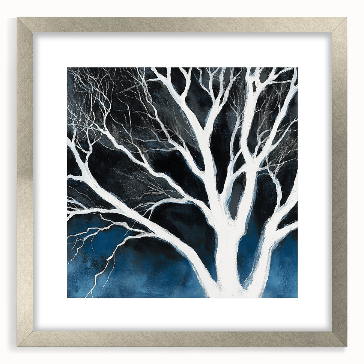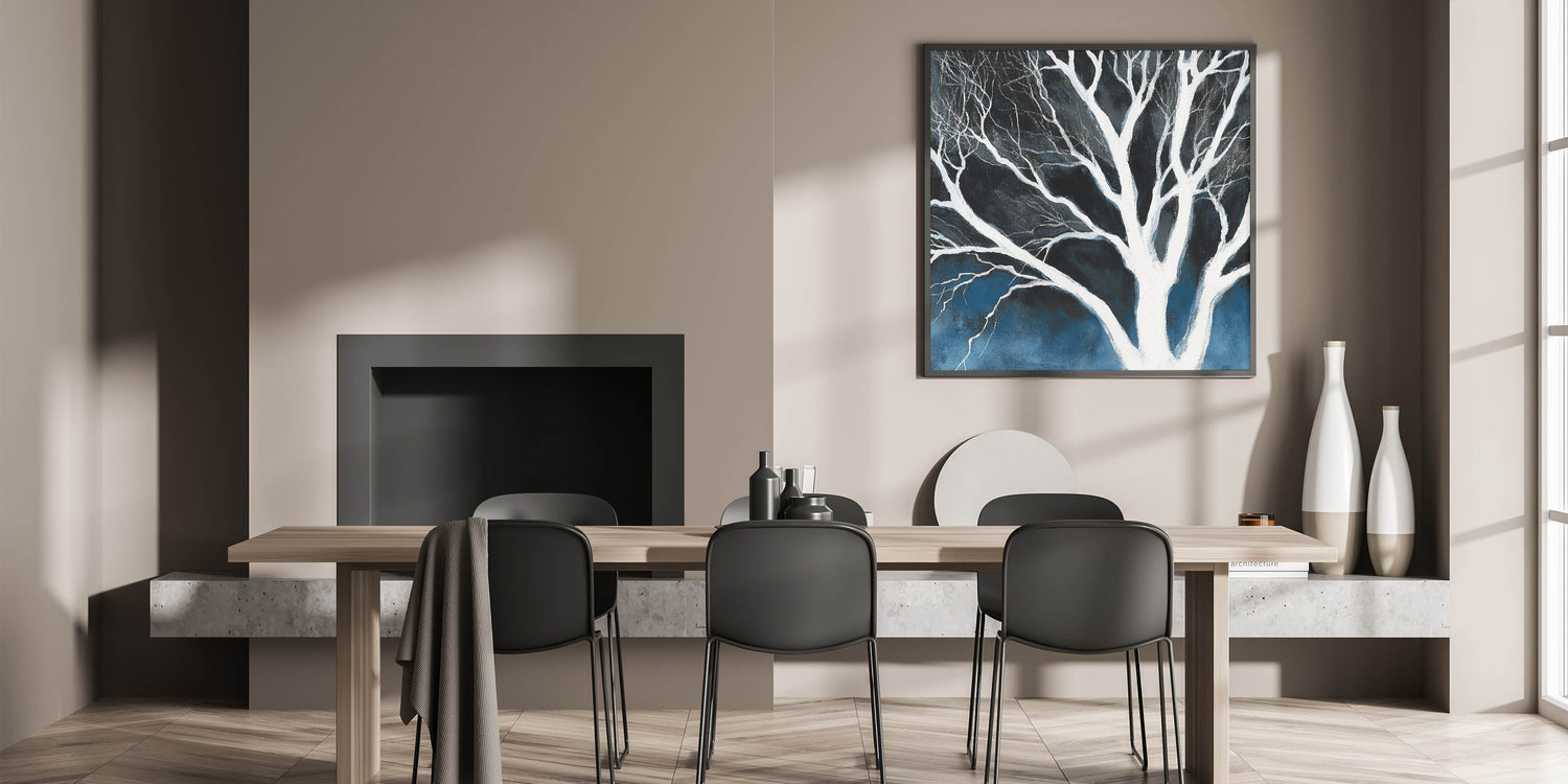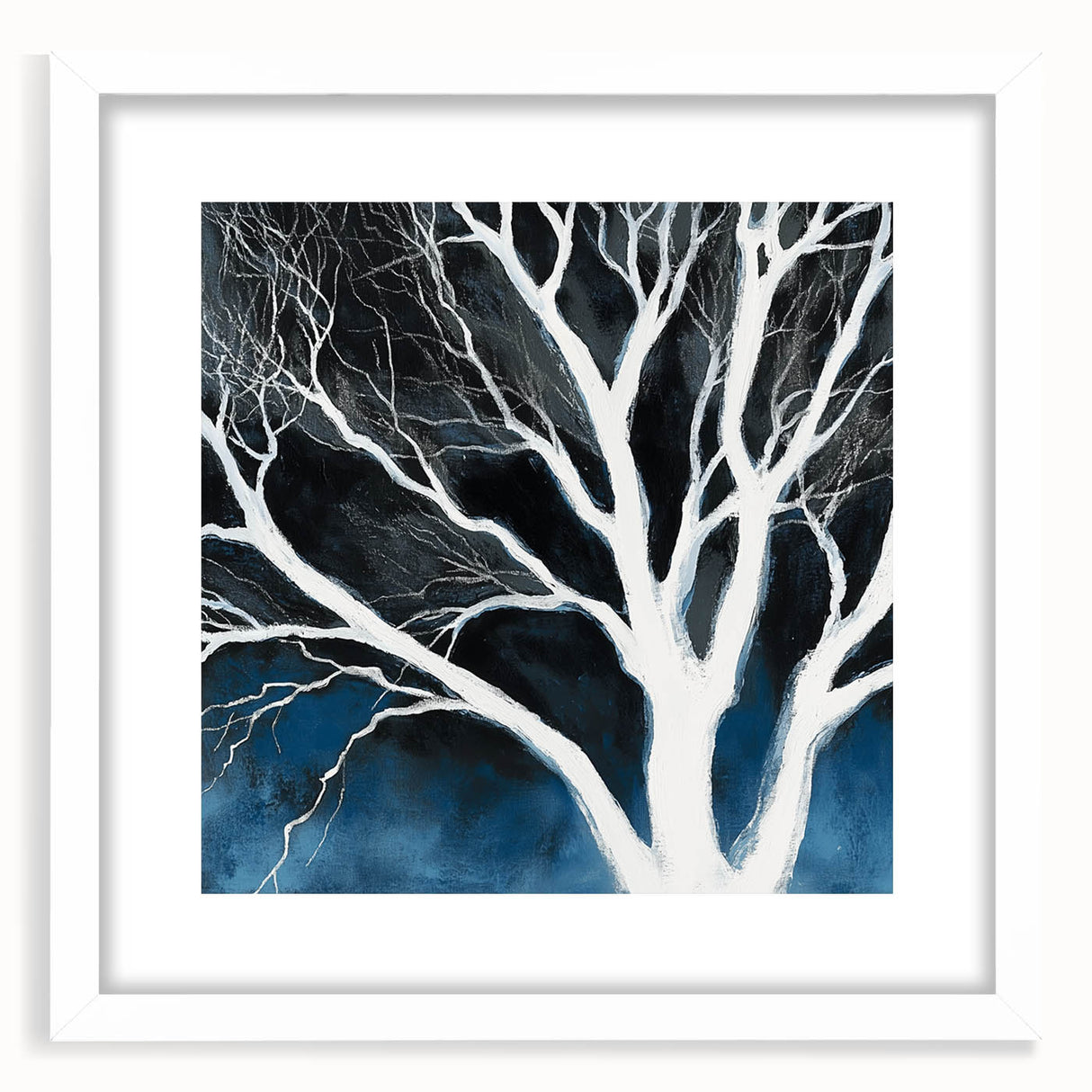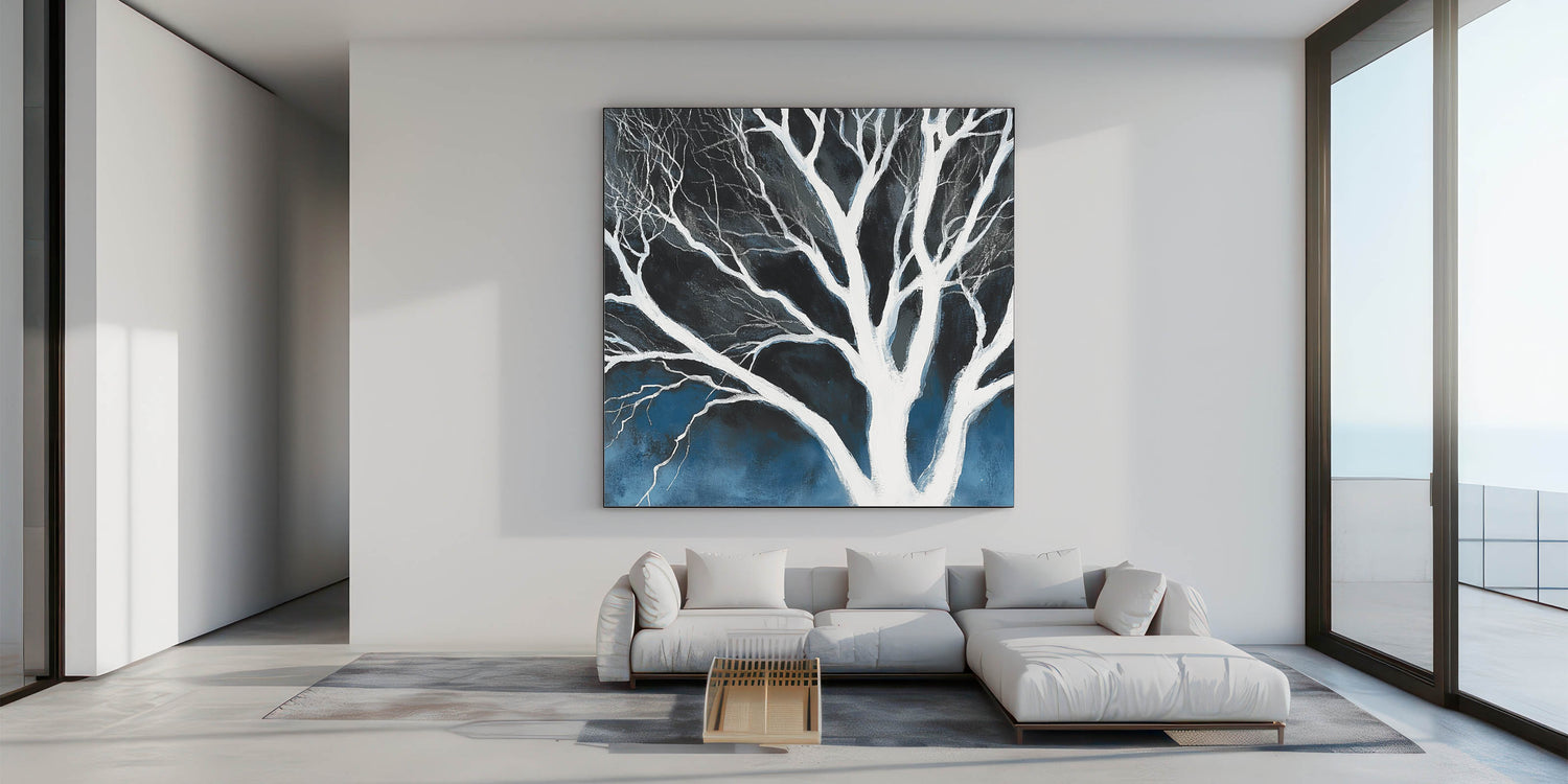 Bring bold contrast and minimalist elegance to your space with this modern abstract wall art featuring a striking white tree silhouette set against rich shades of deep blue and dark gray. Part of the Modern Abstract Collection, this piece captures a sense of quiet stillness through organic lines and stark color contrast, making it a perfect fit for both minimalist and contemporary interiors.