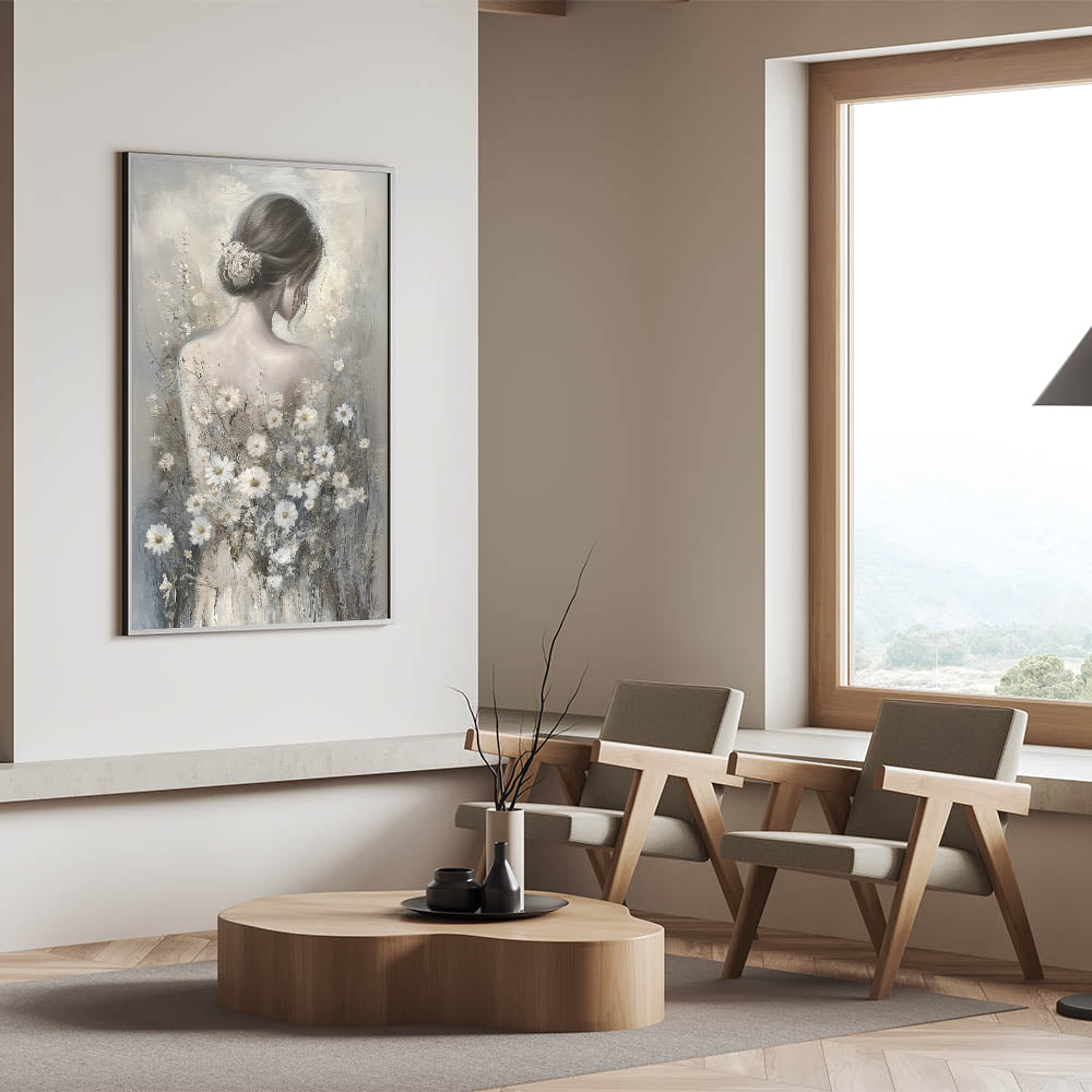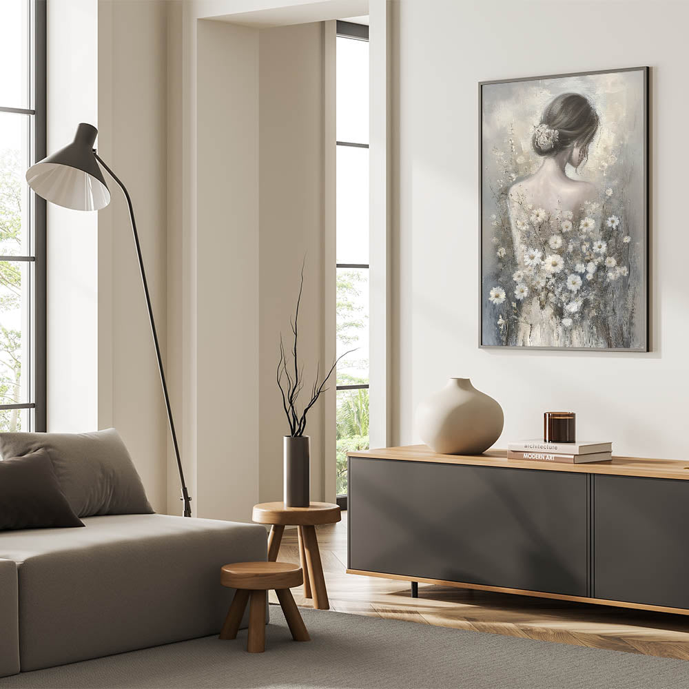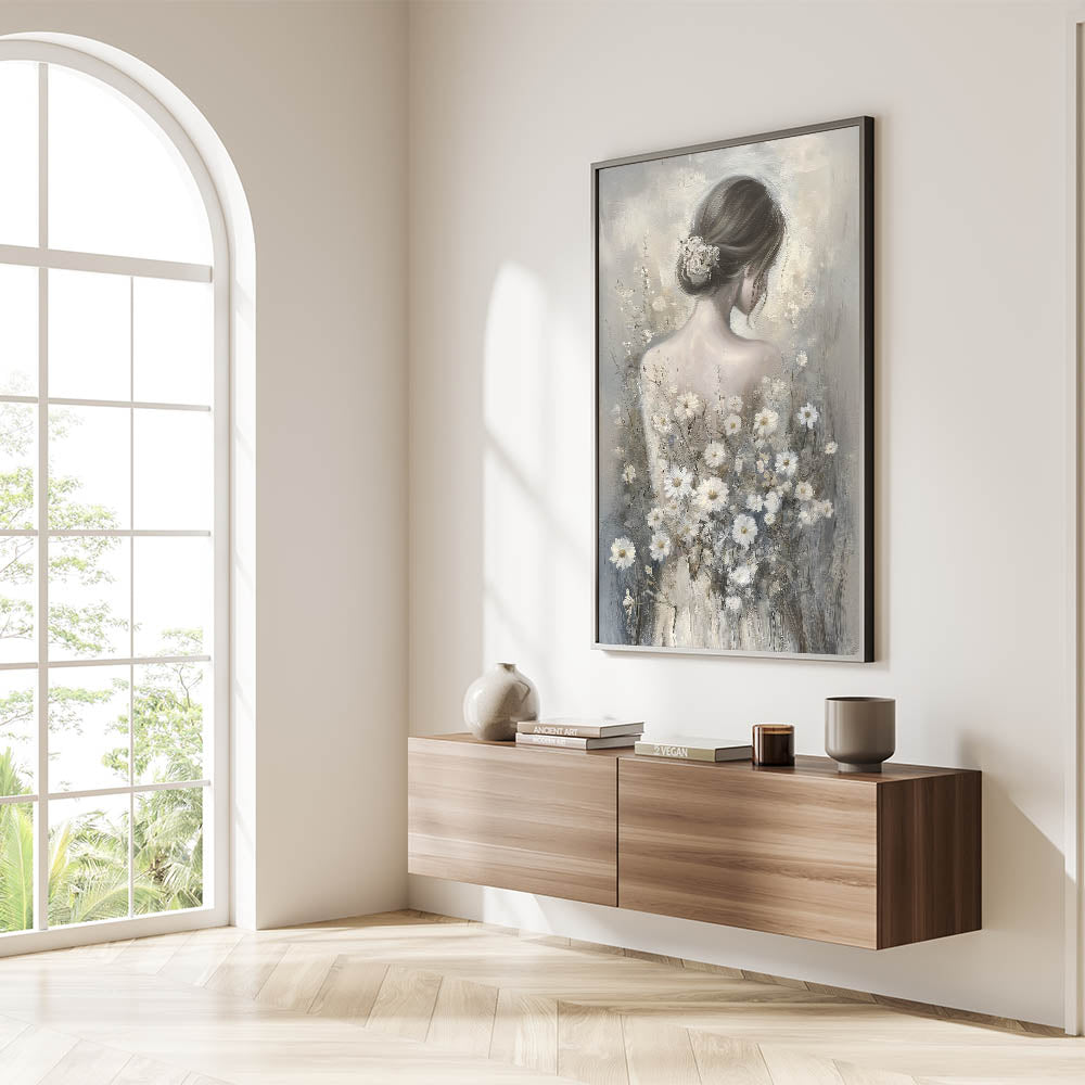 Transform your living space with this exquisite Modern Figurative Abstract Canvas. Featuring a serene depiction of a woman surrounded by delicate white florals, this artwork beautifully merges elegance and tranquility, making it a perfect addition to any modern or contemporary décor.