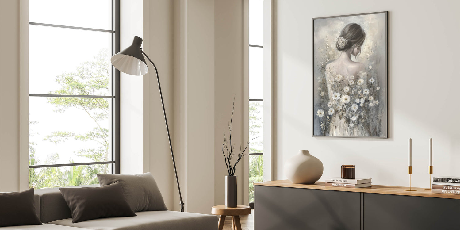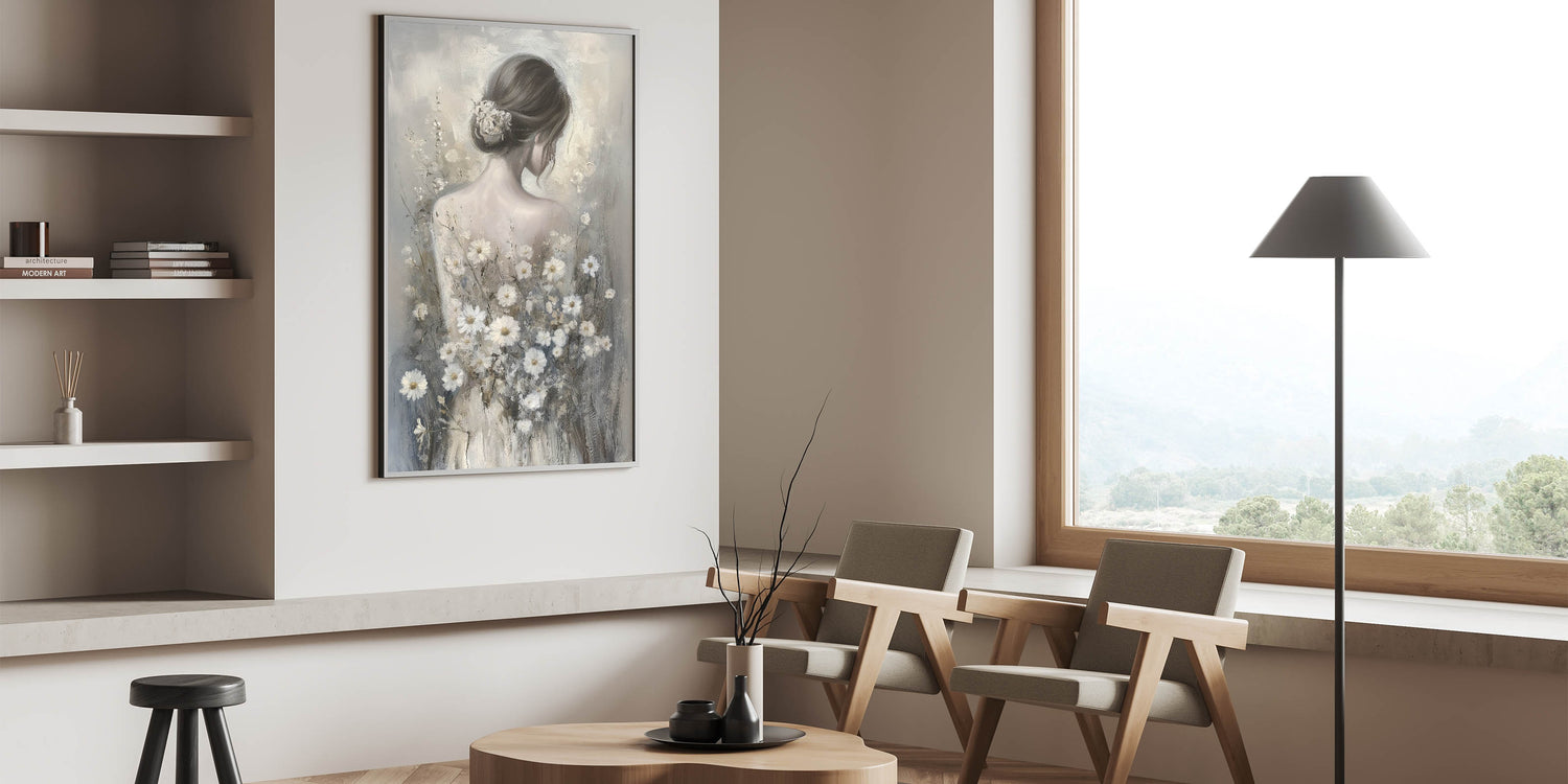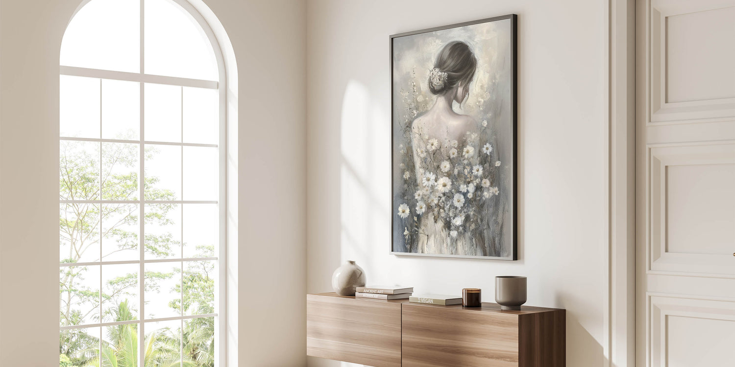 Transform your living space with this exquisite Modern Figurative Abstract Canvas. Featuring a serene depiction of a woman surrounded by delicate white florals, this artwork beautifully merges elegance and tranquility, making it a perfect addition to any modern or contemporary décor.
